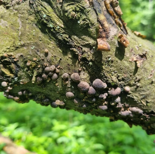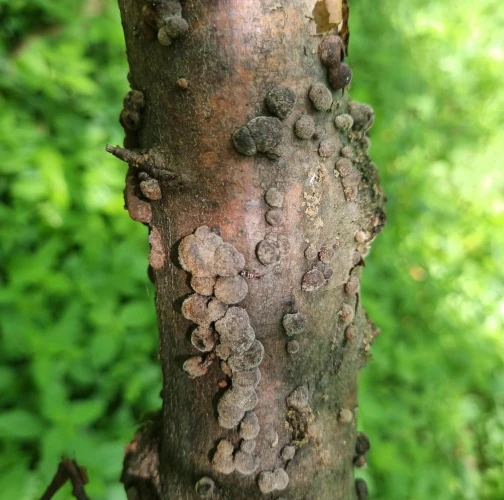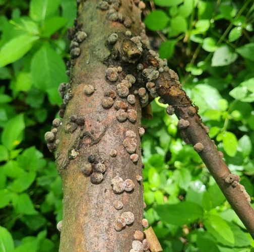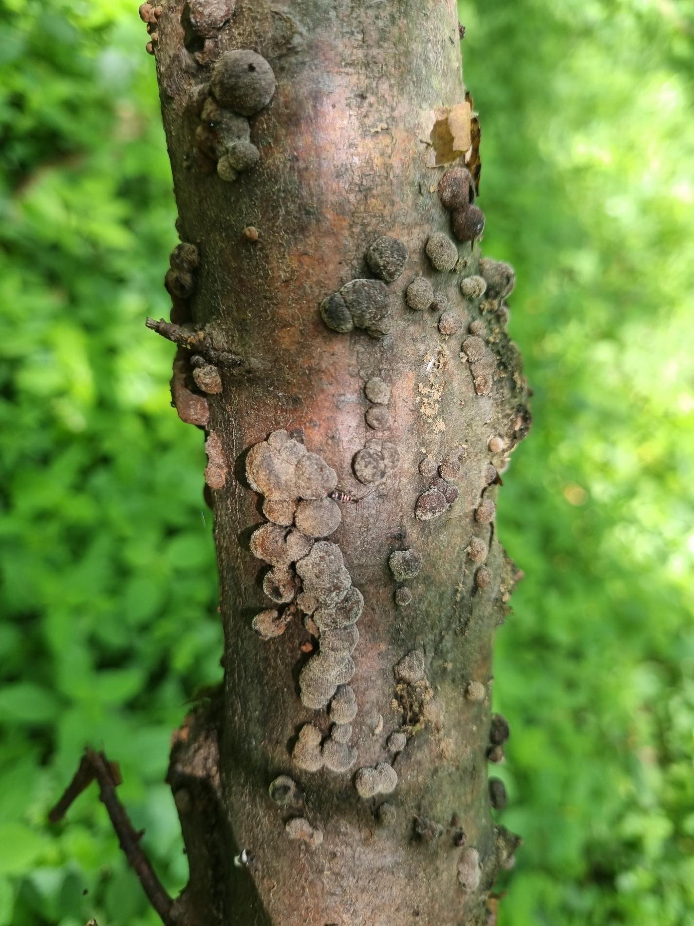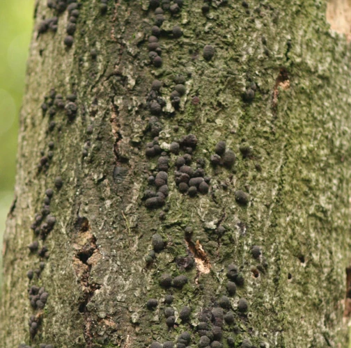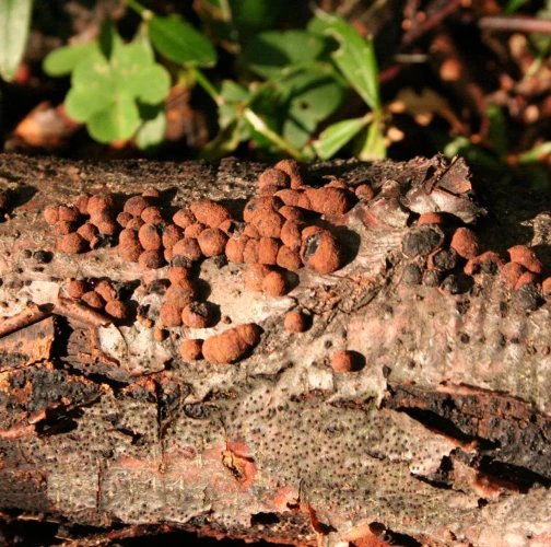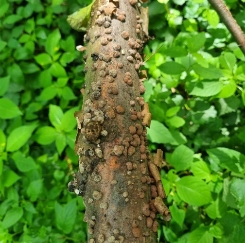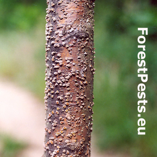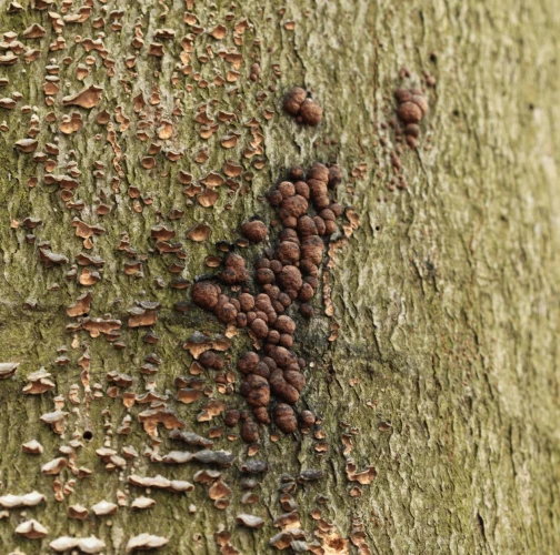Orange to black-brown bumps about 0.2-1 cm large on the trunk, mostly in large numbers.