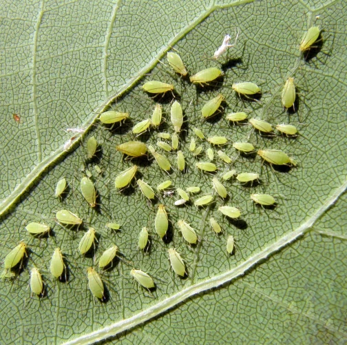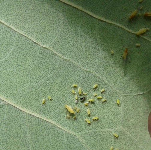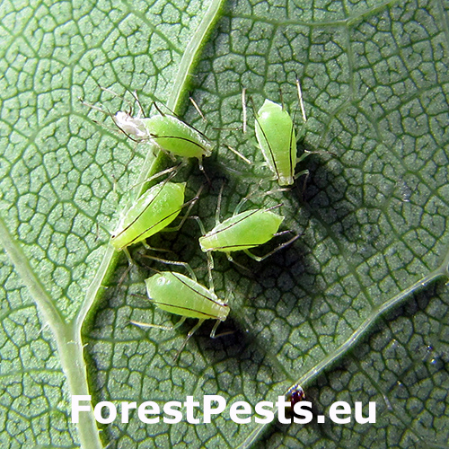 Illinoia liriodendri, commonly known as the tulip-tree aphid, is a sap-feeding insect that primarily inhabits the tulip tree (Liriodendron tulipifera). Native to North America, it was first recorded in Europe in France in 1998 and has since spread to other European countries, where it thrives in parks and gardens. The aphid exclusively feeds on the undersides of tulip tree leaves, forming dense colonies, especially during the growing season. Its life cycle begins with eggs overwintering in bark crevices, which hatch in spring as the leaves emerge. Populations increase rapidly, with viviparous females producing nymphs continuously throughout spring and summer.
