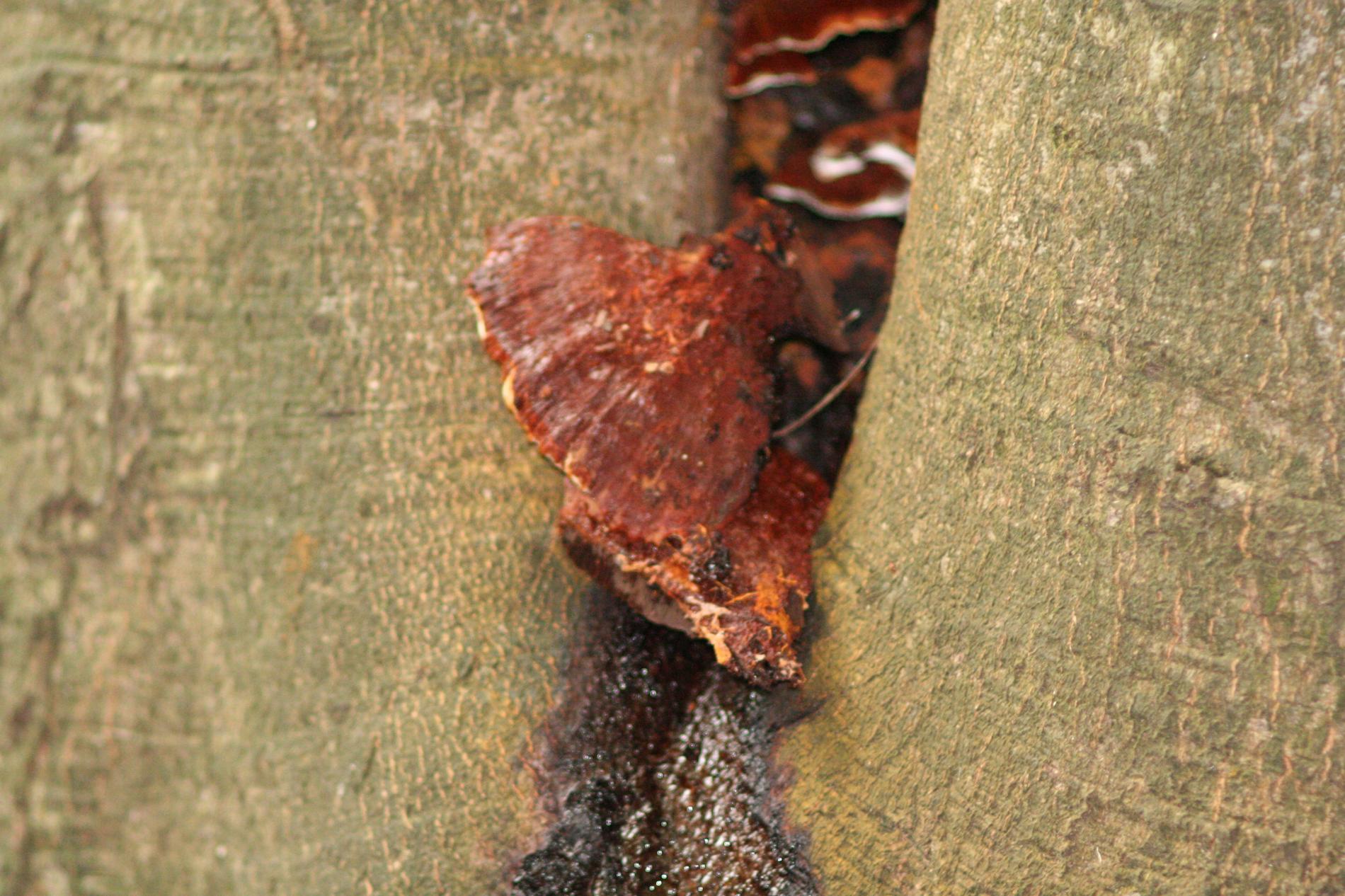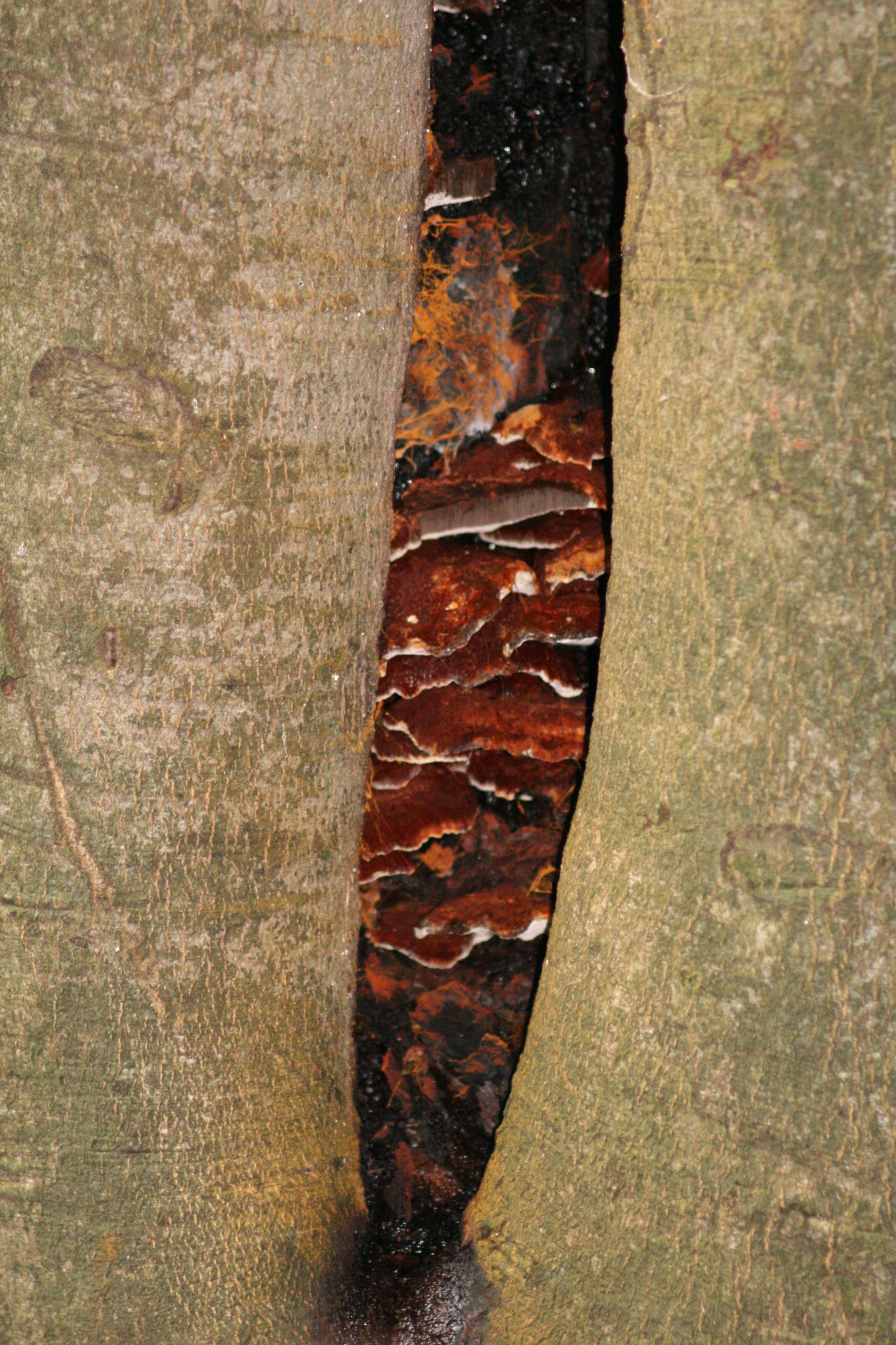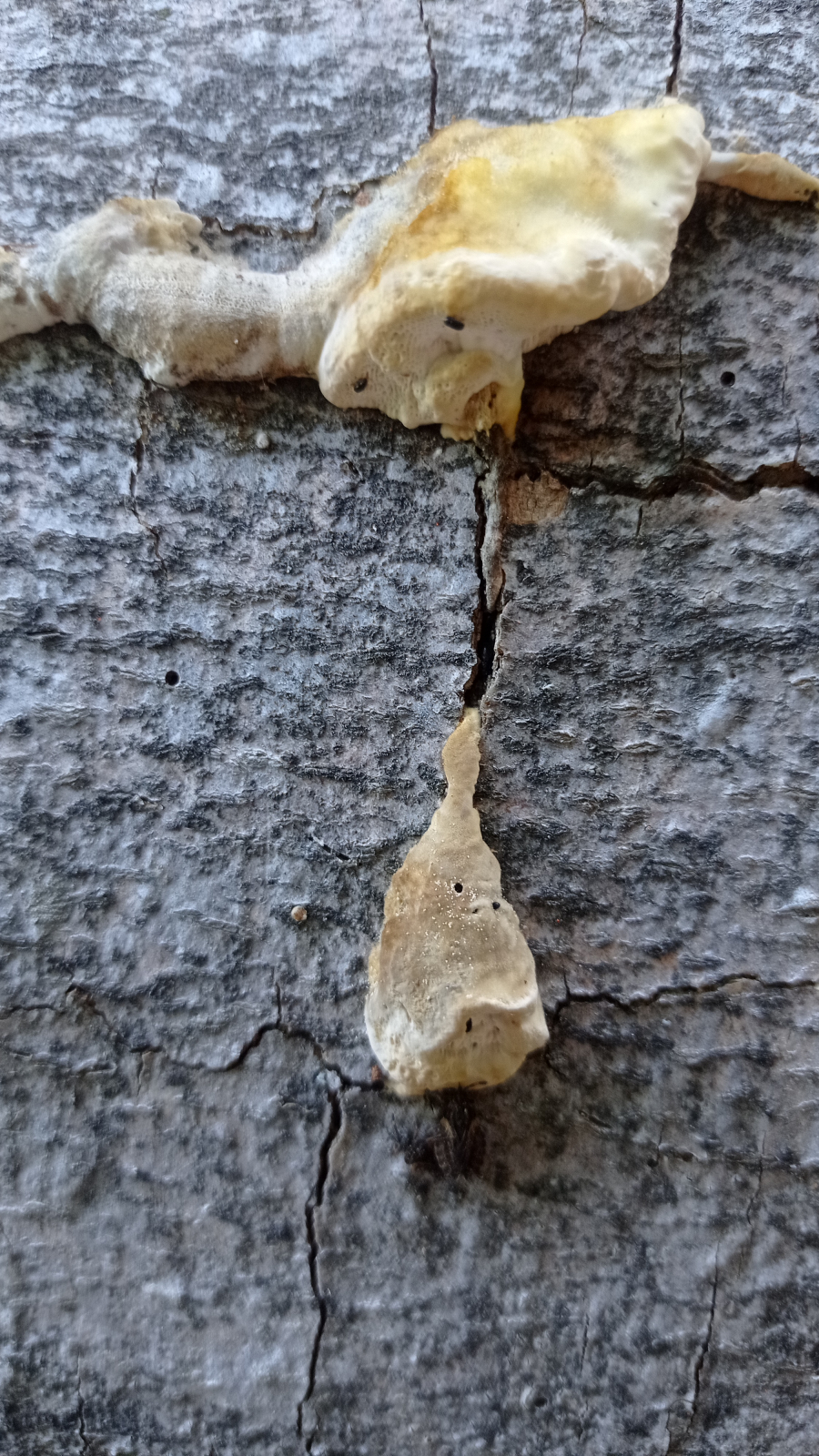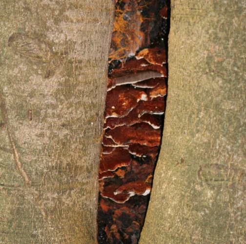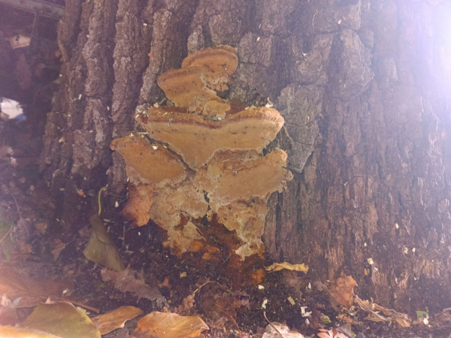 Presence of yellow-brown cantilevery fruiting bodies on the trunk.