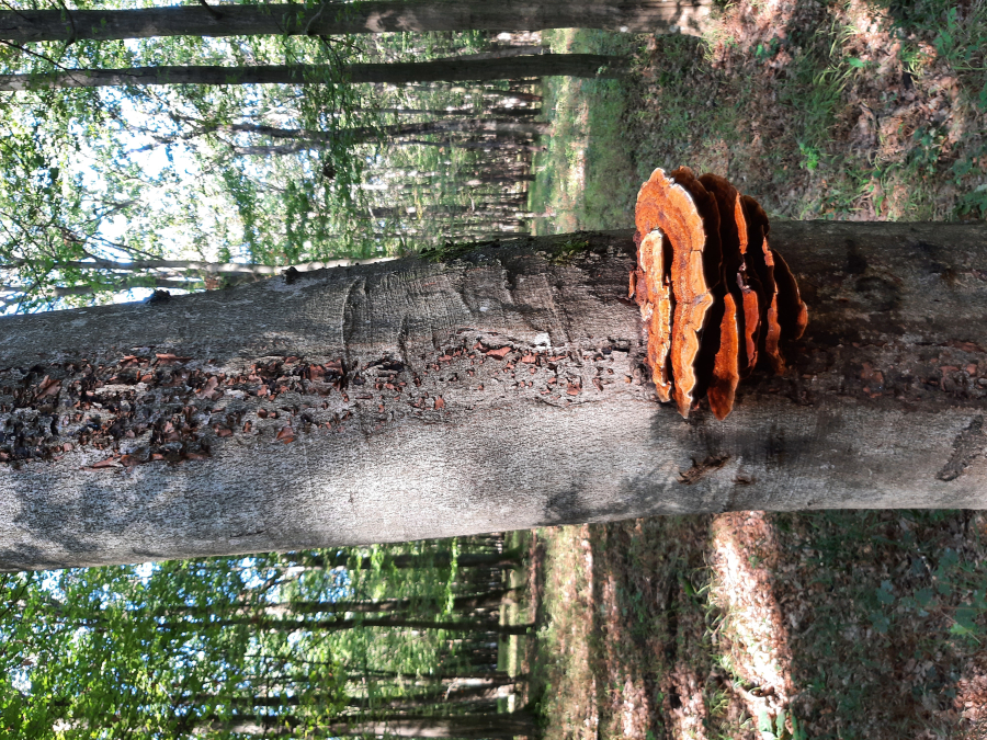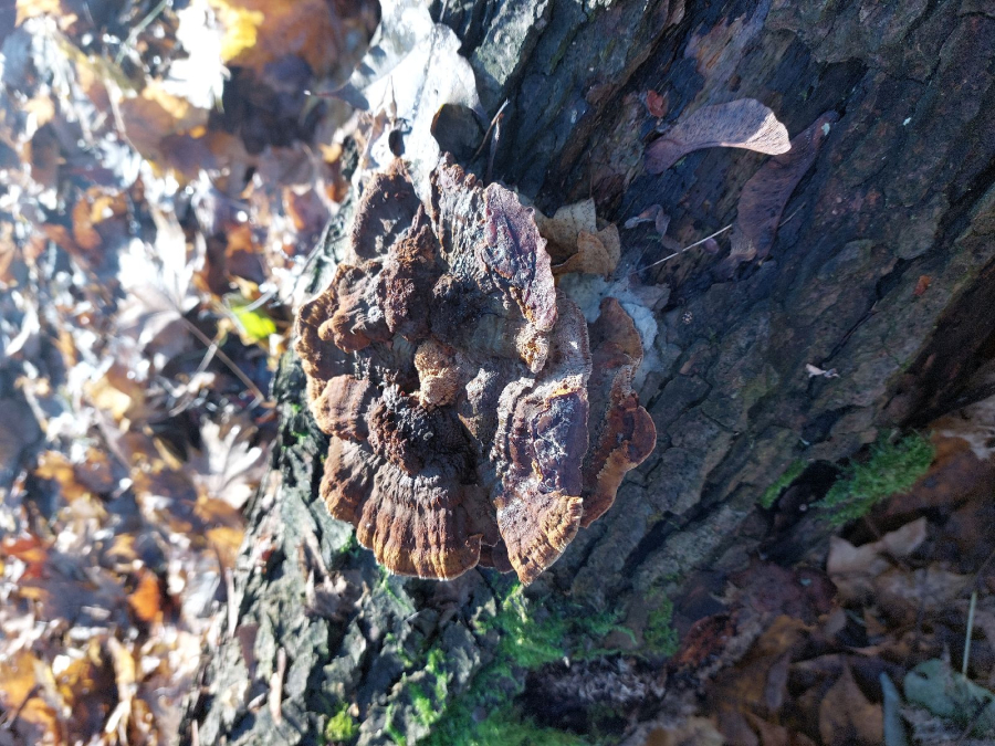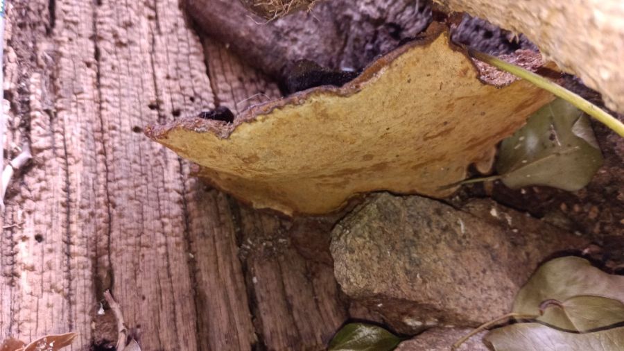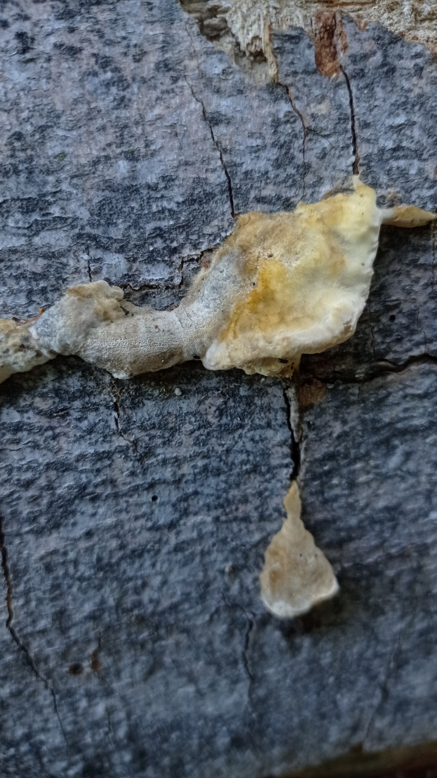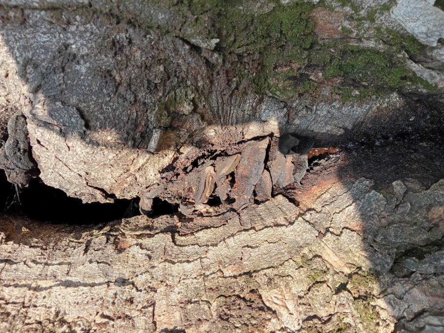 Presence of yellow-brown cantilevery fruiting bodies on the trunk.