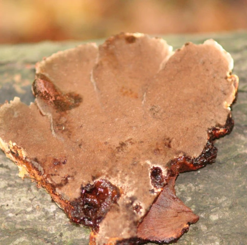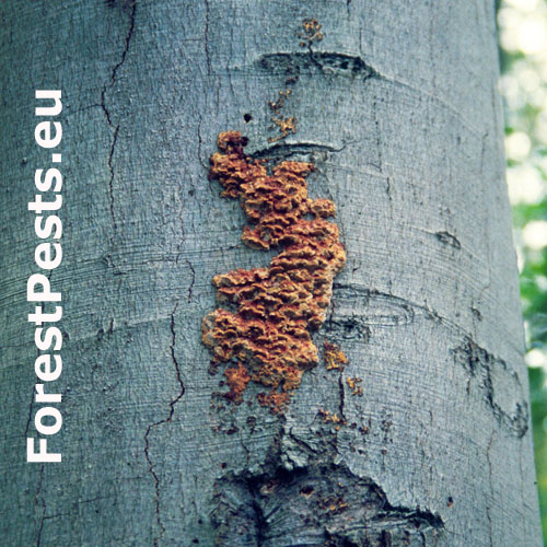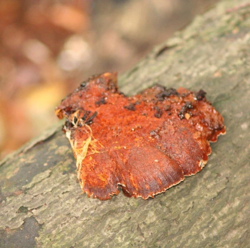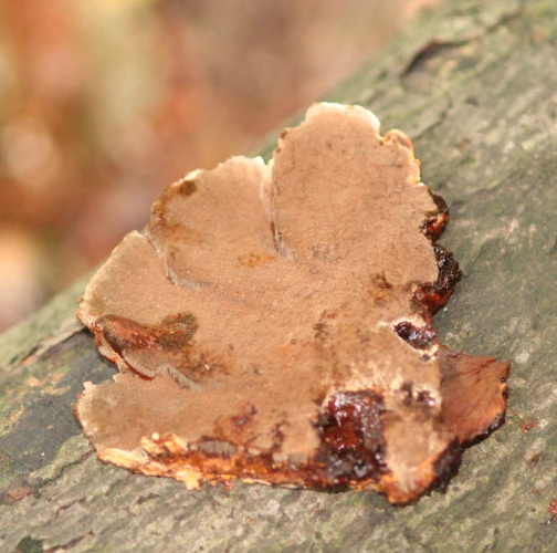 The fruiting bodies are bracket-like, without stem, they are annual, growing singly or in clusters. The surface of the fruiting body is yellowish brown, pubescent, later smooth and black, with no zones. The edge is pale and sharp. The lower side of the bracket is tubular, pale brown to grey. The fungus causes intense white rot of heartwood of broadleaved trees; however, it lives predominantly as a saprophyte on already dead trees. It penetrates into the trunk through wounds. The fungus is widespread all over Europe, less common in northern parts.
