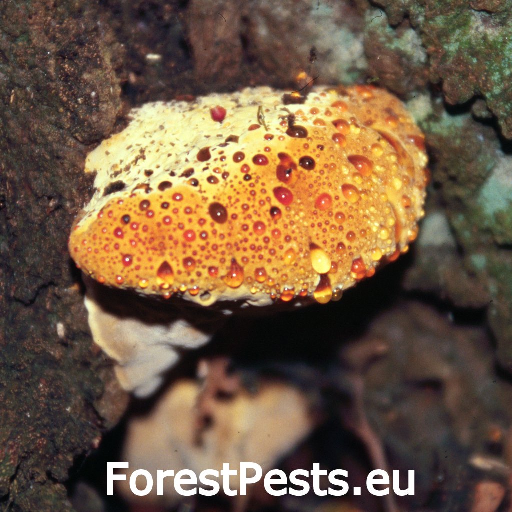 The fungus forms annual, relatively massive fruiting bodies on the stumps of living trees, frequently growing close to the ground. The surface of the fruiting body is leathery, brown to dark brown, and pubescent to felt-like. The border of the fruiting body is ocher to white. The pores are pale yellow, and the entire fruiting body turns darker with age. Drops of yellowish-brown liquid form on the surface of fruiting bodies and pores. The fungus causes white heartwood rot on the roots and lower parts of the trunk, but it does not reach the upper parts of the trunk.