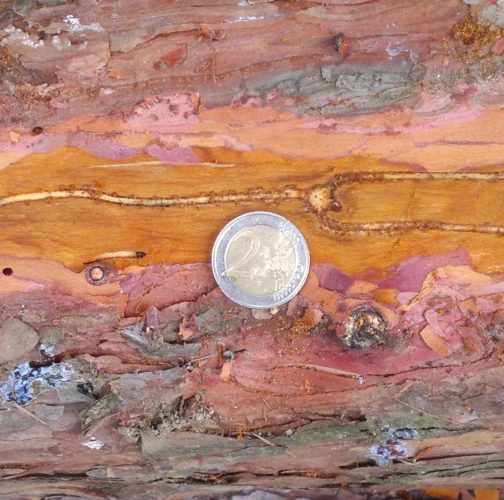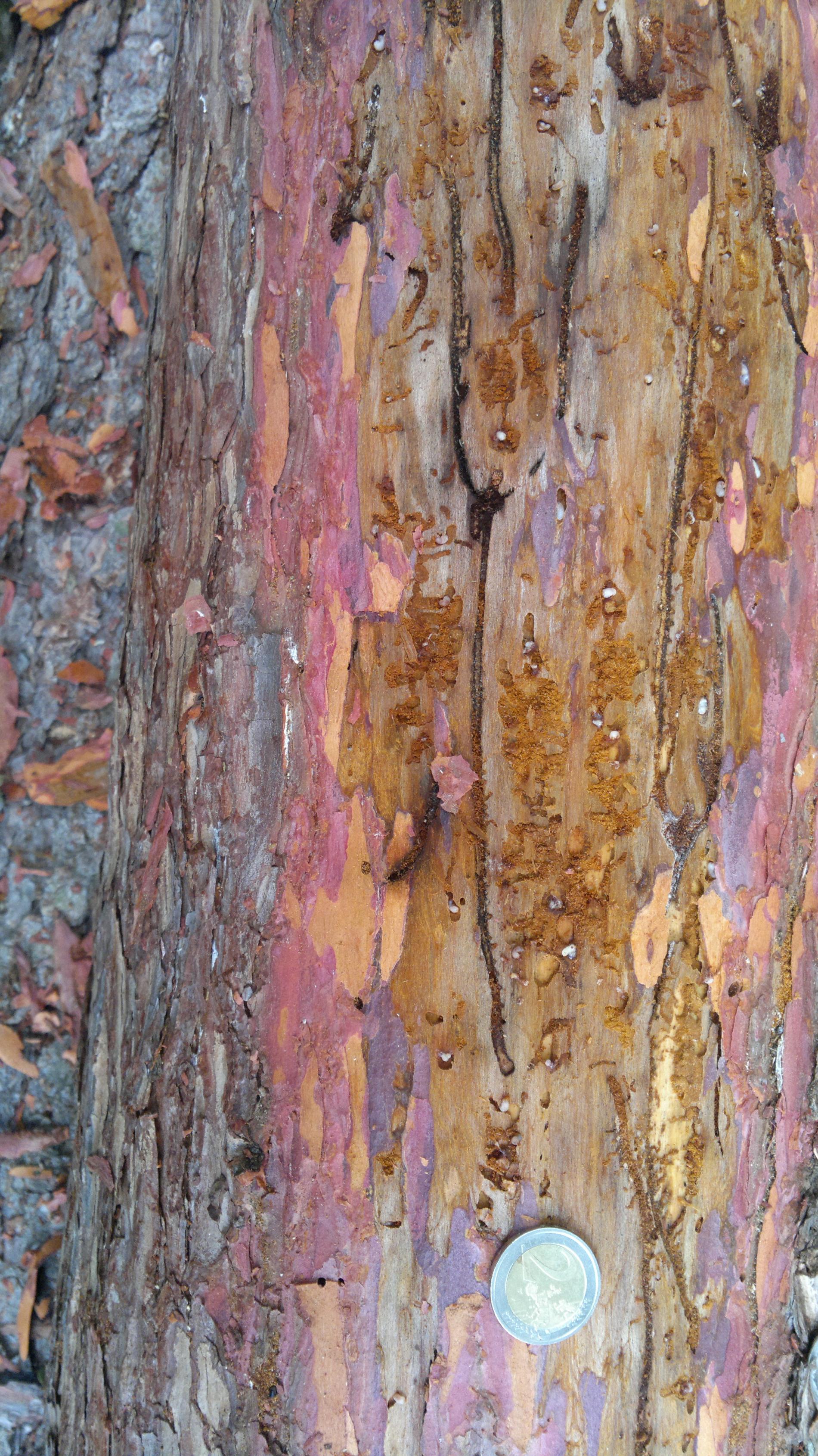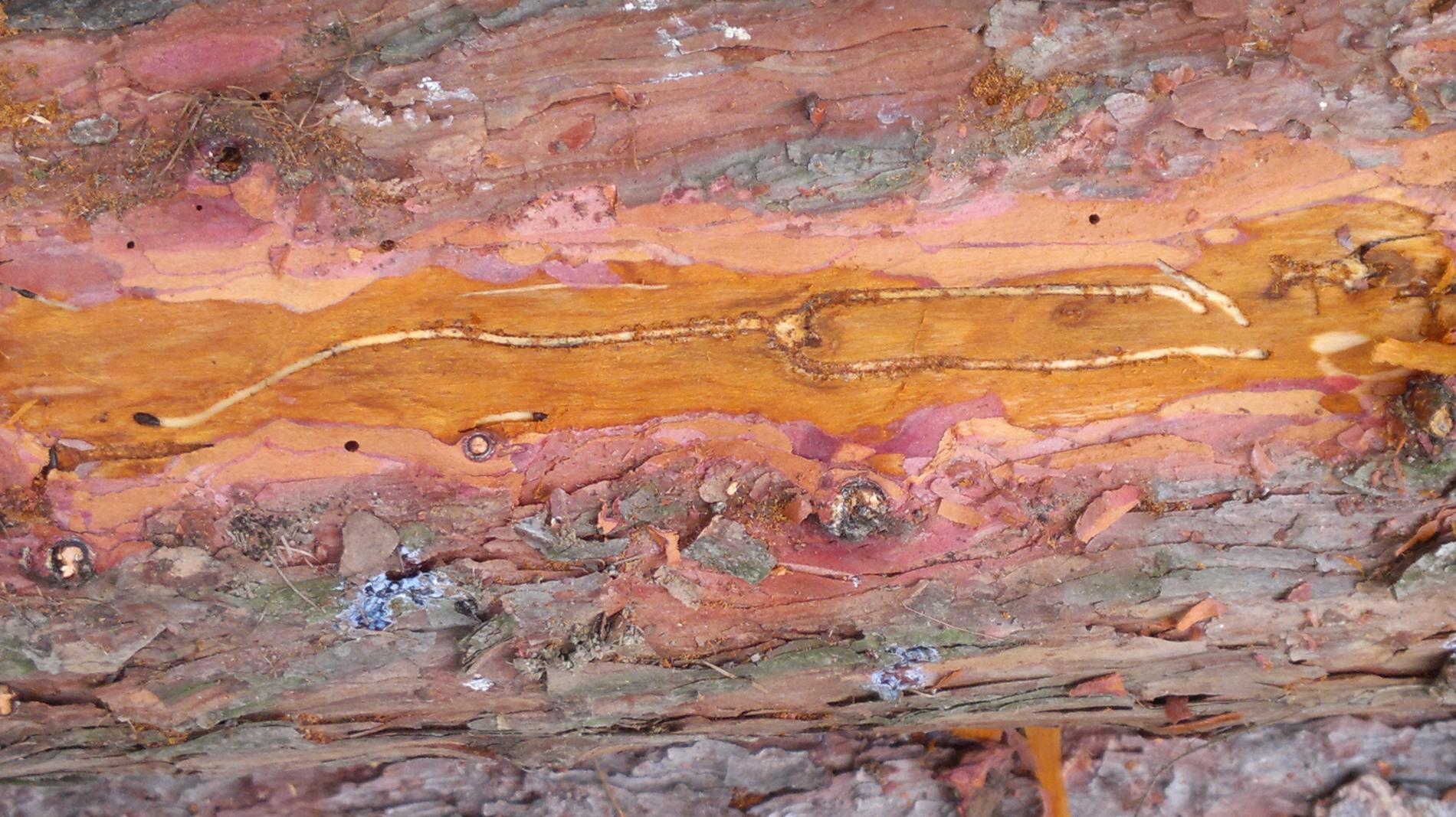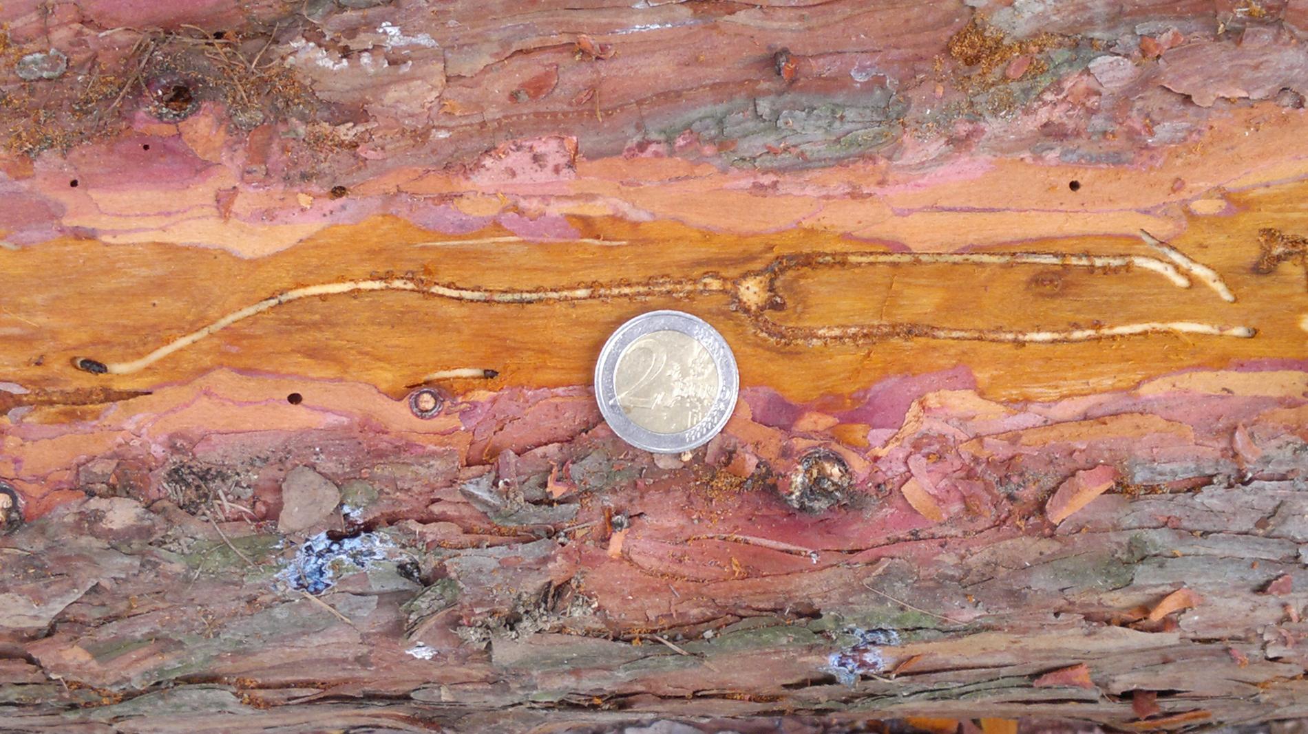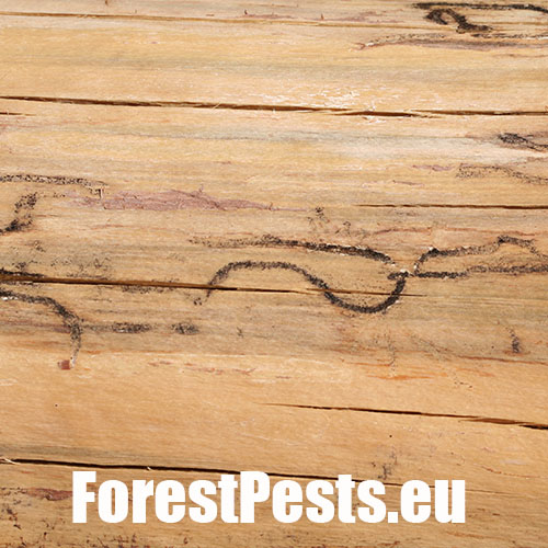 Maternal galleries are irregular, longer than 10-12 cm. Larval galleries are dense, irregular and short.