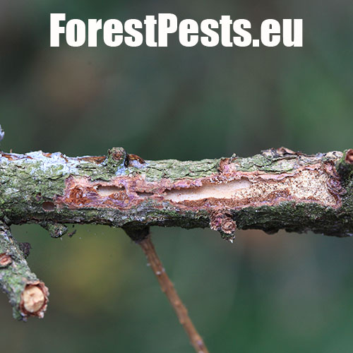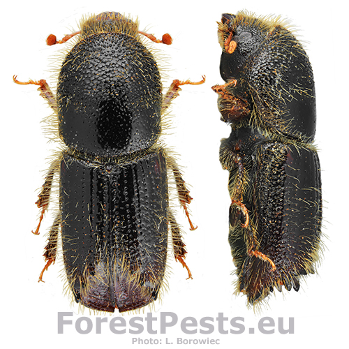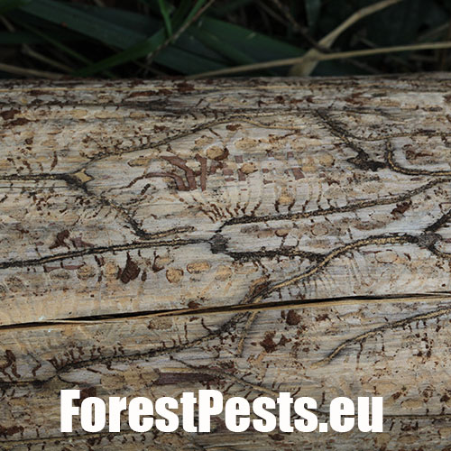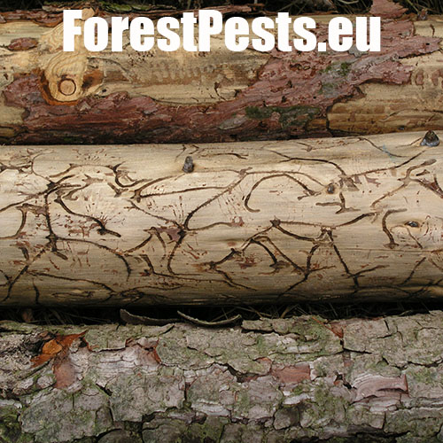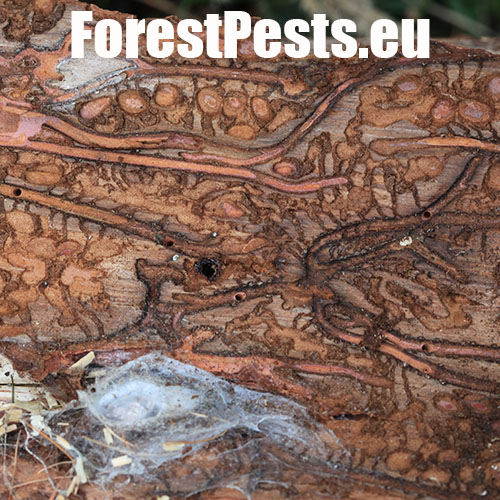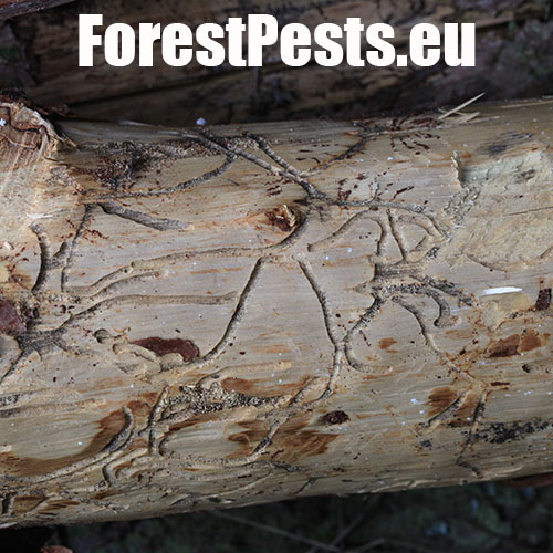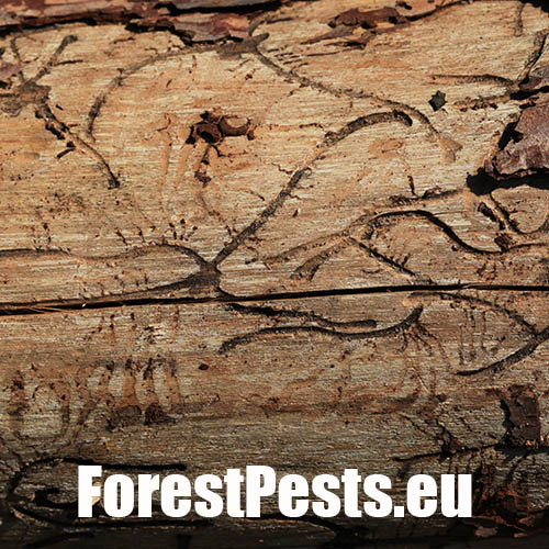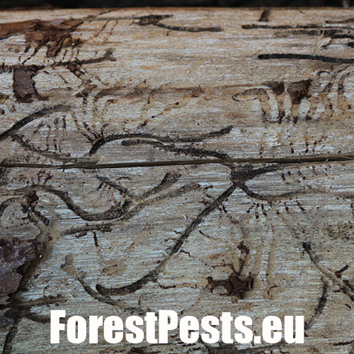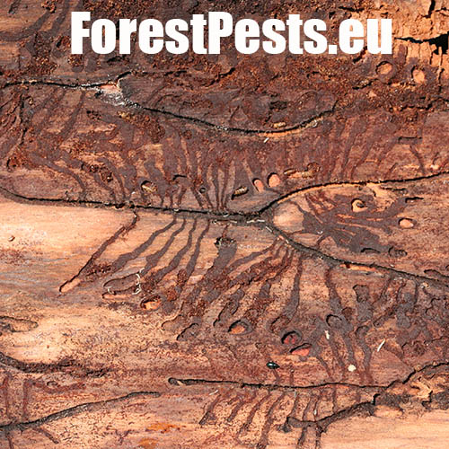 The adult’s body is cylindrical, 4.0-5.5 mm long, of brown-black colour. The first generation is active in April-May, and the second one in August-September. The male bores the nuptial chamber, where mates with 2 up to 5 females. Maternal galleries are irregular, longer than 10-12 cm. Larval galleries are dense, irregular and short. Larvae pupate in the bark and sapwood. After hatching, young adults have a maturation feeding in 1-3 year old shoots in the crowns of older larches, causing a severe defoliation. With a physiology rather similar to the spruce bark beetle, it is a polygamous species prefers larch. It attacks weakened or wind broken trees. Tends to outbreaks. Several other bark beetles species live on larch, including Cryphalus intermedius, C. abietis, C. saltuarius, Xyloterus lineatus and Pityophthorus pityographus.
