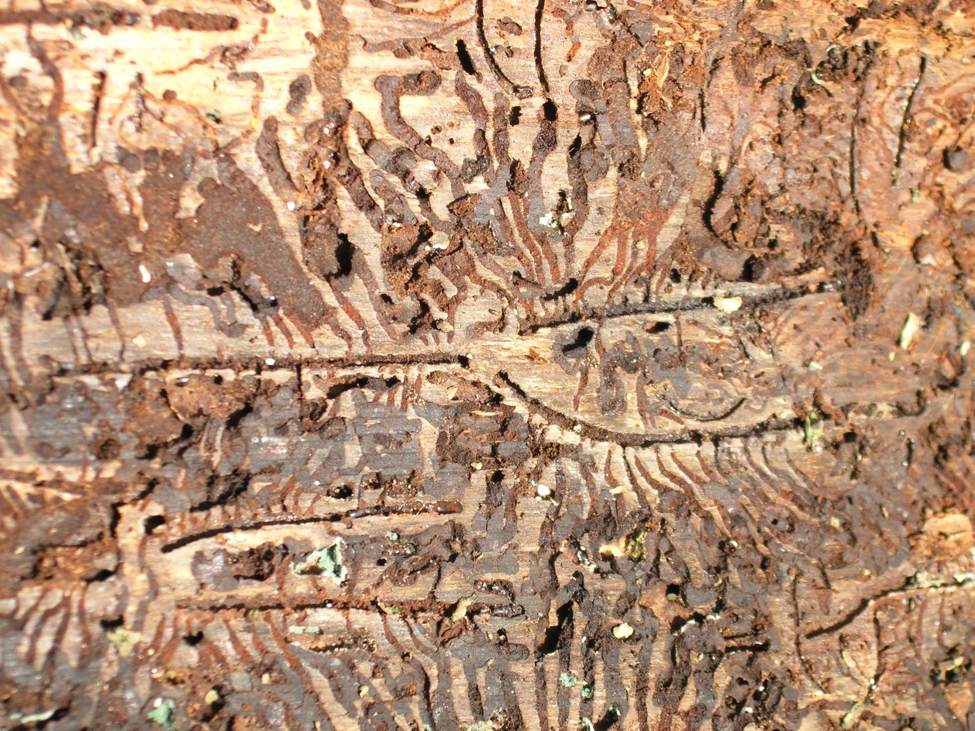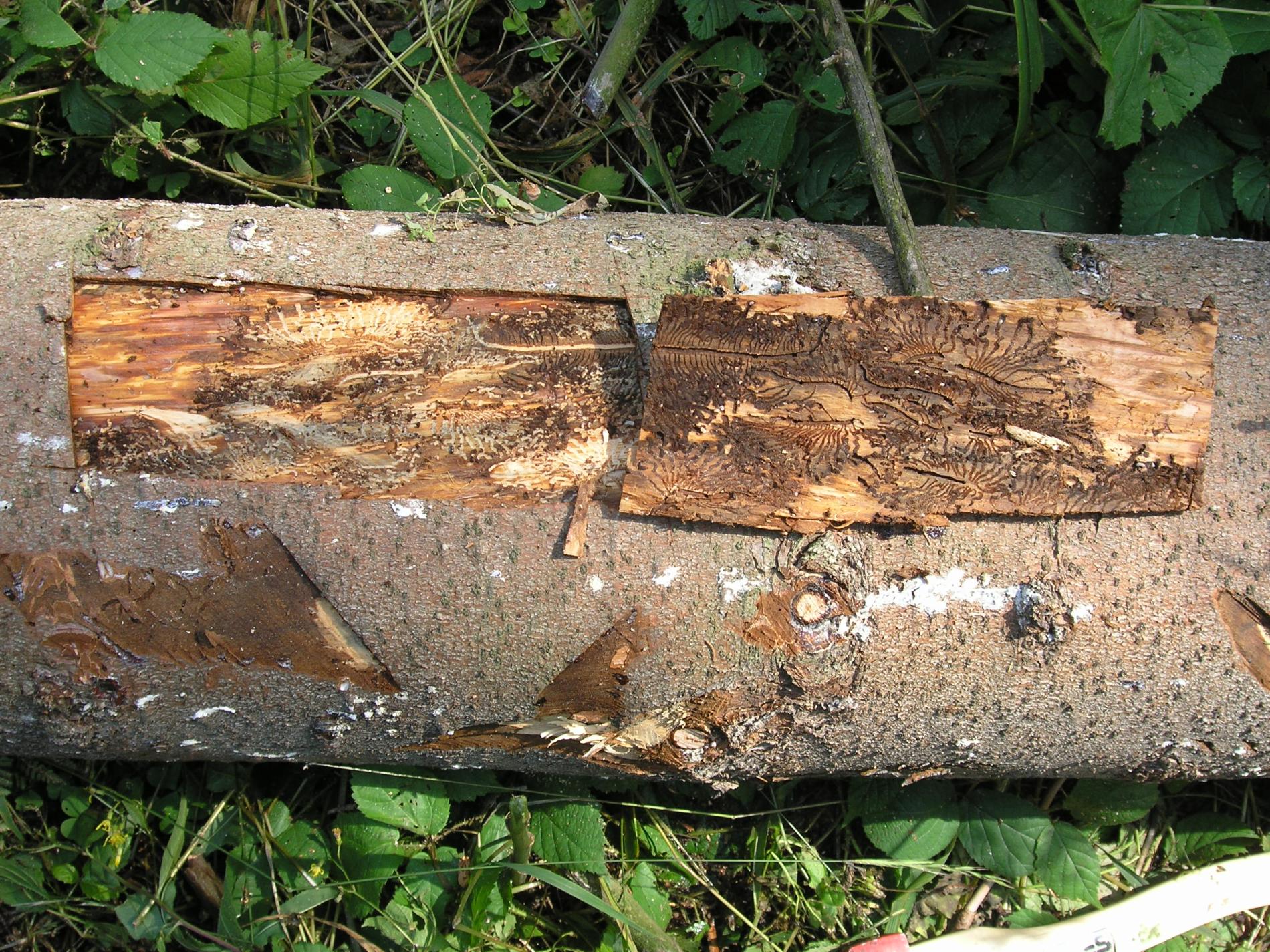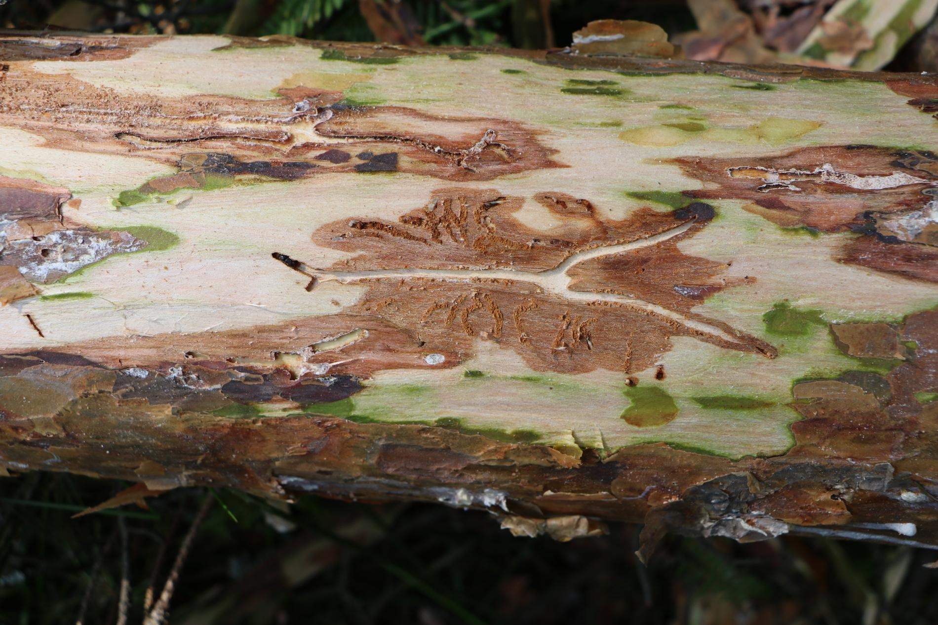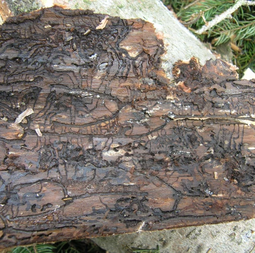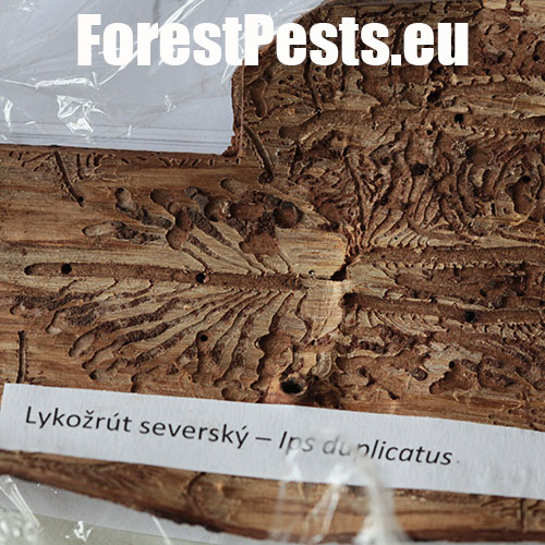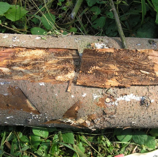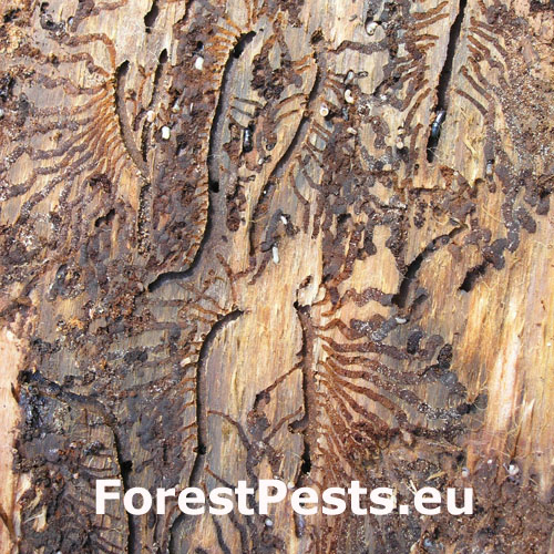 The galleries are similar to those of the eight-toothed spruce bark beetle, with the maternal tunnels shorter and slightly narrower. There are normally 2 or 3 of them, slightly forking away on the two-gallery side. Galleries are usually found in standing trees, rather than logs, and in the upper part of trees where the bark is relatively thin and where I. typographus has colonized the lower section.