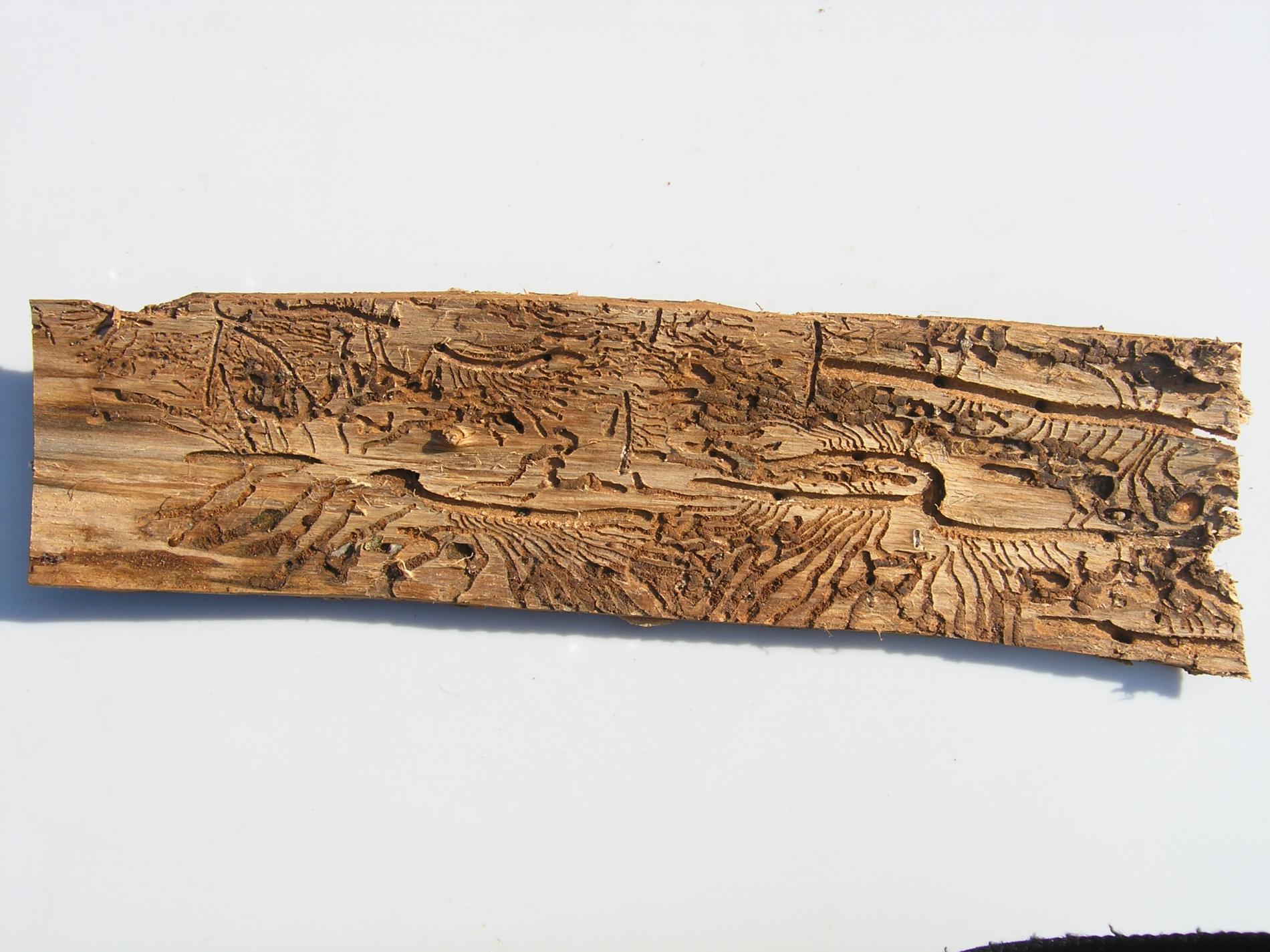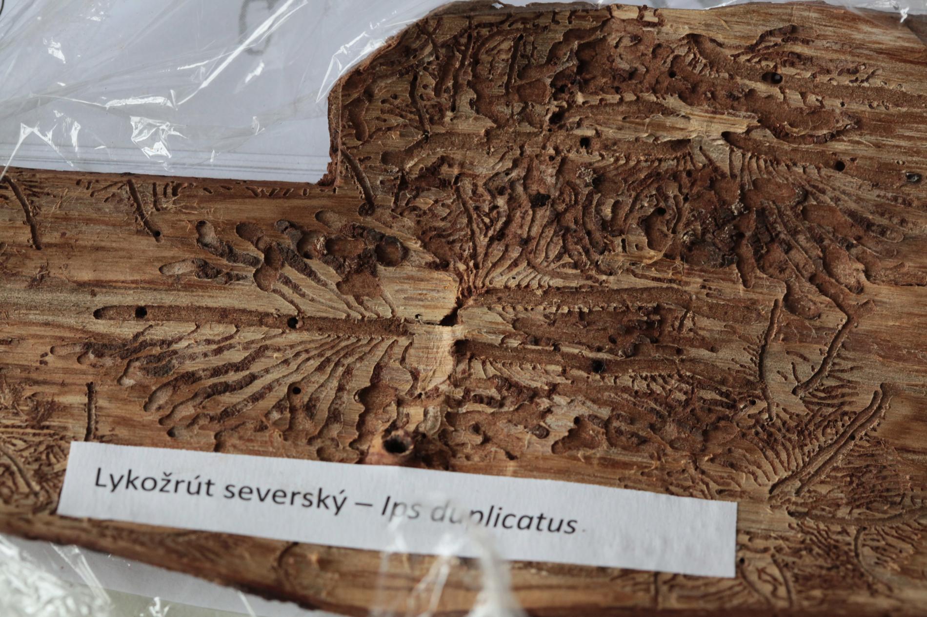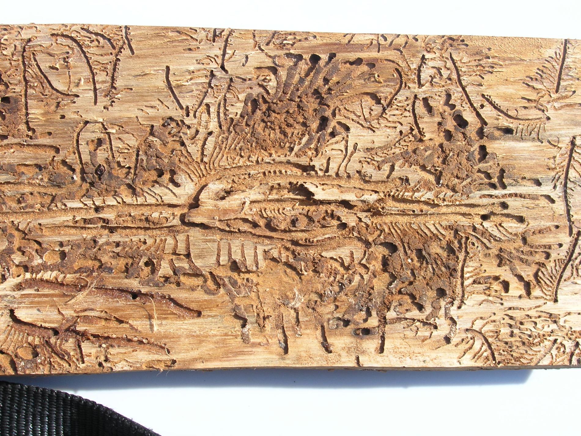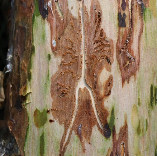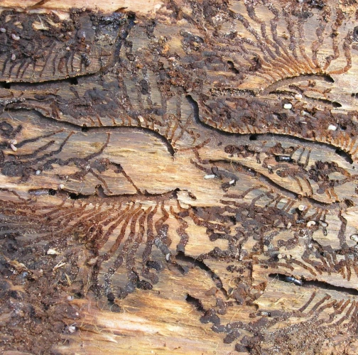 The galleries are similar to those of the eight-toothed spruce bark beetle, with the maternal tunnels shorter and slightly narrower. There are normally 2 or 3 of them, slightly forking away on the two-gallery side. Galleries are usually found in standing trees, rather than logs, and in the upper part of trees where the bark is relatively thin and where I. typographus has colonized the lower section.