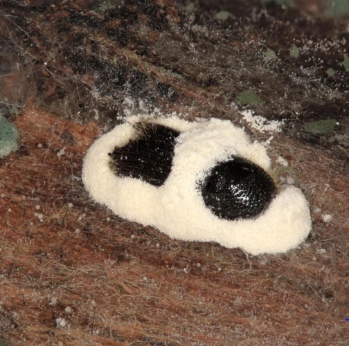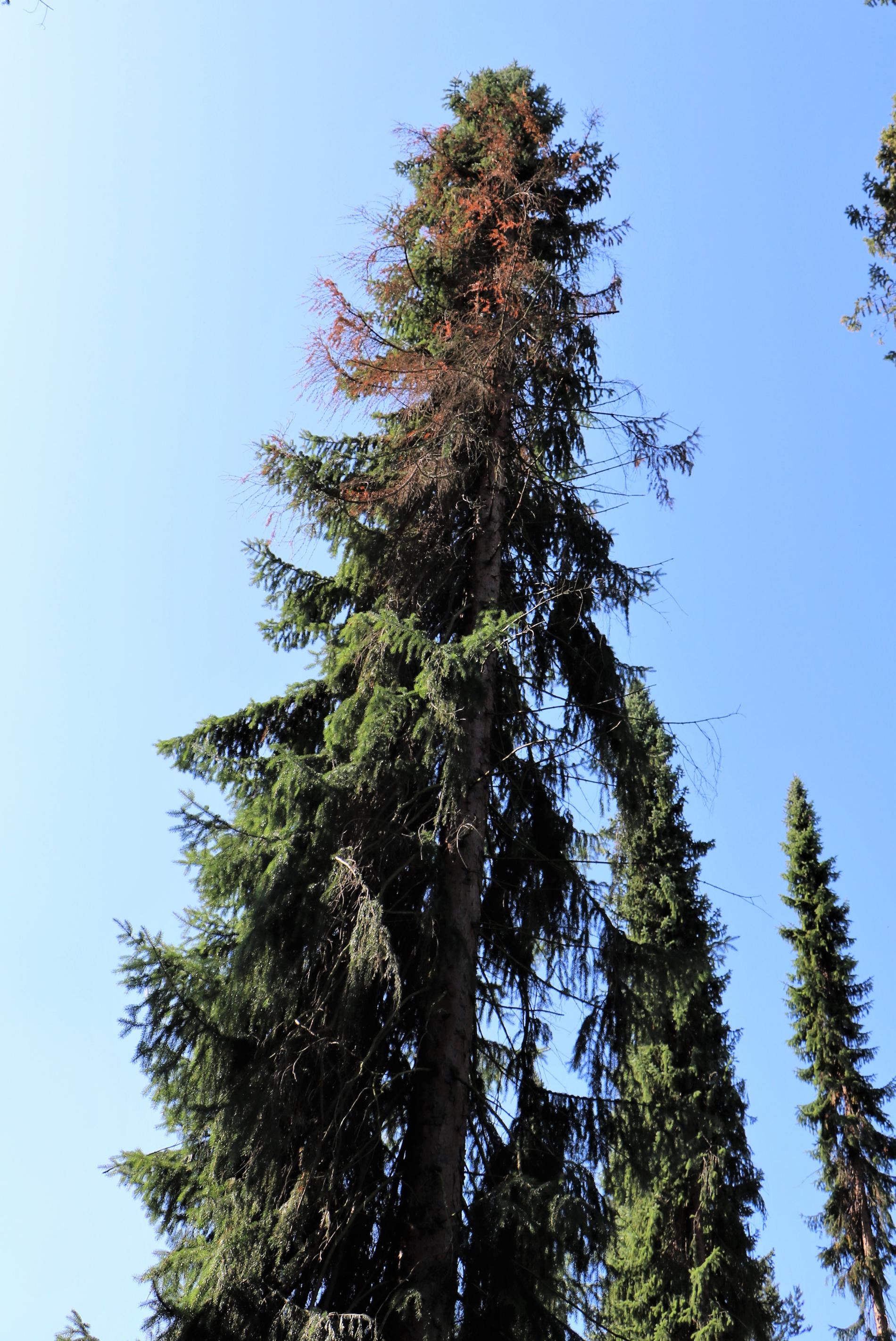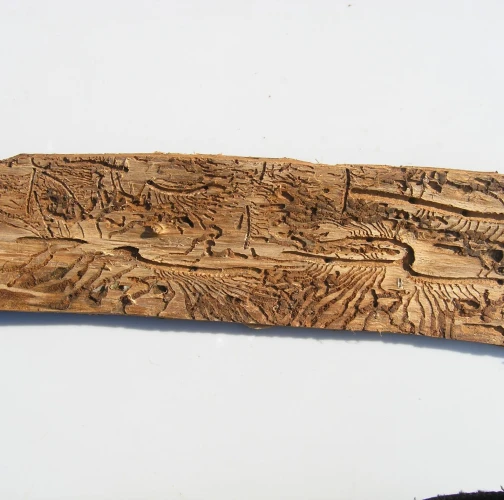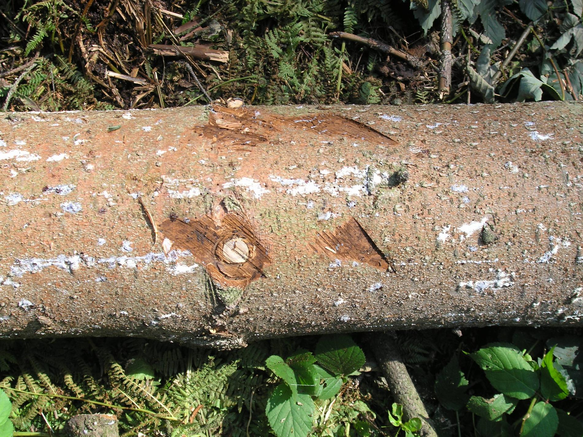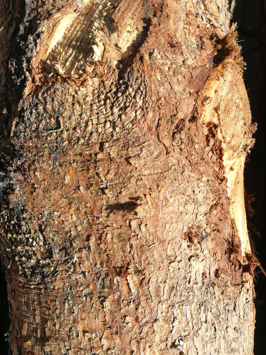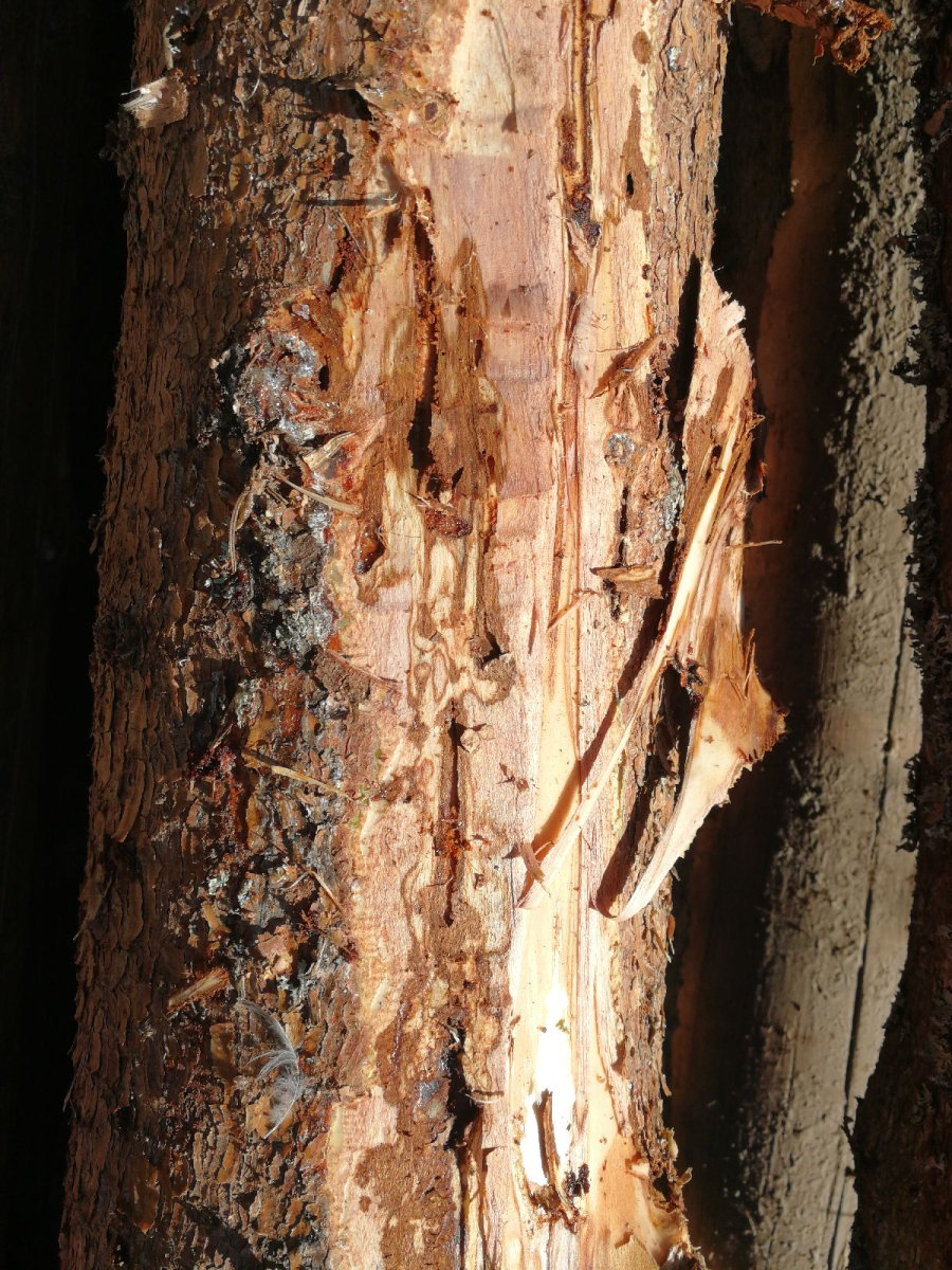 The galleries are similar to those of the eight-toothed spruce bark beetle, with the maternal tunnels shorter and slightly narrower. There are normally 2 or 3 of them, slightly forking away on the two-gallery side. Galleries are usually found in standing trees, rather than logs, and in the upper part of trees where the bark is relatively thin and where I. typographus has colonized the lower section.