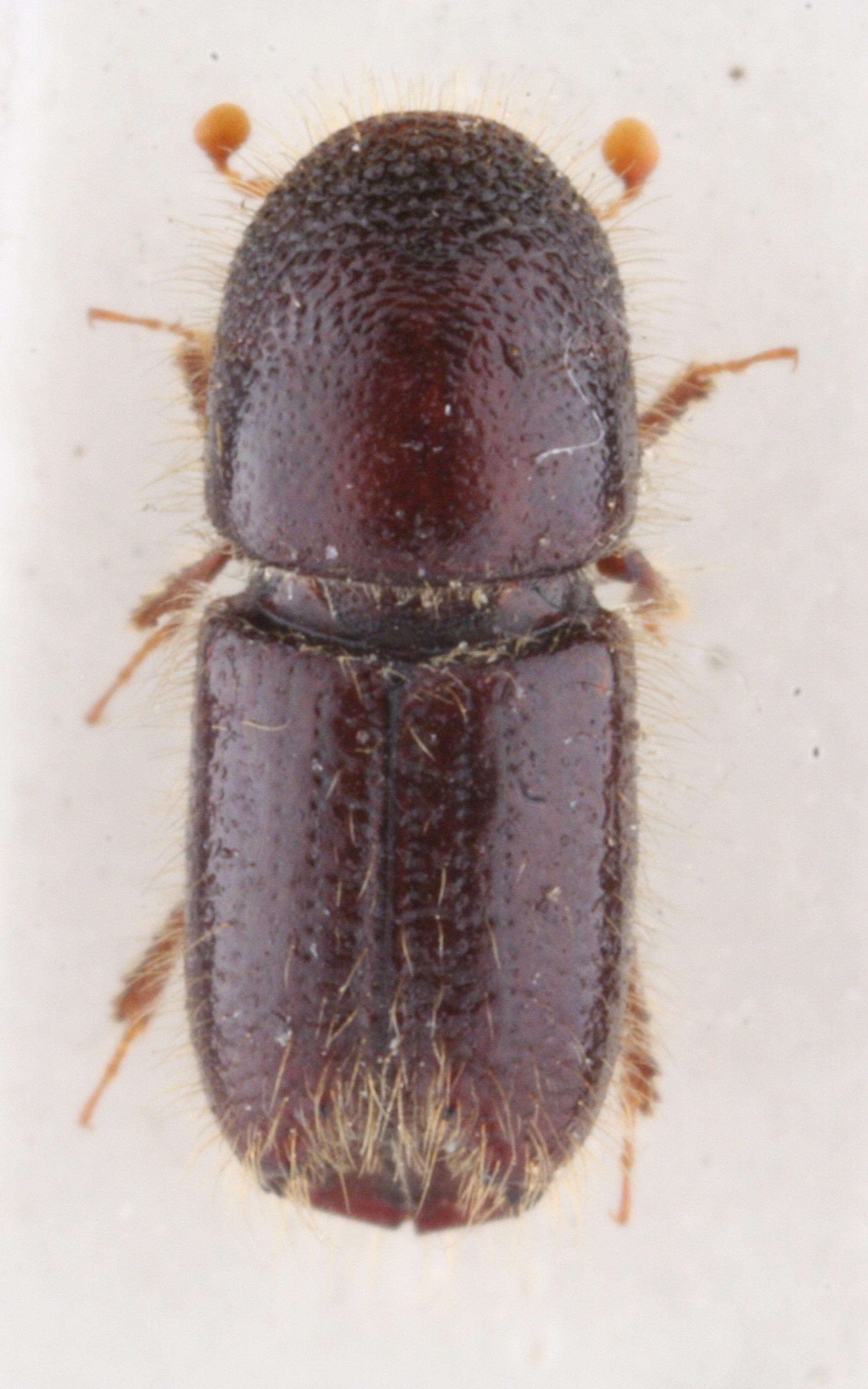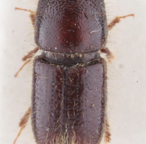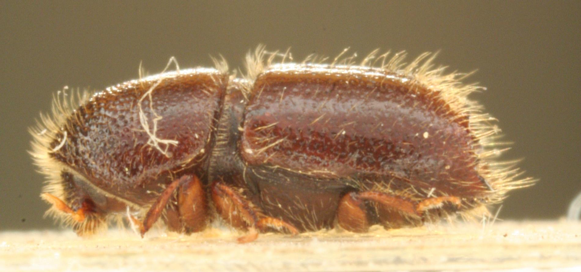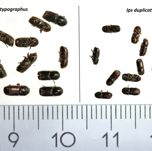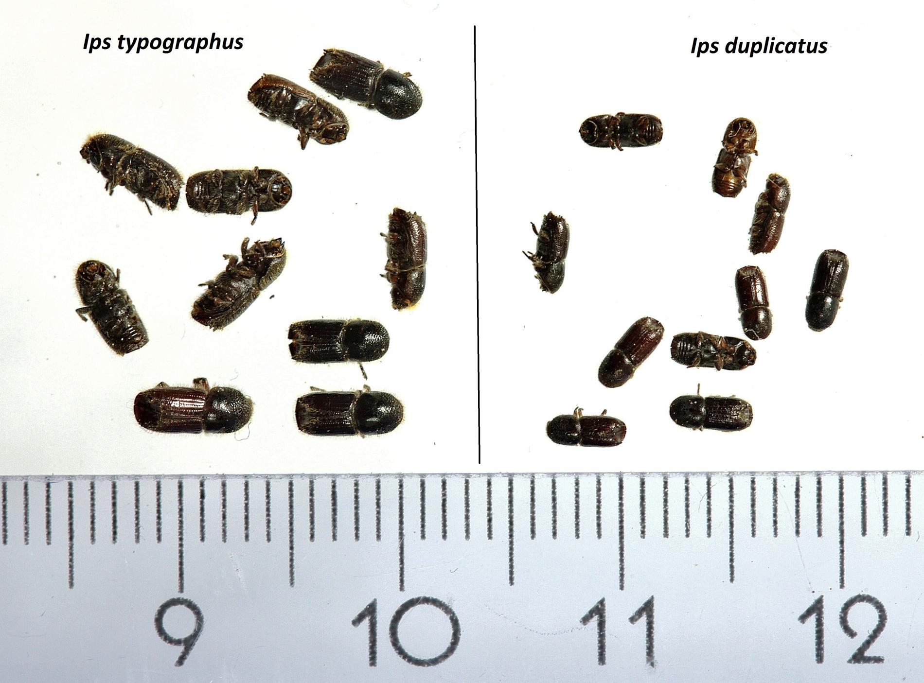 Beetles are 3.3-4.4 mm in length, dark-brown, with four spines at each side of the elytral declivity. The second and third spines arise from a tumescence which forms an arcuate ridge between them. This is most distinct in the male where the third spine is the largest and is capitate. Overwinters in the adult stage, less commonly also as a pupa or larva. Flight takes place in May. The galleries are similar to those of the eight-toothed spruce bark beetle, with the maternal tunnels shorter and slightly narrower. There are normally 2 or 3 of them, slightly forking away on the two-gallery side. Galleries are usually found in standing trees, rather than logs, and in the upper part of trees where the bark is relatively thin and where I. typographus has colonized the lower section. Its presence doesn’t extend to higher altitudes (above 800 m). The species spreads from northern (where is more common) areas into the south during last 10 years.