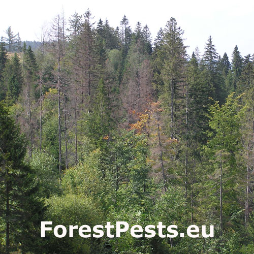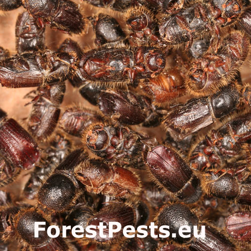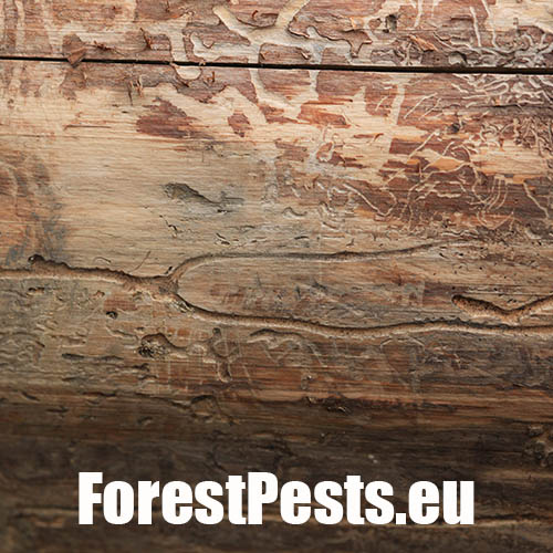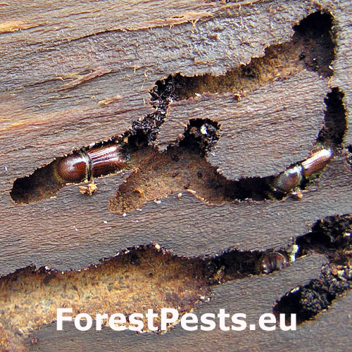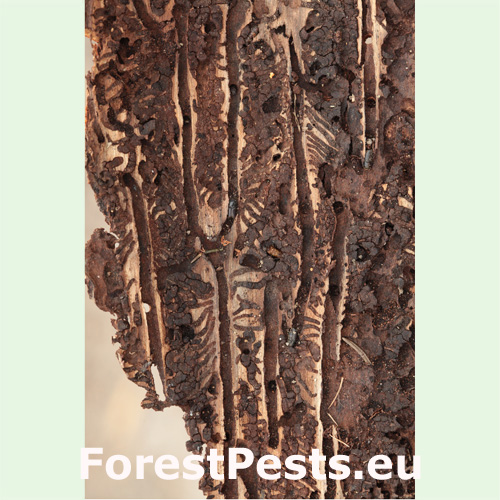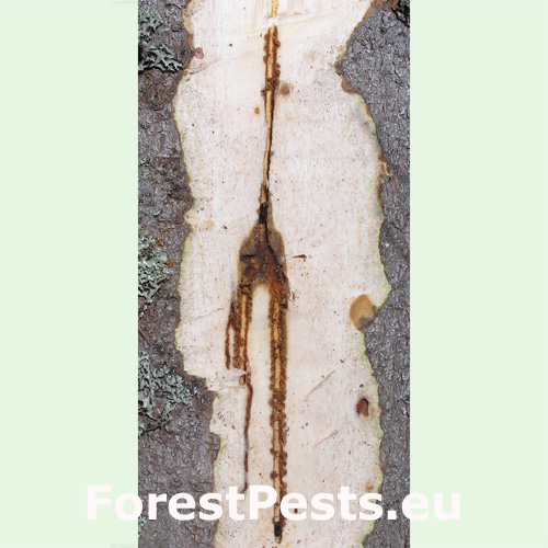 6–12 cm long maternal gallery in the phloem parallel with the trunk axis. Attacked trees are easy to recognize by brown dust coming out of the bark and concentrating at the basal parts of stems.