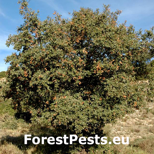 Kermes vermilio is a scale insect belonging to the family Kermesidae, which primarily infests oak trees (Quercus spp.). Females attach to branches and form globular, dark red to brown protective coverings with a fine wax layer. The species has a monophagous preference for oaks, particularly Quercus coccifera, Q. ilex, Q. rotundifolia, and Q. suber. It is found in Mediterranean regions of Europe. The insects feed by sucking sap from the branches, which may weaken the host tree. In high densities, they can contribute to branch dieback and reduce the tree’s overall vitality and aesthetic value.