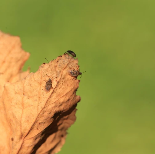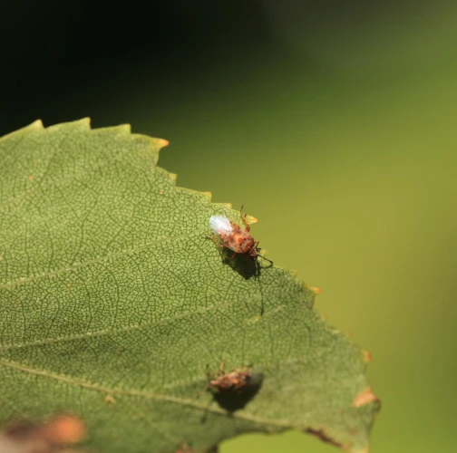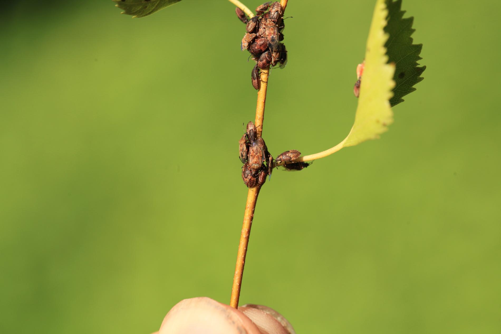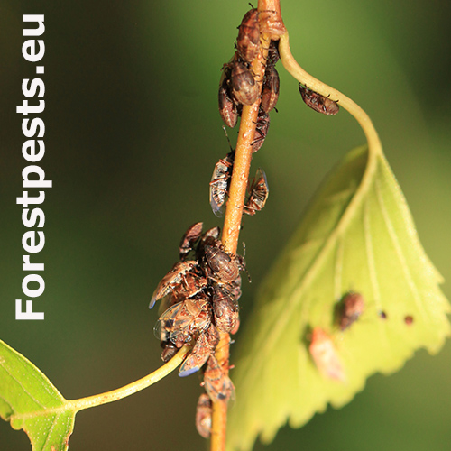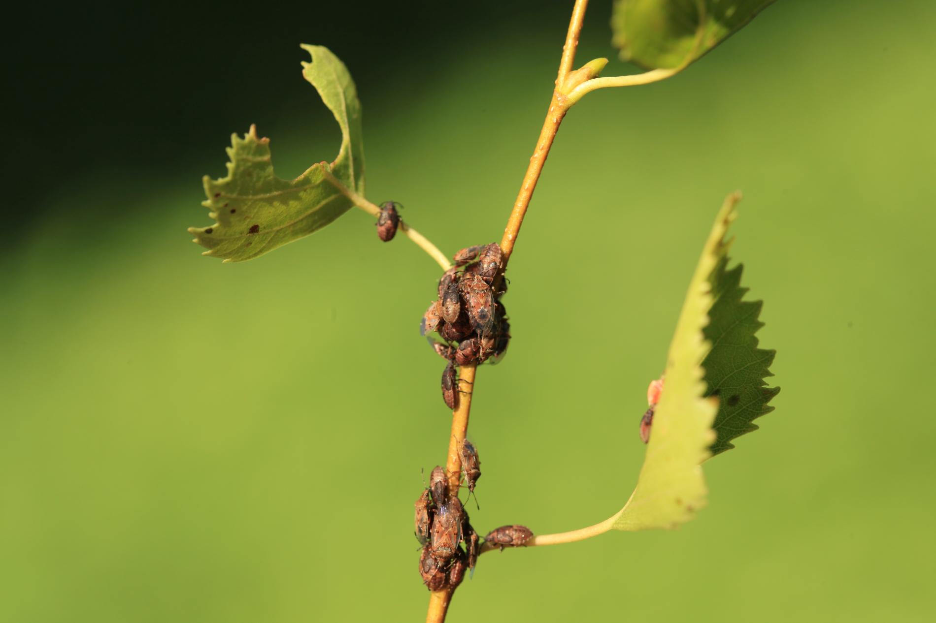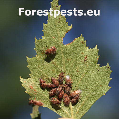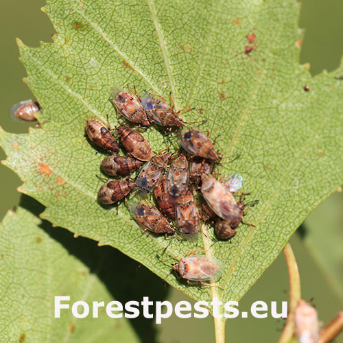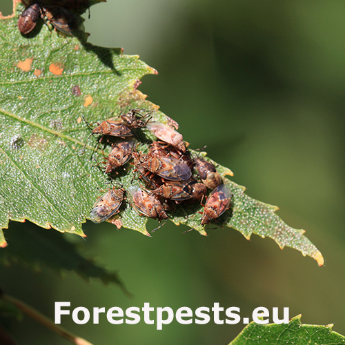 Birch catkin bug is a rust-coloured shield bug common on or around birch trees. It do not feed on other tree species. The adult is about 4.5 - 5.5 mm in size with patterned and largely transparent wings. Adults overwinter in the soil and/or in the crevices of the bark. It swarms early in the spring. It has several generations per a year and larvae occur from March to September. They look like an adults, but they don\'t have wings yet. Adults and larvae feed by sucking the juice from the birch catkins, they do not damage the leaves and do not worsen significantly the health of the trees. They can be found in the city parks and forests, where birch trees grow. They can be found also in houses, where they try to find a place for overwintering. They are not dangerous for humans, however, they can be disruptive and smell specifically, not very pleasant… From August to September, they look for a place to spend the winter and often enter the apartments through open windows and doors. A good way to protect your property is to use window nets against insects or adhesive tapes around the windows, which will partially prevent the penetration of bugs into the interior. In case the problem is serious, we recommend treat the birch trees in the vicinity in July by appropriate insecticide.