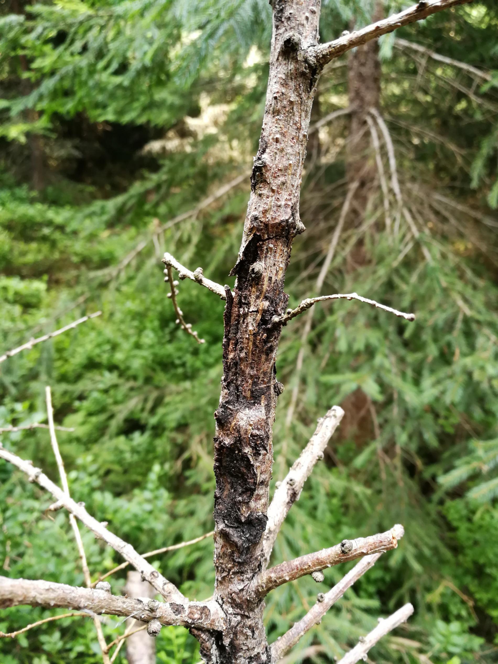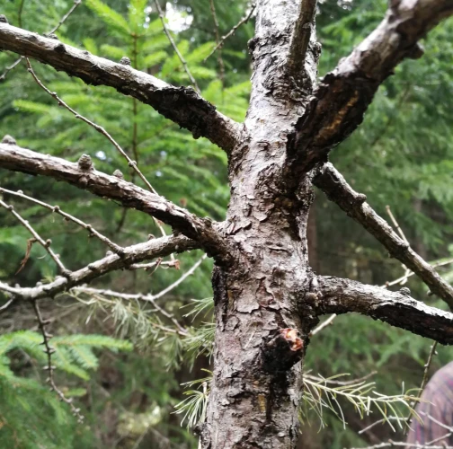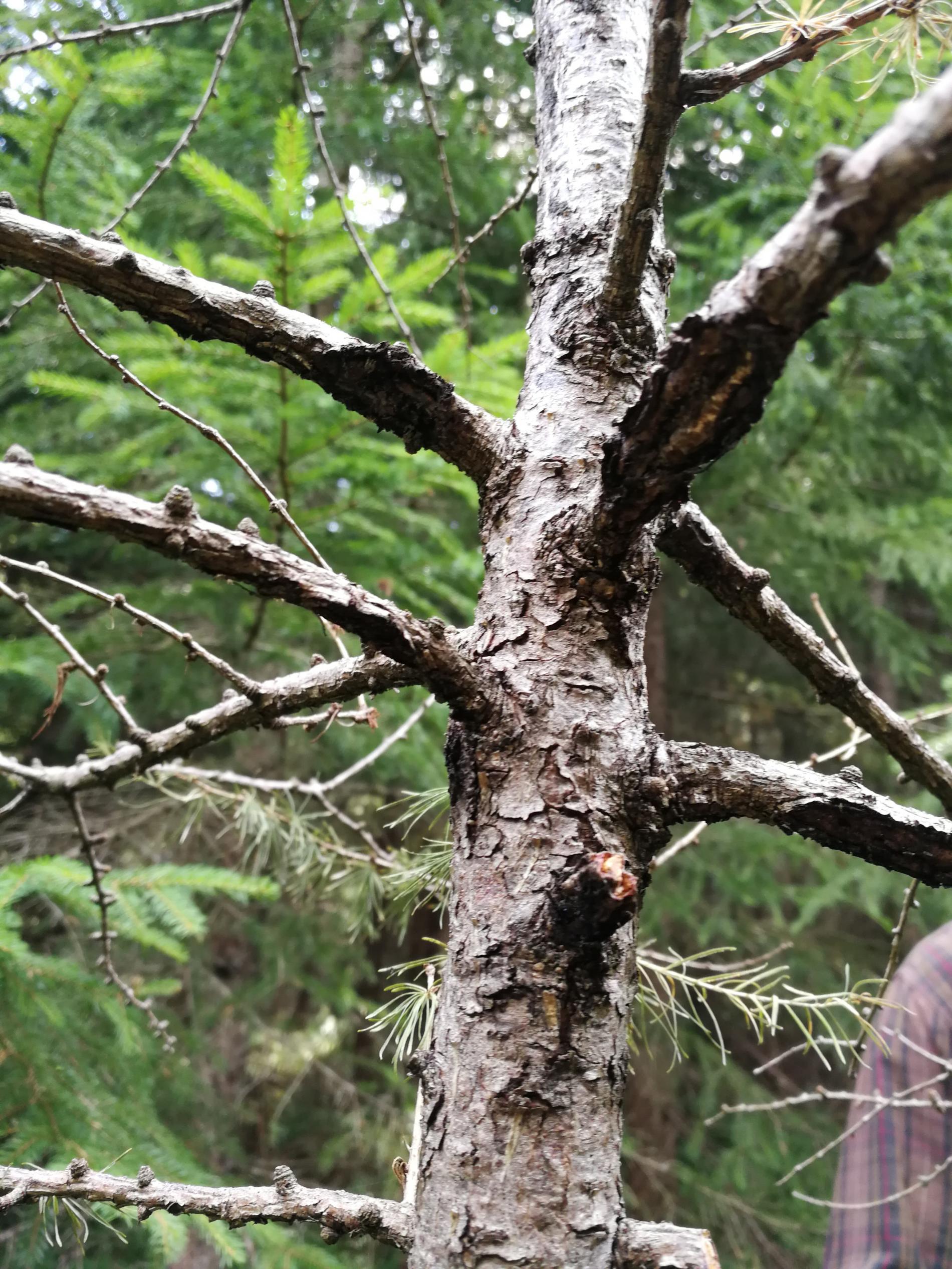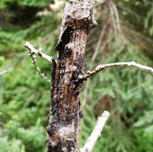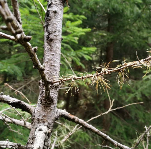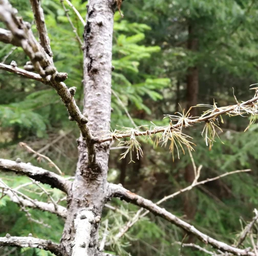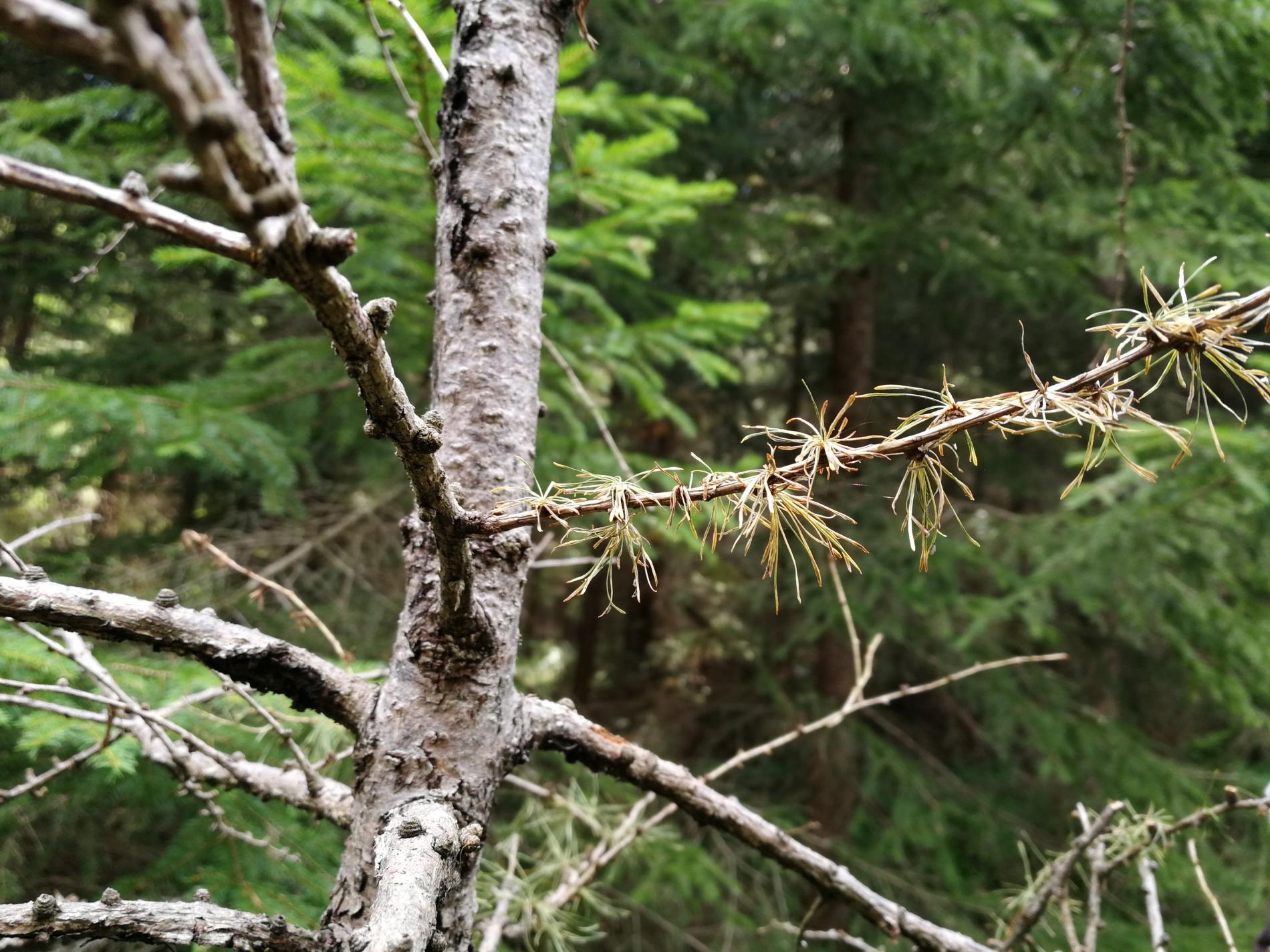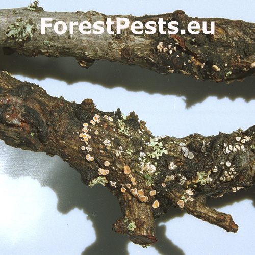The fungus causes canker in larch. The infection enters a tree through physical bark injuries or by aphid sucking which results in microscopic wounds and deterioration of bark elasticity. The bark becomes sunken at the infection site. Tree defense mechanisms trigger callusing around bark necroses and thus the stem or twig is soon deformed. After time, the infection site can be covered with saucer-shaped fruiting bodies which are 1–4 mm in diameter, with yellowish or orange centres and white wool on the edges and underside. The disease occurs mostly in moist valleys with subdued air currents.