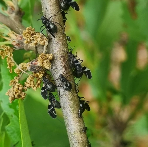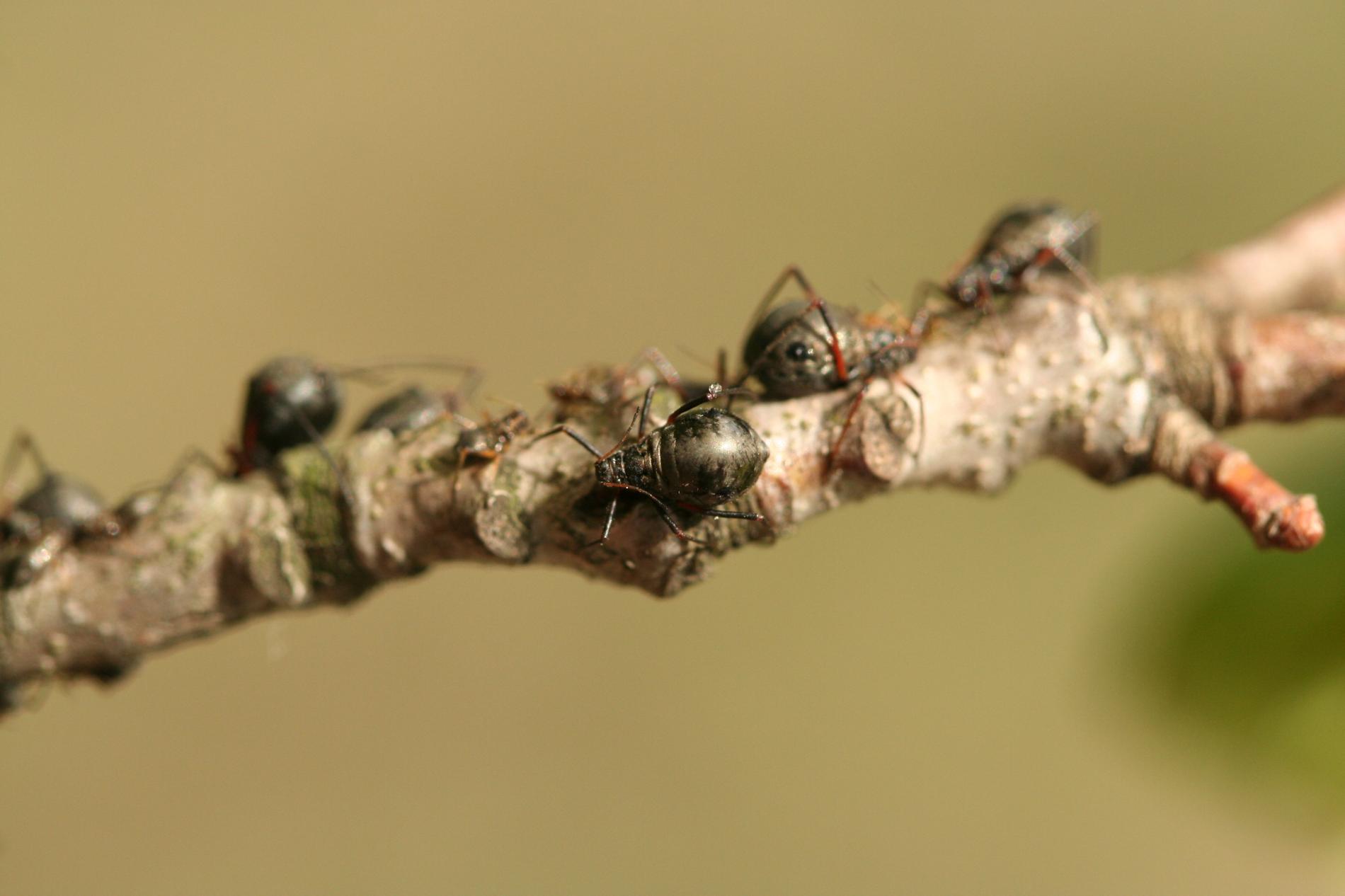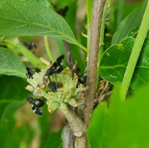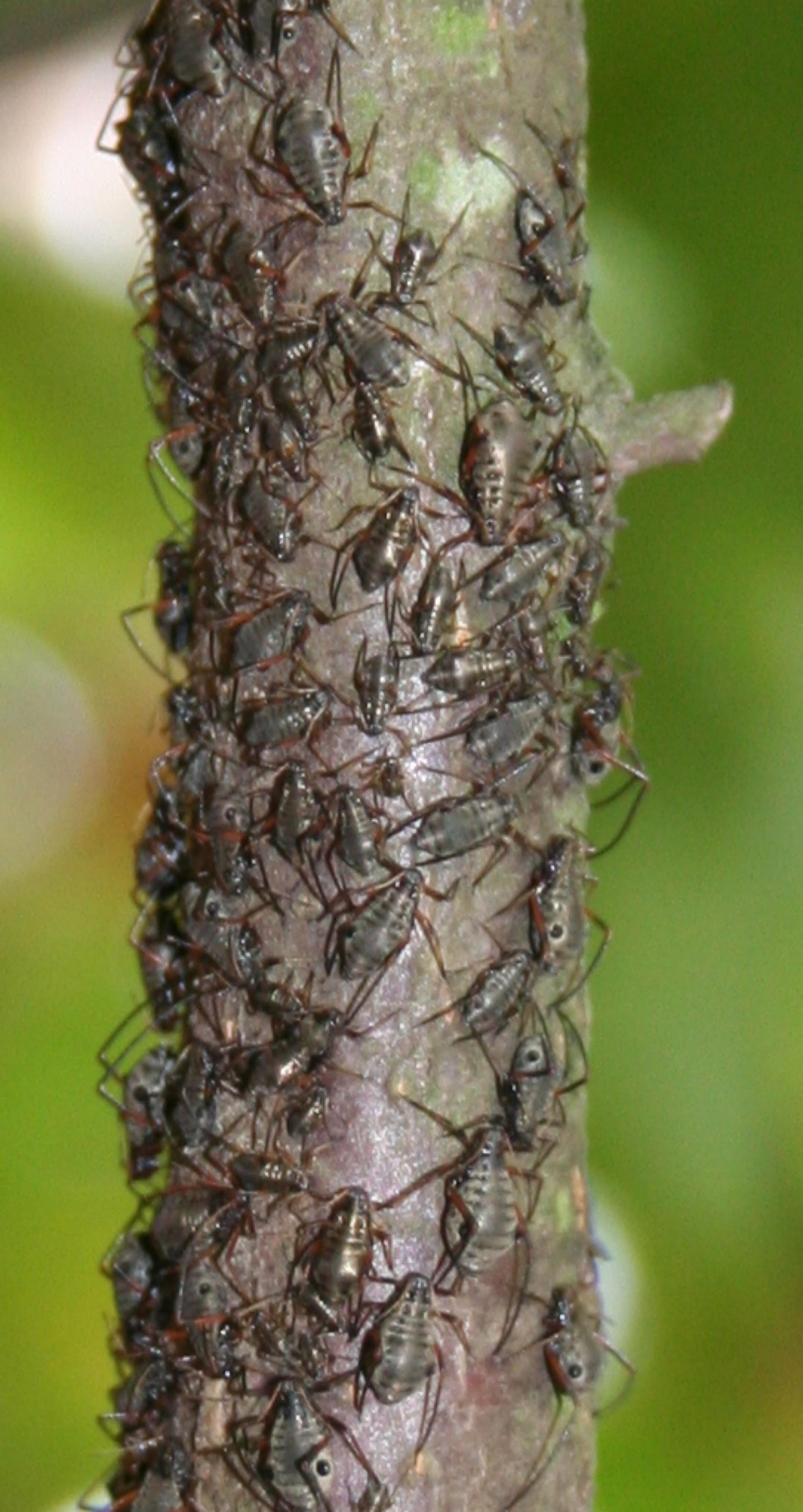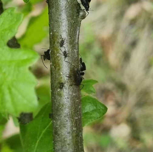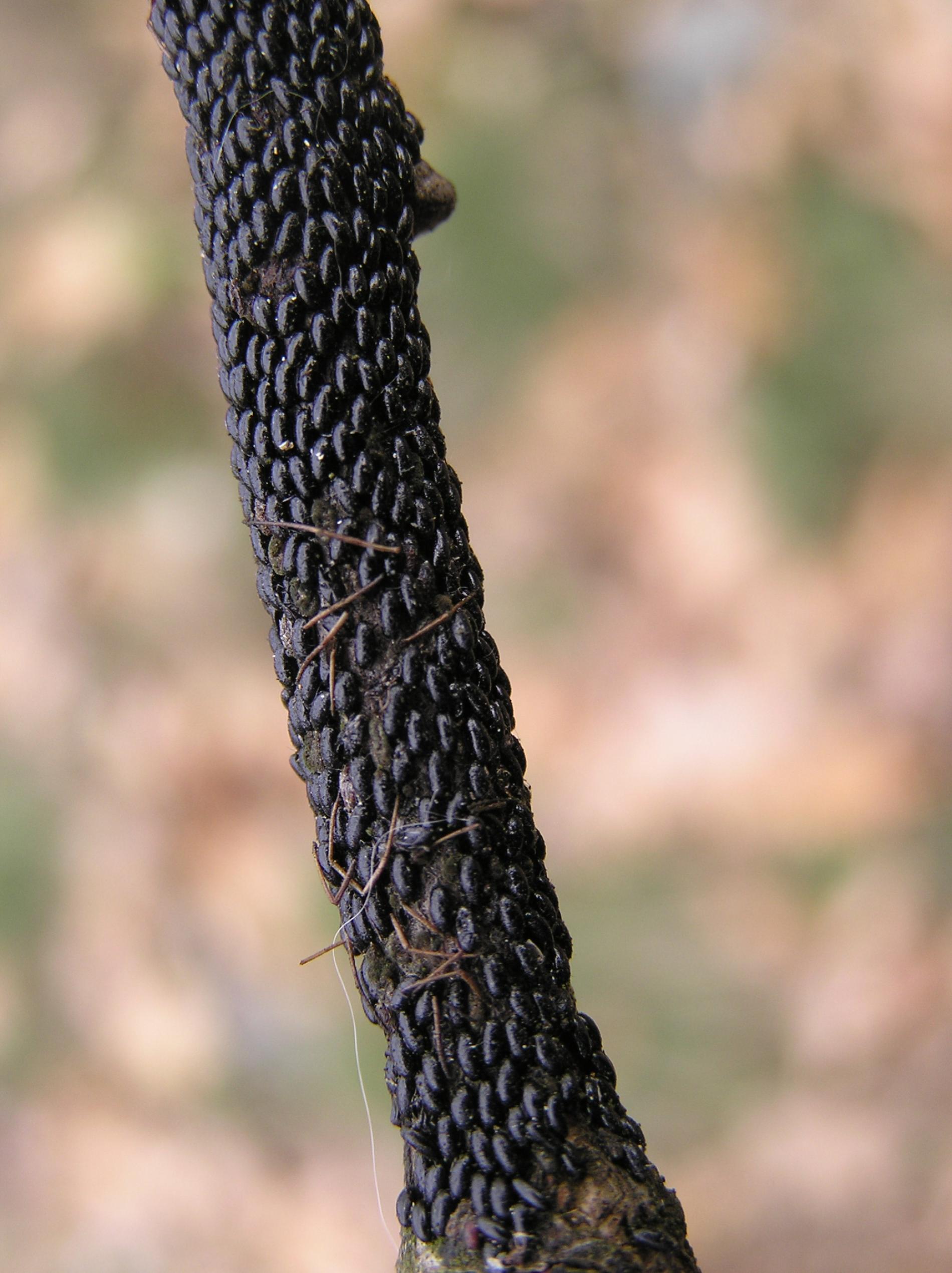 Large black aphids on the trunk.