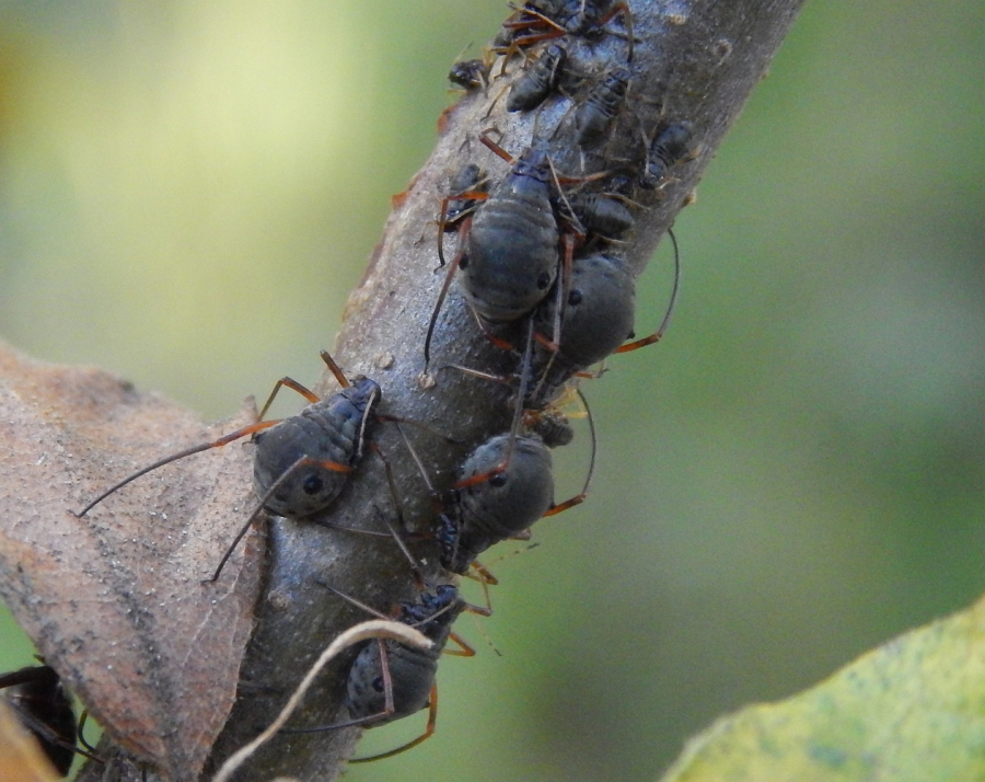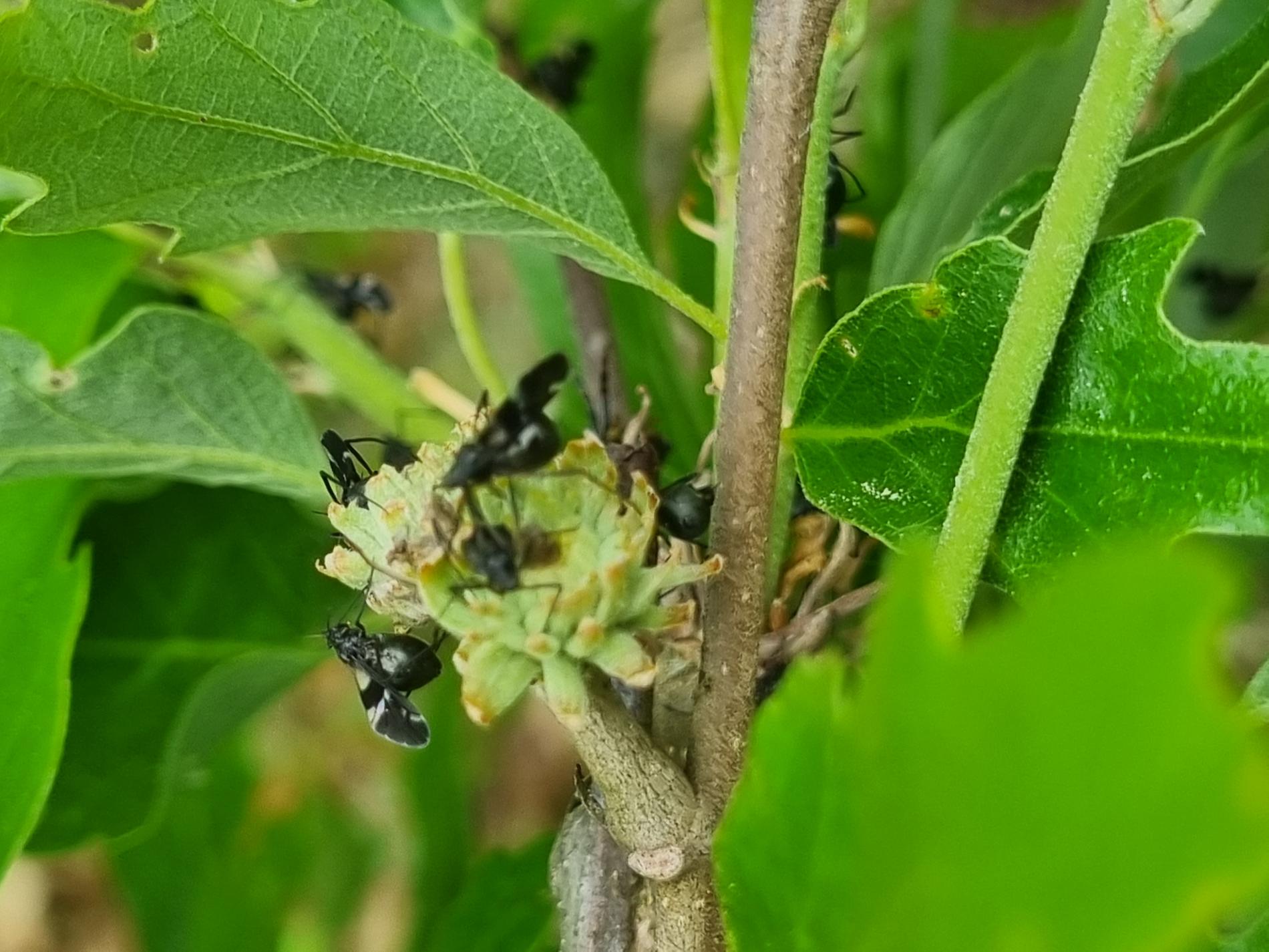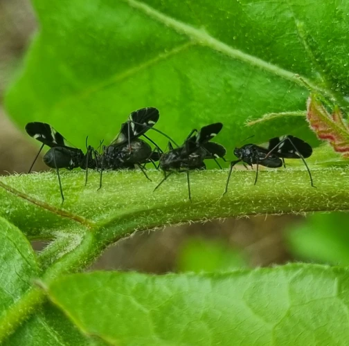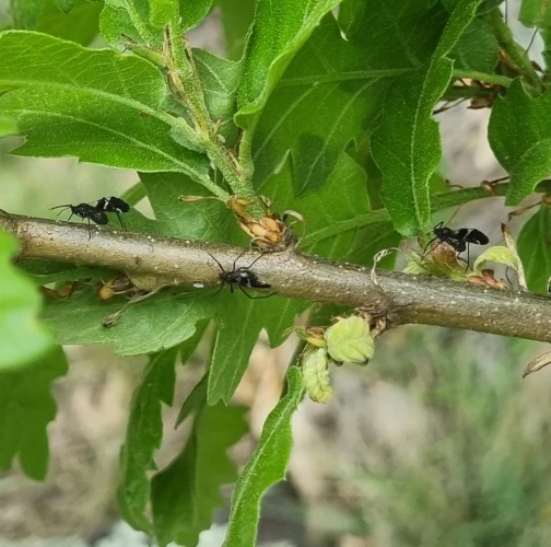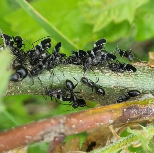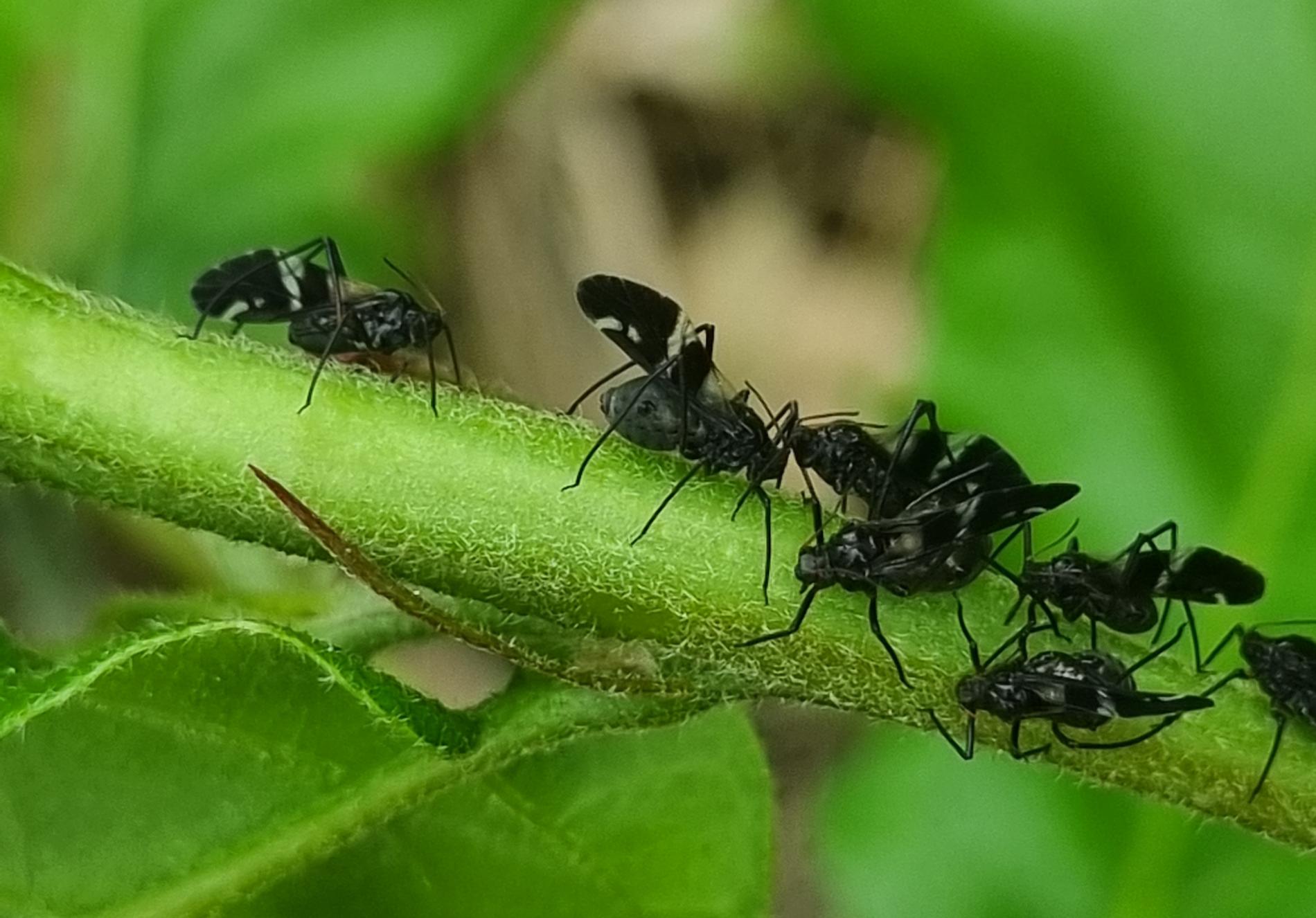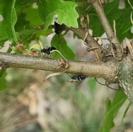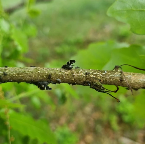 Large black aphids on the trunk.