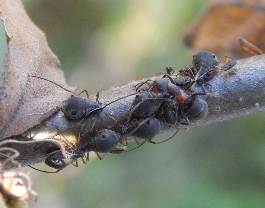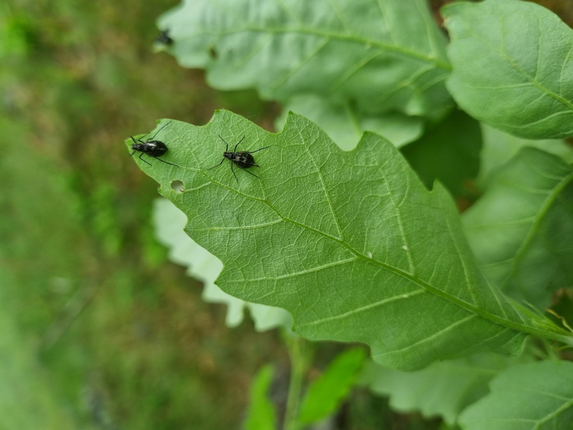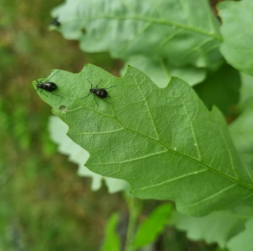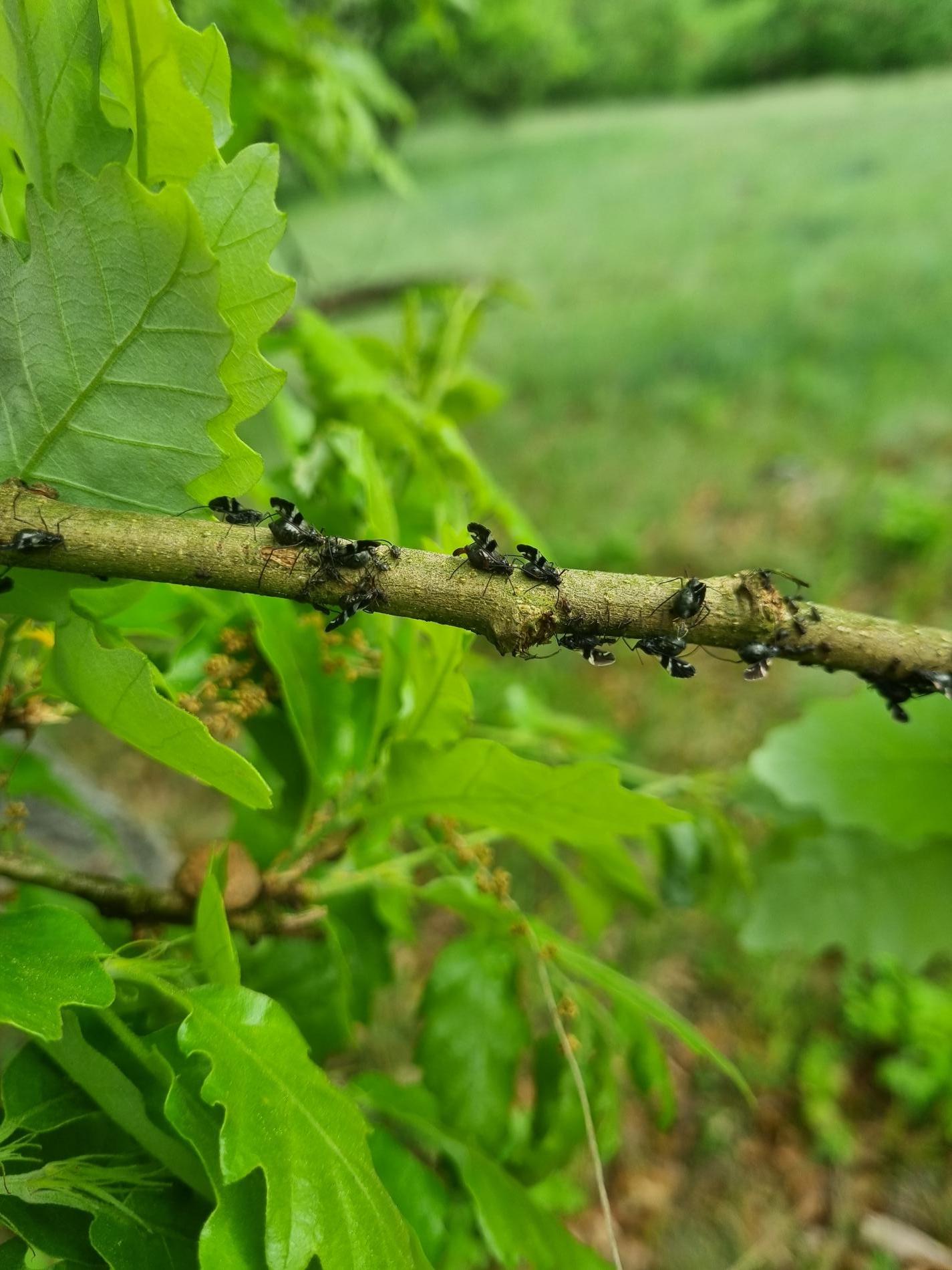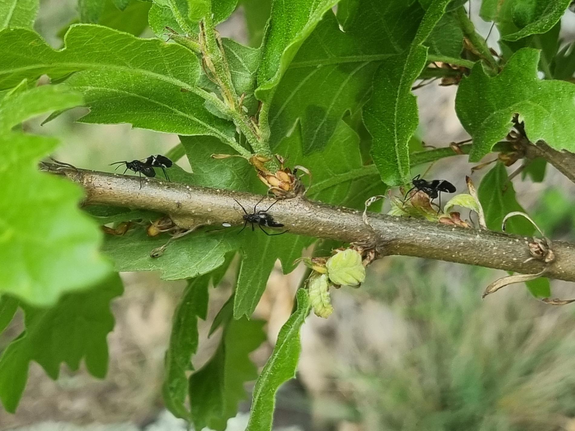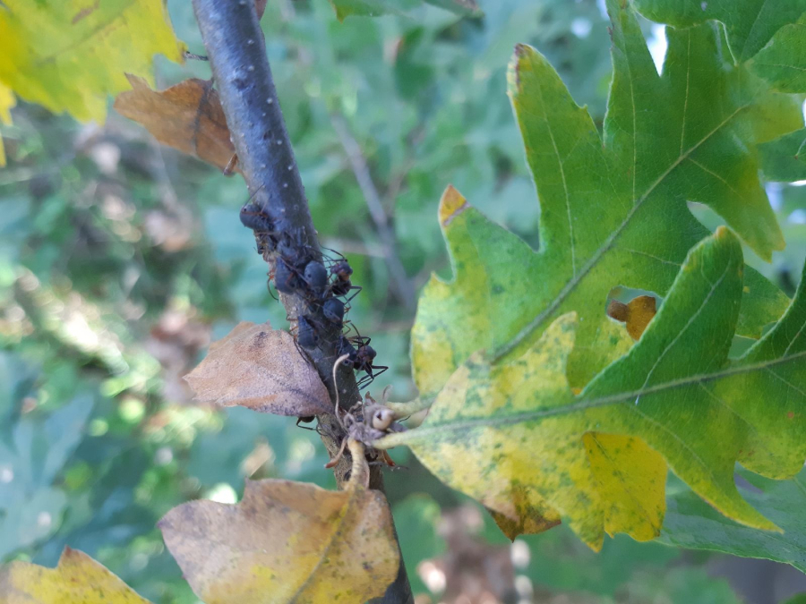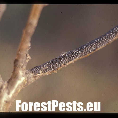The grey, about 2-3 mm long winged aphid which infest young oak sprouts in summer. The aphids live in colonies. They secrete honeydew commonly taken up by ants which frequently occur in the colonies of aphids and defend them. The sucking of aphids can cause damage to twig bark and consequent swellings. Black, about 1 mm long aphid eggs overwinter in groups on twigs.