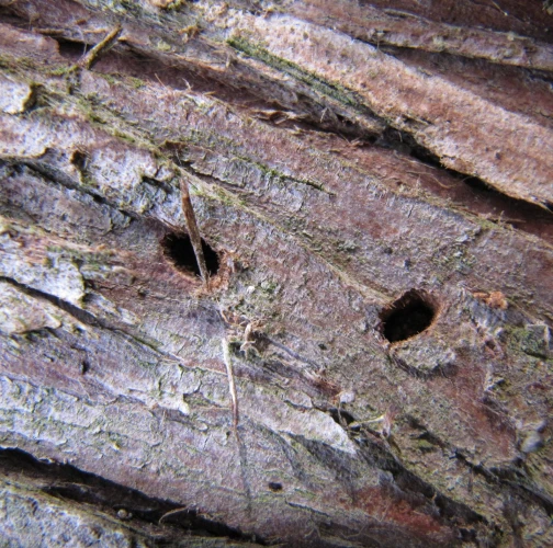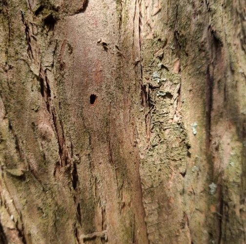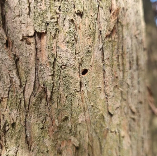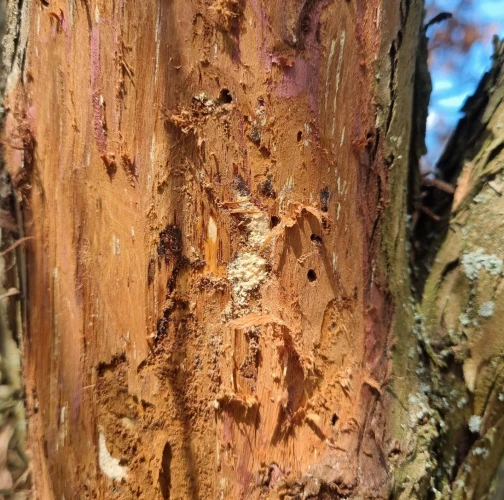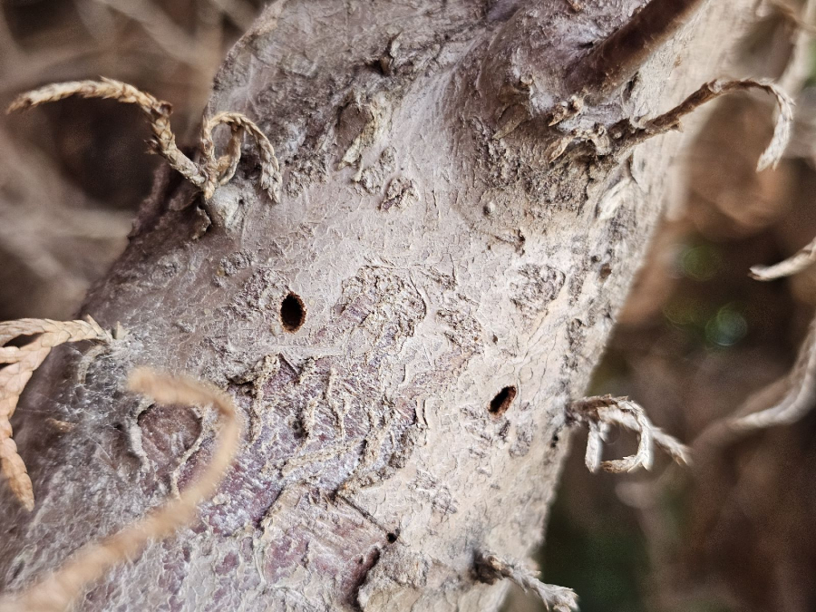 Three dieback. Galleries under the bark. There are typical, D-shape exit holes on the tree trunk. Under the bark, there are galleries filled with sawdust, larvae, or shiny metallic beetles.