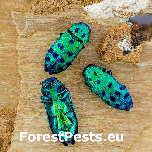 This species is also known under the name Lamprodila festiva or Ovalisia festiva or Lampra festiva. The cypress jewel beetle is a thermophilic species with Mediterranean distribution. It is common in the south, rare in the middle (still more and more common in recent years), and absent from the north of Europe. Size is 12–13 mm, dorsal surface metallic green, the elytra with blackish-blue spots. Galleries are bored by the larvae, at first only in the bark then within the sapwood. Pupates in the wood. Exit holes with typical D-shape. Repeated attacks cause a progressive dieback of the tree. It is common in gardens and forest steppes.