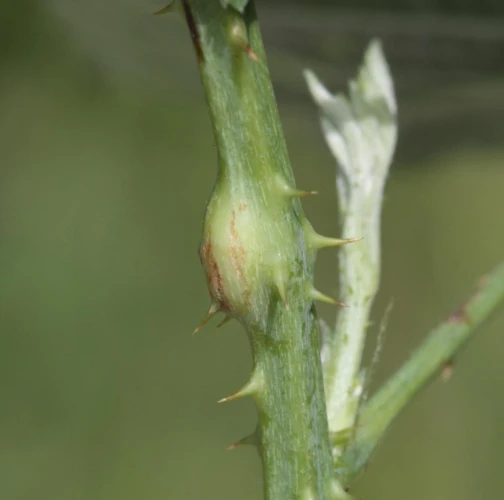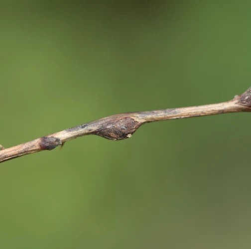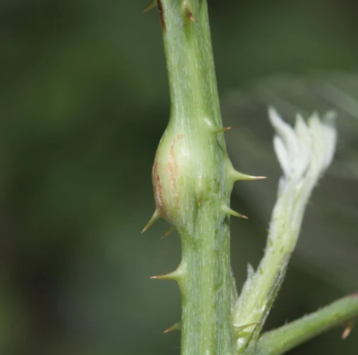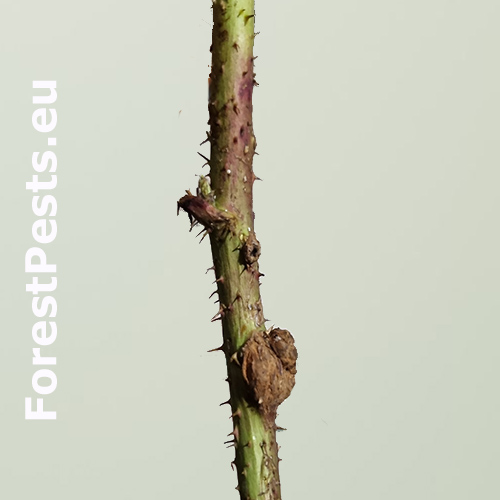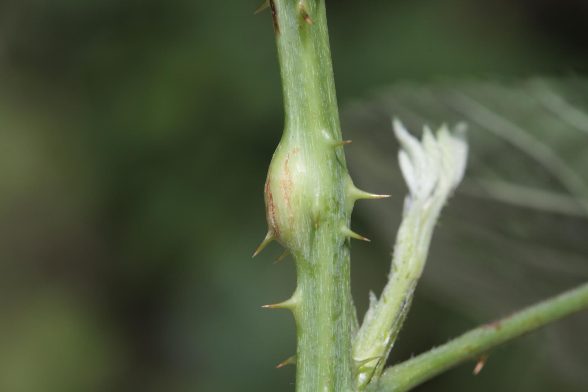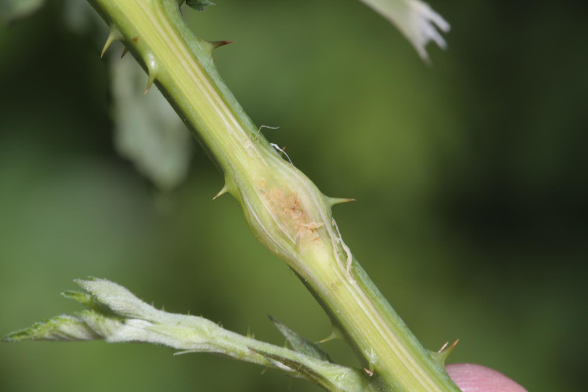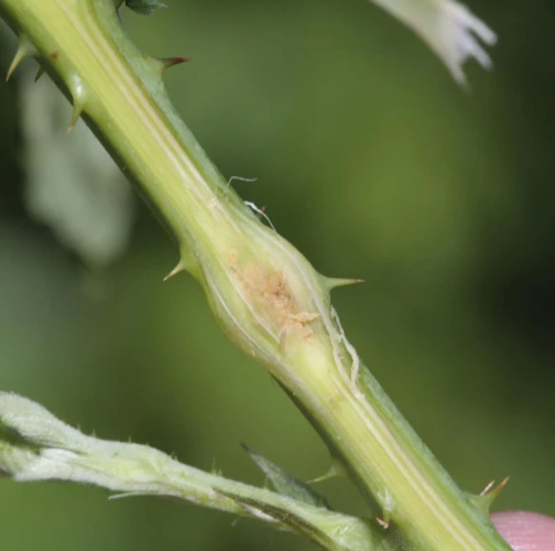 Lasioptera rubi is a species of gall midge (Cecidomyiidae - they are small, delicate flies) that specifically infests plants of the Rubus genus, which includes raspberries and blackberries. The larvae of this insect feed on plant tissues, causing the formation of galls on the stems and canes. These galls can weaken the plant, reducing its vigor and fruit yield and may causes partial des-iccation of stems, which may break due to strongwinds. Adult females lay their eggs on the stems of Rubus plants, typically near the buds or wounds. Once the eggs hatch, the larvae burrow into the plant tissue, where they feed and cause the formation of galls. The larvae and pupae remain inside these galls, protected from predators and environmental conditions. Adult midges emerge from the galls in spring to mate and continue the cycle. Control measures often involve monitoring for gall formation and removing infested plant parts to limit spread.