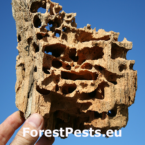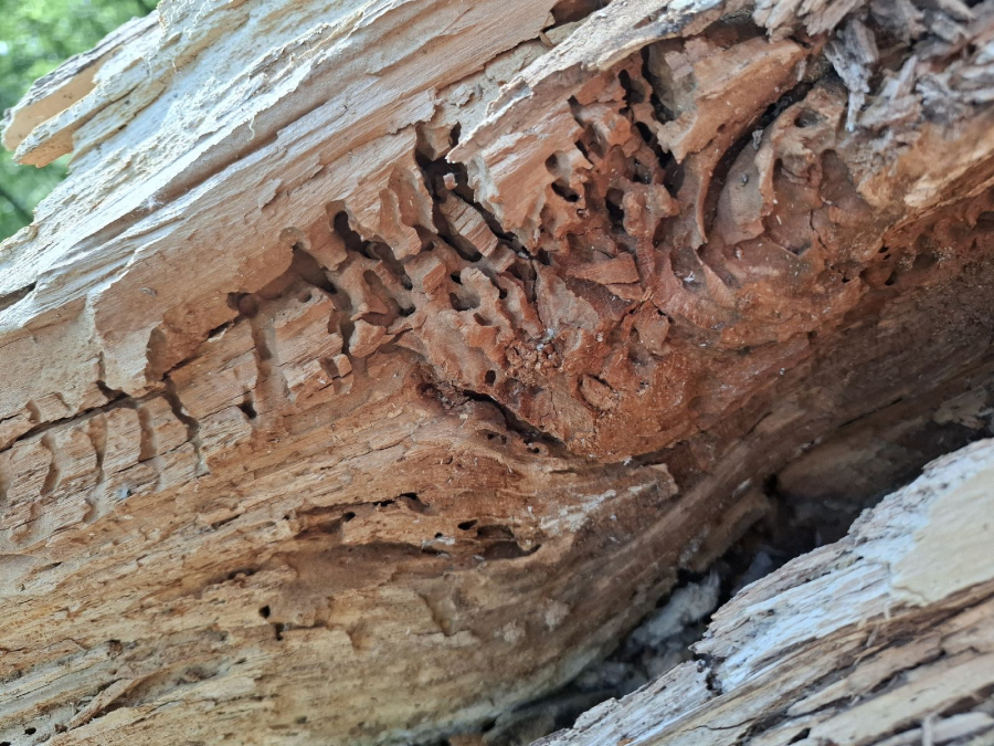 On the trunks and within the cavities of older trees, there are hollow spaces and small chambers in the wood. Aphid colonies and honeydew accumulation may occur on nearby shoots.