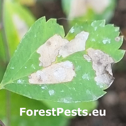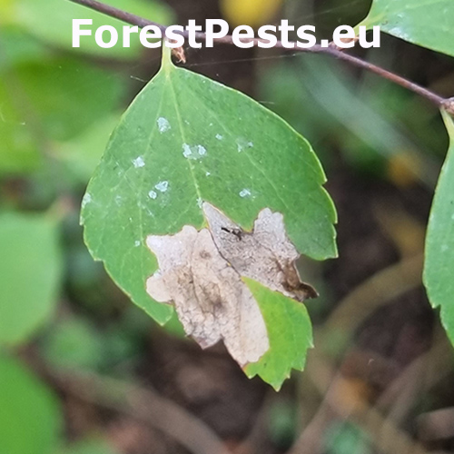 The feeding activity results in visible mines on leaves, where larvae consume internal tissues, forming brownish, irregular spots. Affected plants experience reduced aesthetic value due to damaged and discolored leaves. In cases of higher larval abundance, C. spiraeella can weaken shoots and overall plant vitality, particularly in urban green spaces and ornamental gardens.
