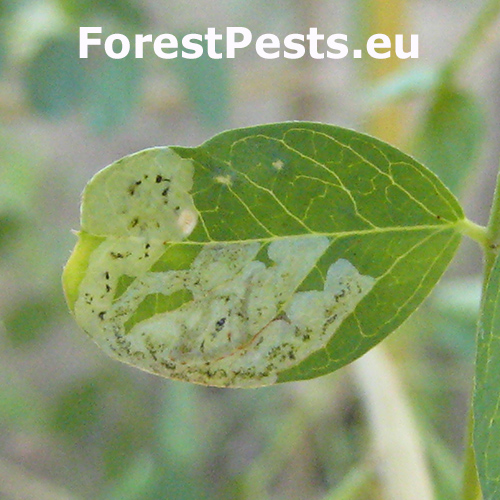 On affected leaves, unbranched corridor mines appear on the upper surface. The mines are bright green at first, then turn whitish and brown. Frass forms a green central band, bordered by small black granules.