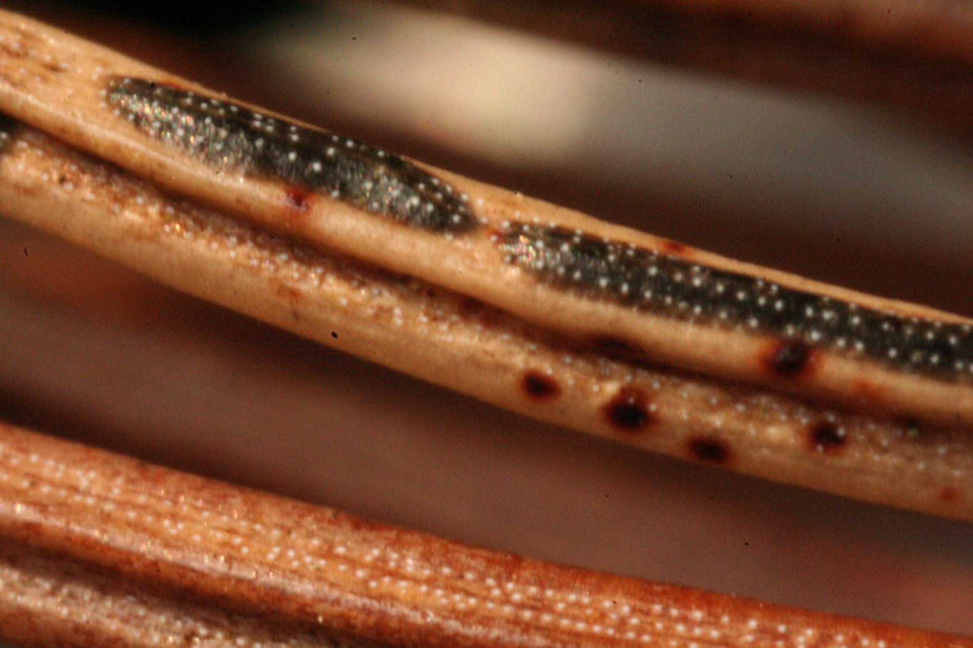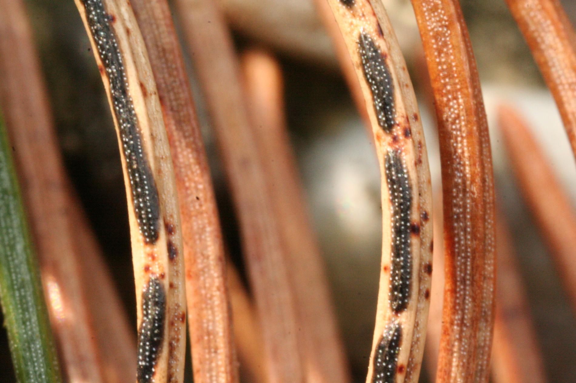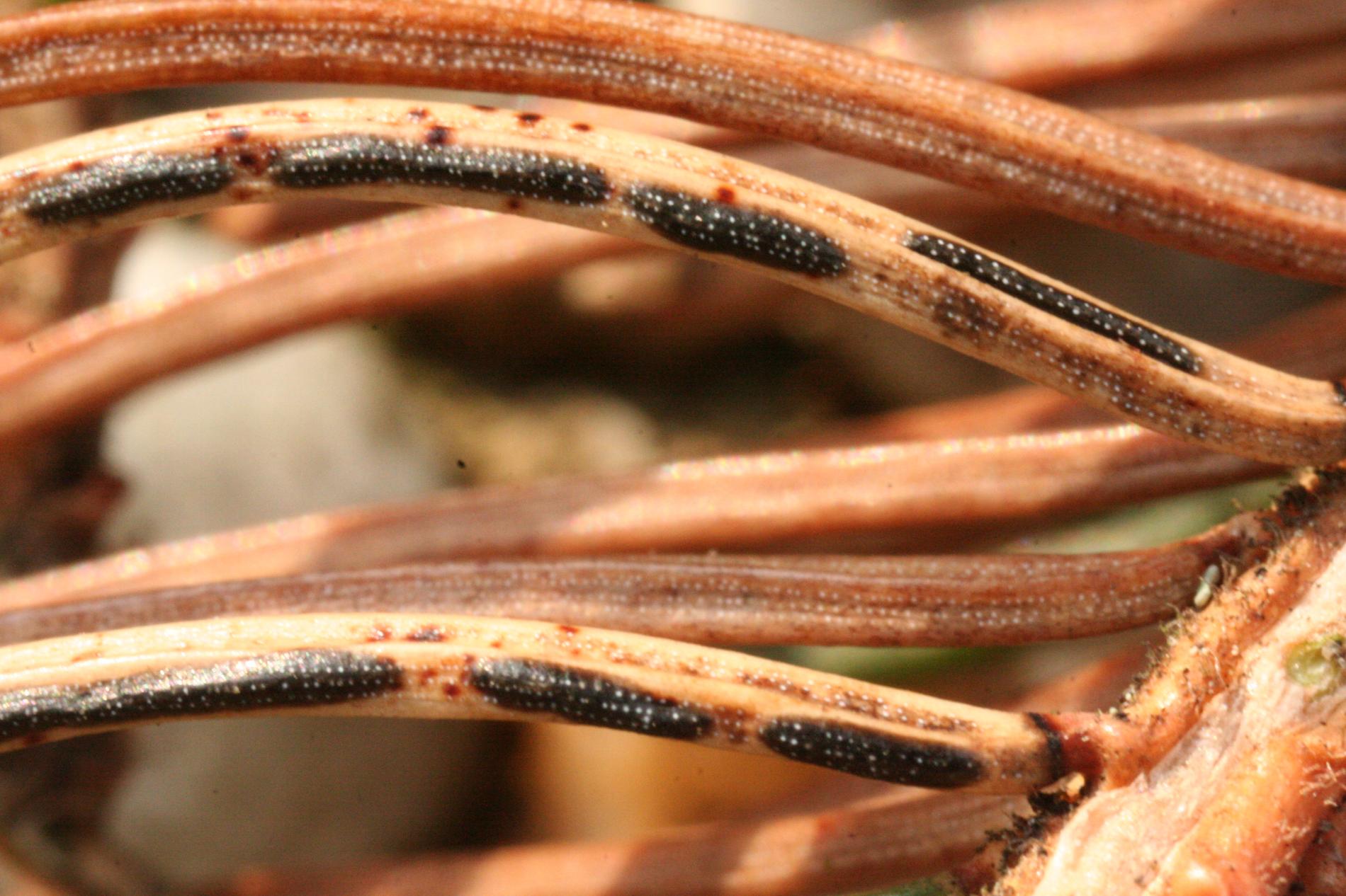 Black dashed fruiting bodies on needles.