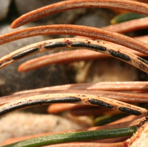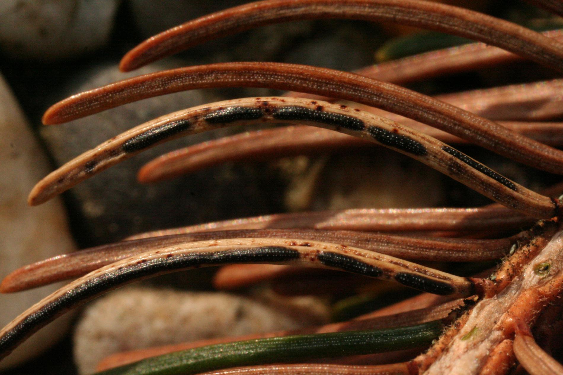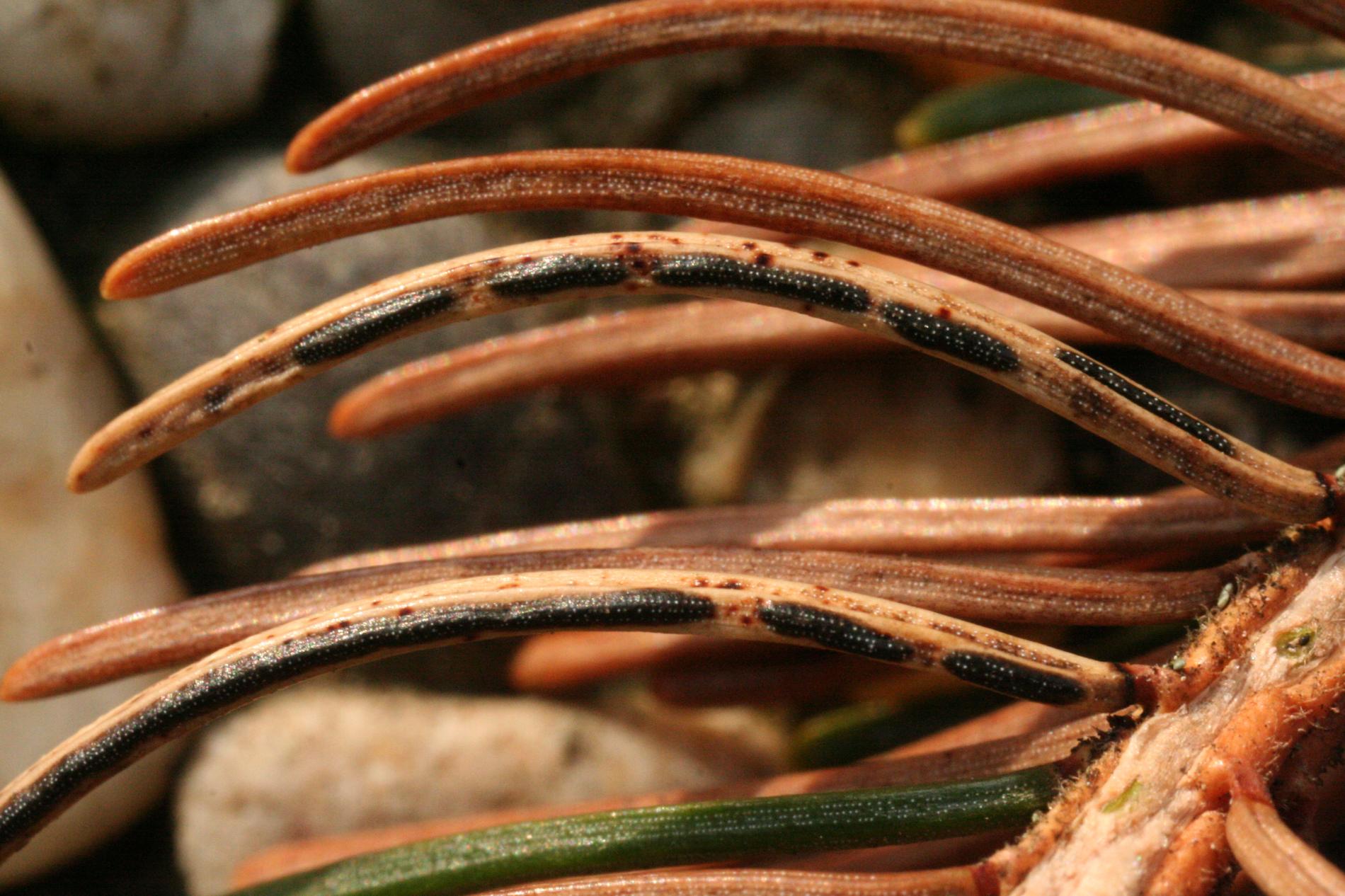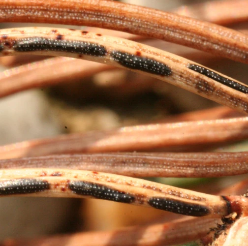 Black dashed fruiting bodies on needles.
