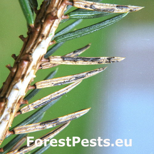 In lower altitudes the fungus infests juvenile spruces, but in uplands mature trees are also attacked. The infection begins in April, with second growth needles of the previous year being most at risk. During the year the attacked needles wilt, turn brown and drop (needlecast). The following July, transparent aqueous elliptic pimples (spermagonia) appear on the needles which later develop a black margin which is actually the asexual stage of the fungus. After humid springs and summers, hysterothecia (long and thick lateral black stripes) develop in autumn of the same year, whereas a dry season halts the development until next spring. Attacked needles turn brown. In April, two years after infection, the spores mature in the hysterothecia, are extruded into the air and invade fresh needles of the last growth year.