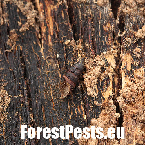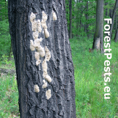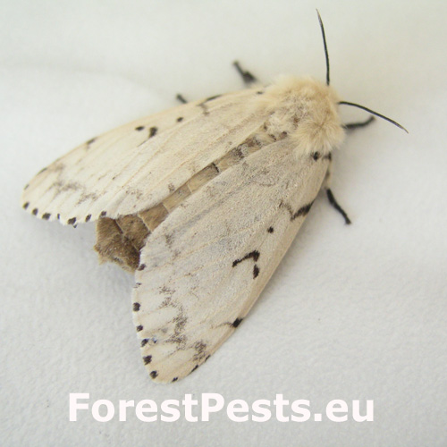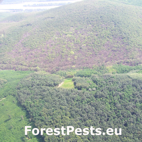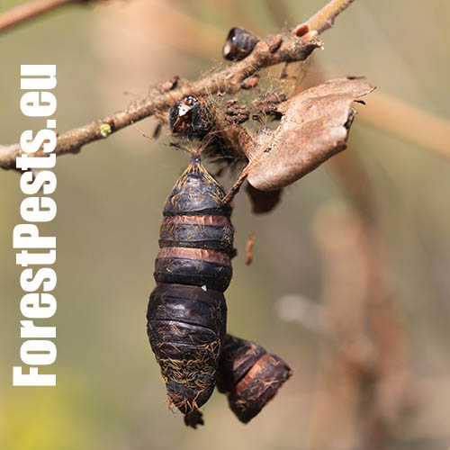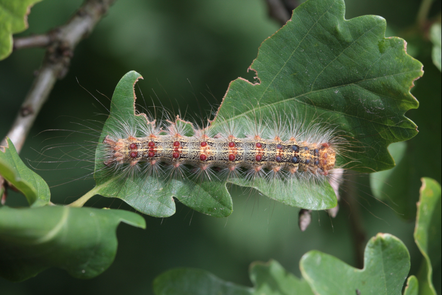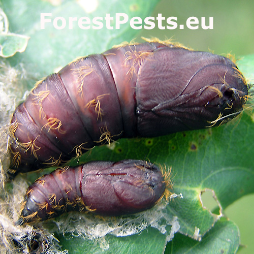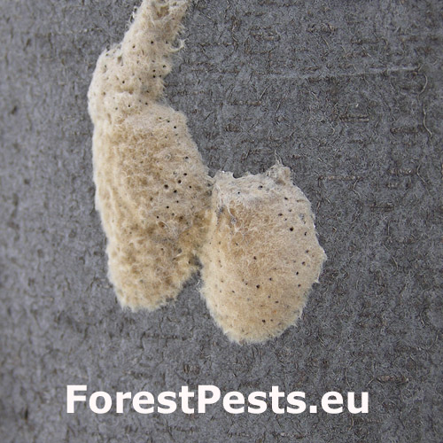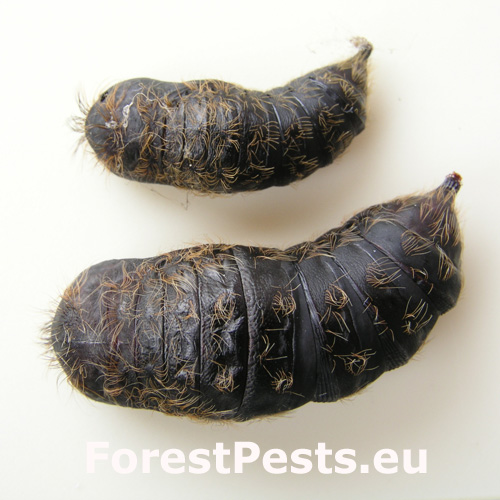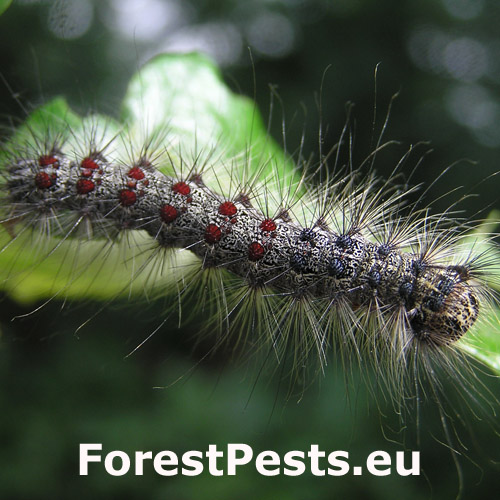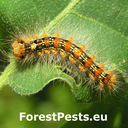 The gypsy moth is a foliage-feeding insect that periodically reaches outbreak levels, causing widespread defoliation of broadleaf forests across much of Central and Southern Europe. Gradation usually lasts for 2-4 years and it is repeated every 5-10 years (more frequently in southern parts of Europe). The adults hatch from July to August. Only male fly. After mating, the female lays eggs in a group in July and August close to the place where she hatched. Larvae generally prefer oaks, but may feed on many different species of trees and shrubs. On average, one egg masse contains 300-400 eggs which overwinter. Larvae hatch in April. Large, colourful, downy larvae are 4-6 cm long when pupate.