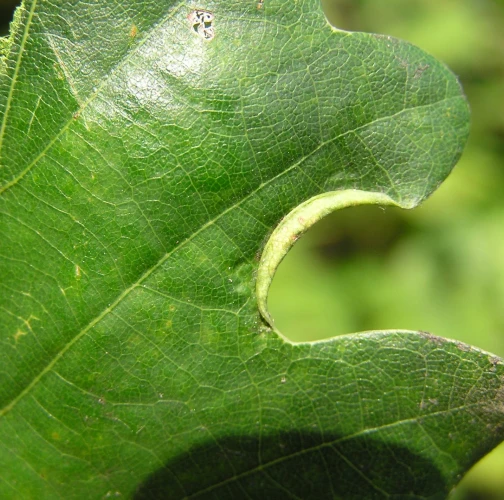 The gall is formed by a rolled leaf margin segment, situated between two lobes. Inside the fold lives the larva.