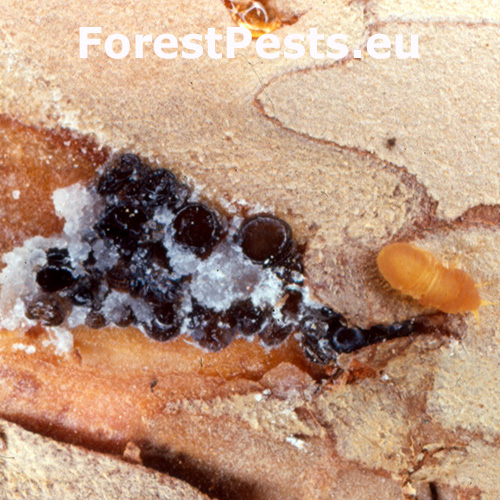 Infested trees display yellowing needles, resin exudation, and visible brown or oval spots under the bark. Small, round holes in the bark may also appear (note that this symptom is typical for other species as well, so caution is advised in identification). Severe infestations can lead to tree decline and, in extreme cases, tree mortality.