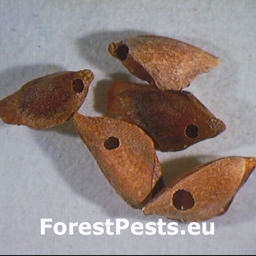 Infested seeds are often hollow, with no visible external damage, but small exit holes may appear once the adult emerges.