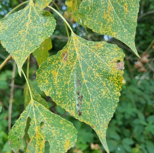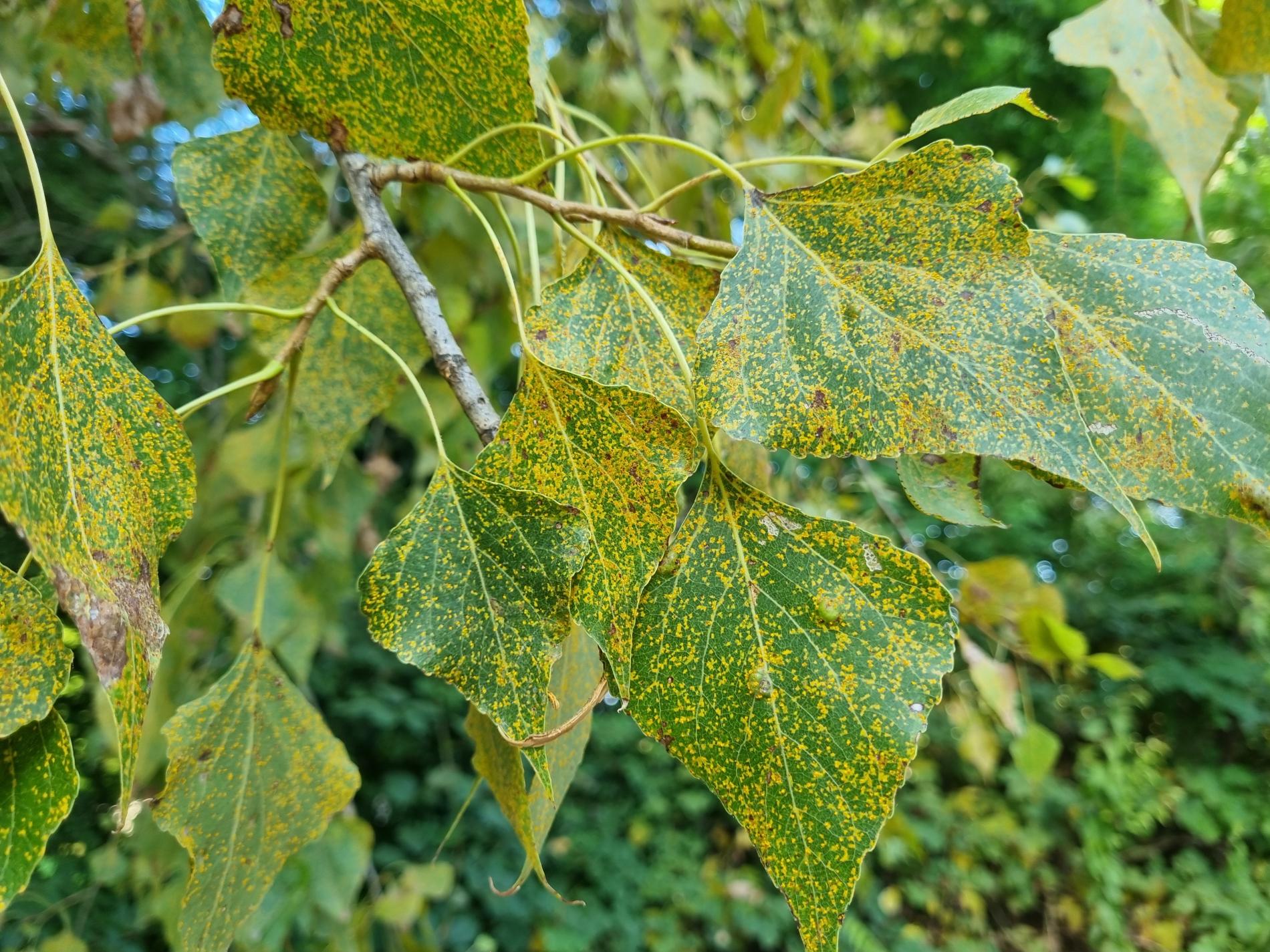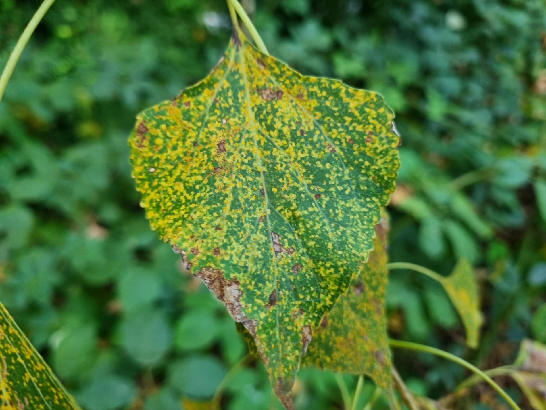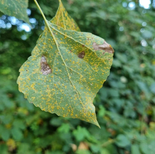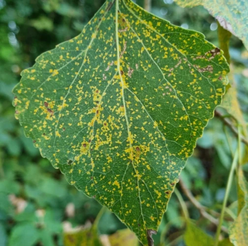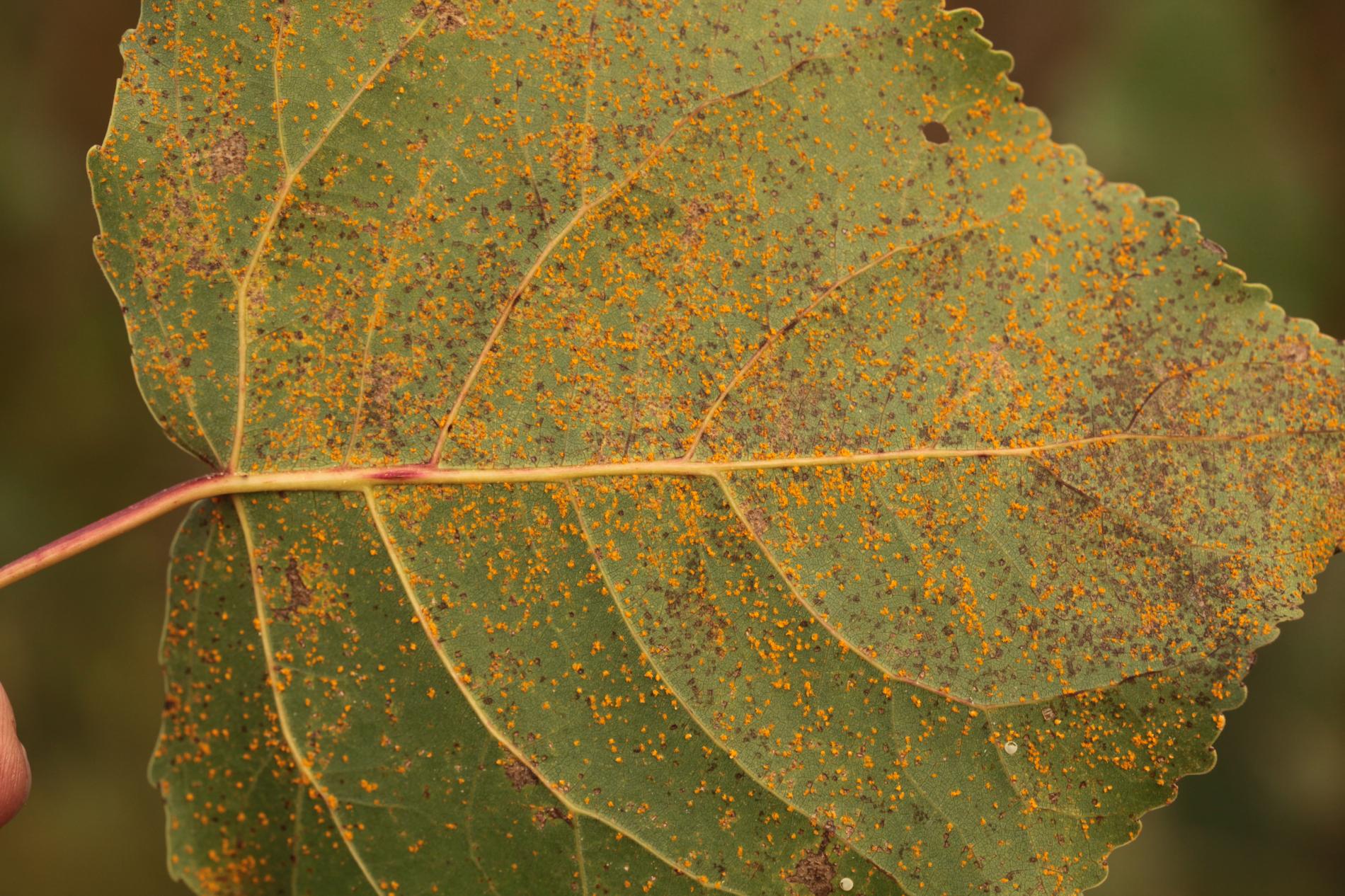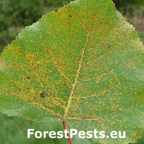 Towards the end of summer and in autumn, on white poplar (Populus alba) leaves are formed telia and in them teliospores. Rust at this stage overwinters on shed leaves. In spring, teliospores germinate and form basidiospores that infect larch needles. Then, spermatogonia and small stacks of orange deposits - aecia - are formed on needles. Aeciospores infect poplar leaves, where firstly are formed yellowish orange uredinia which can repeatedly infect poplar leaves in the course of summer. Later, winter spores, teliospores, are formed on leaves in dark brown to black deposits of spores - telia. Aspen leaves (P. tremula) are attacked by similar rust M. populnea. Disease on larches is not of a practical significance.