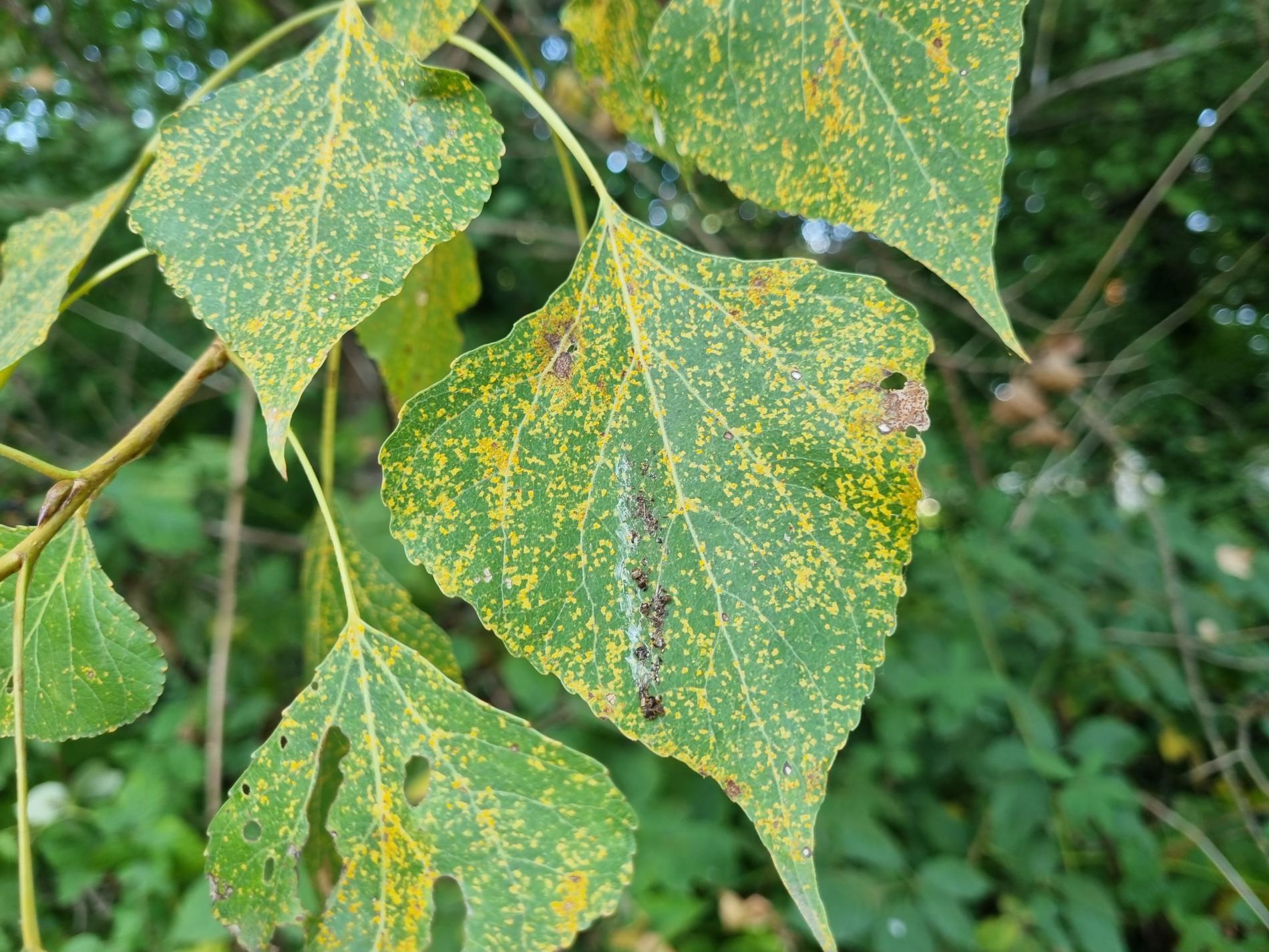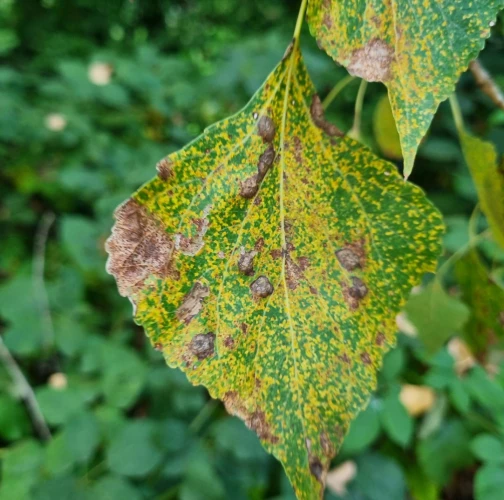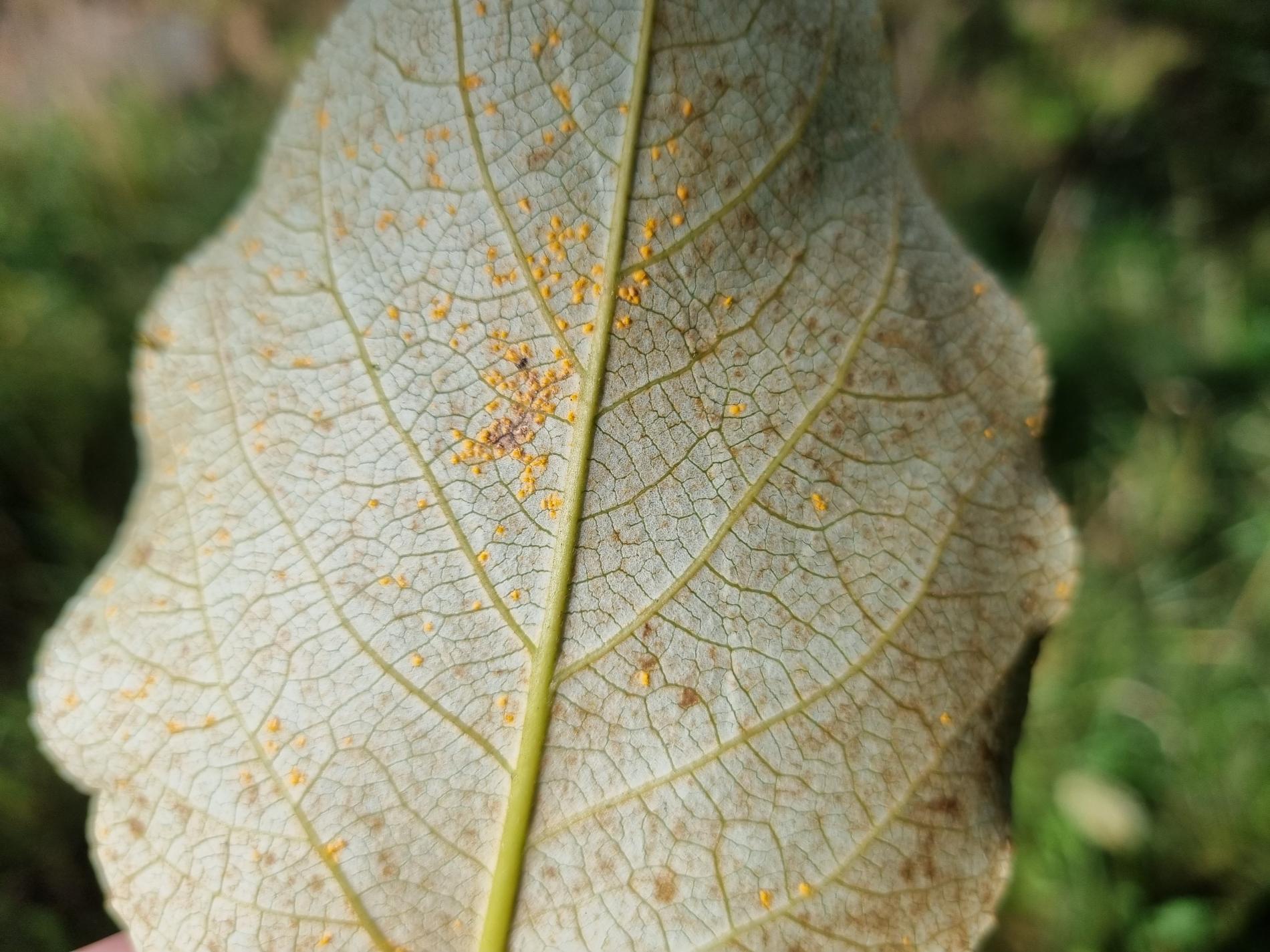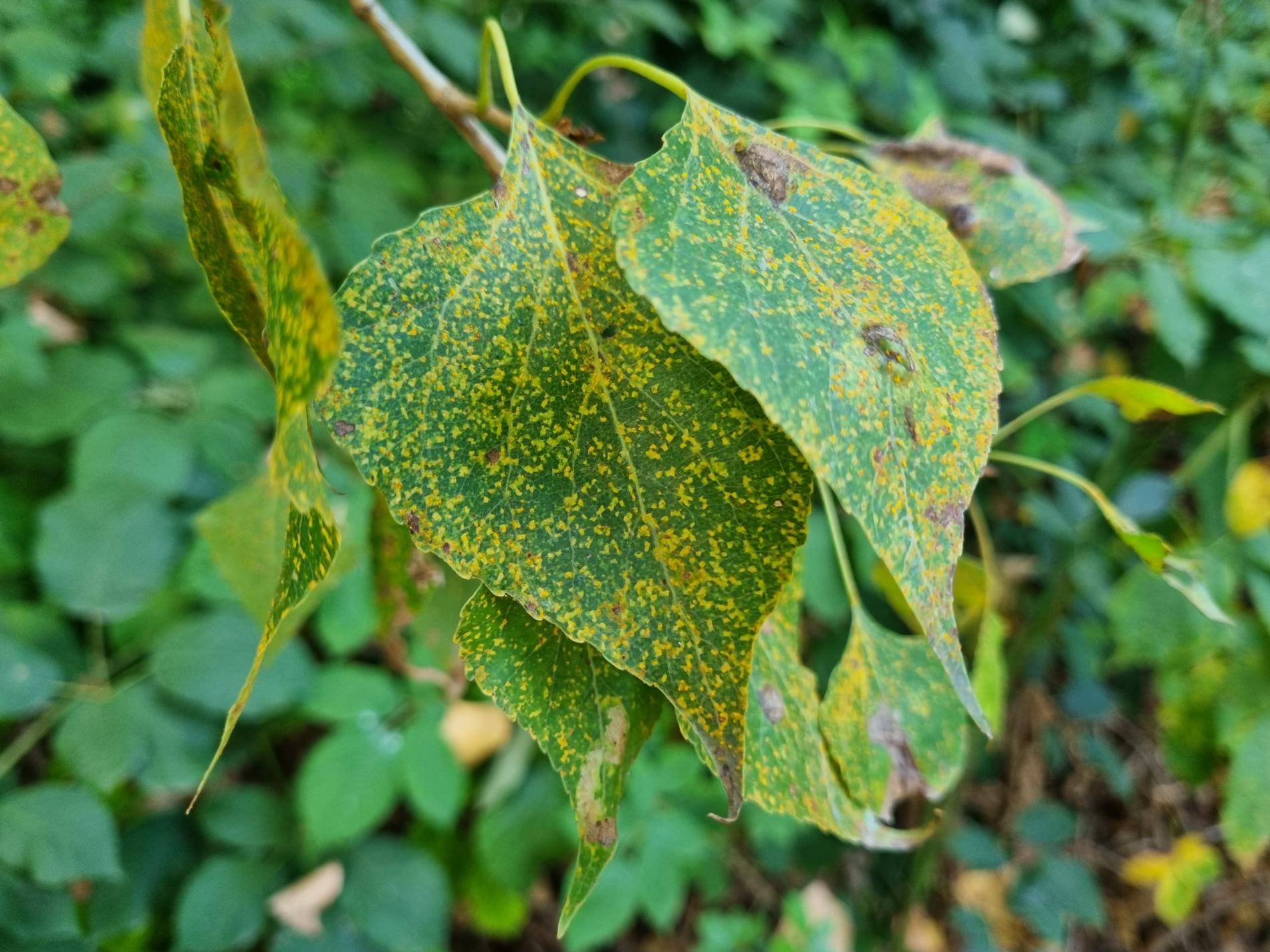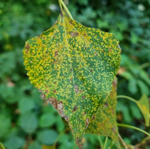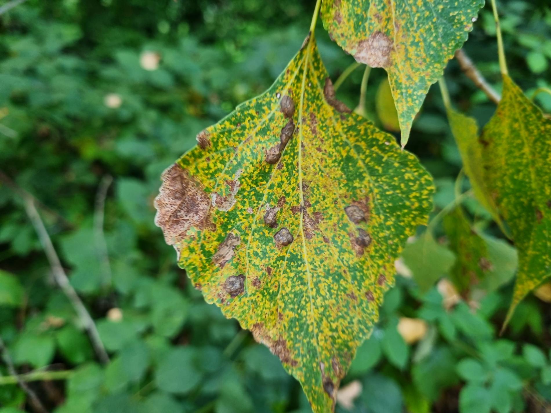 Towards the end of summer and in autumn, on white poplar (Populus alba) leaves are formed telia and in them teliospores. Rust at this stage overwinters on shed leaves. In spring, teliospores germinate and form basidiospores that infect larch needles. Then, spermatogonia and small stacks of orange deposits - aecia - are formed on needles. Aeciospores infect poplar leaves, where firstly are formed yellowish orange uredinia which can repeatedly infect poplar leaves in the course of summer. Later, winter spores, teliospores, are formed on leaves in dark brown to black deposits of spores - telia. Aspen leaves (P. tremula) are attacked by similar rust M. populnea. Disease on larches is not of a practical significance.