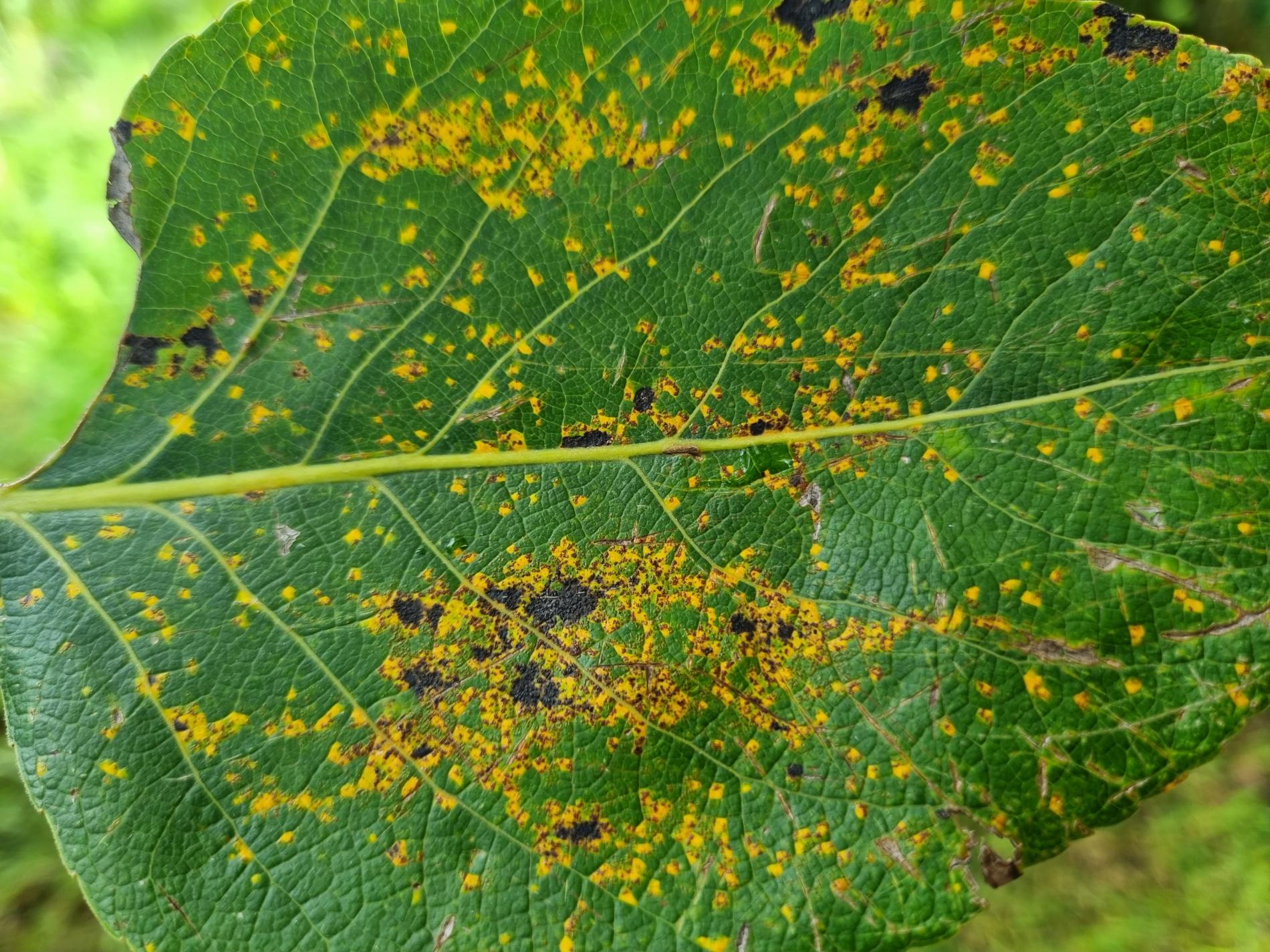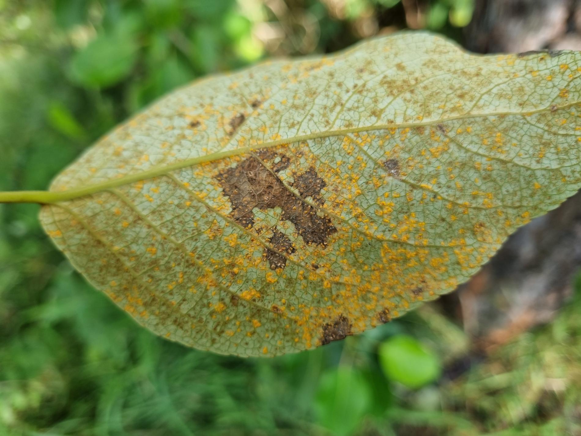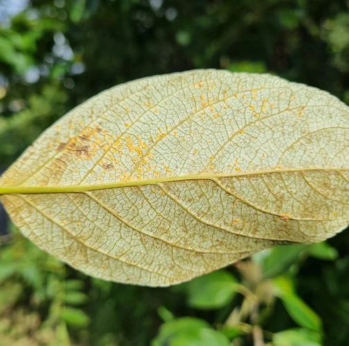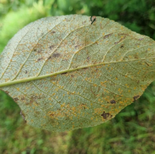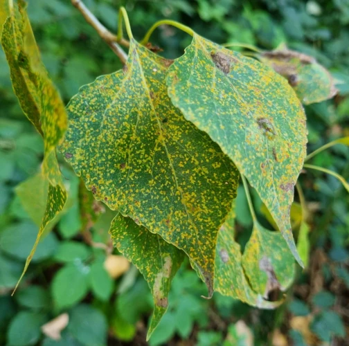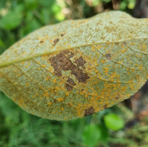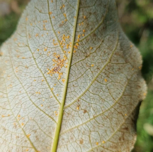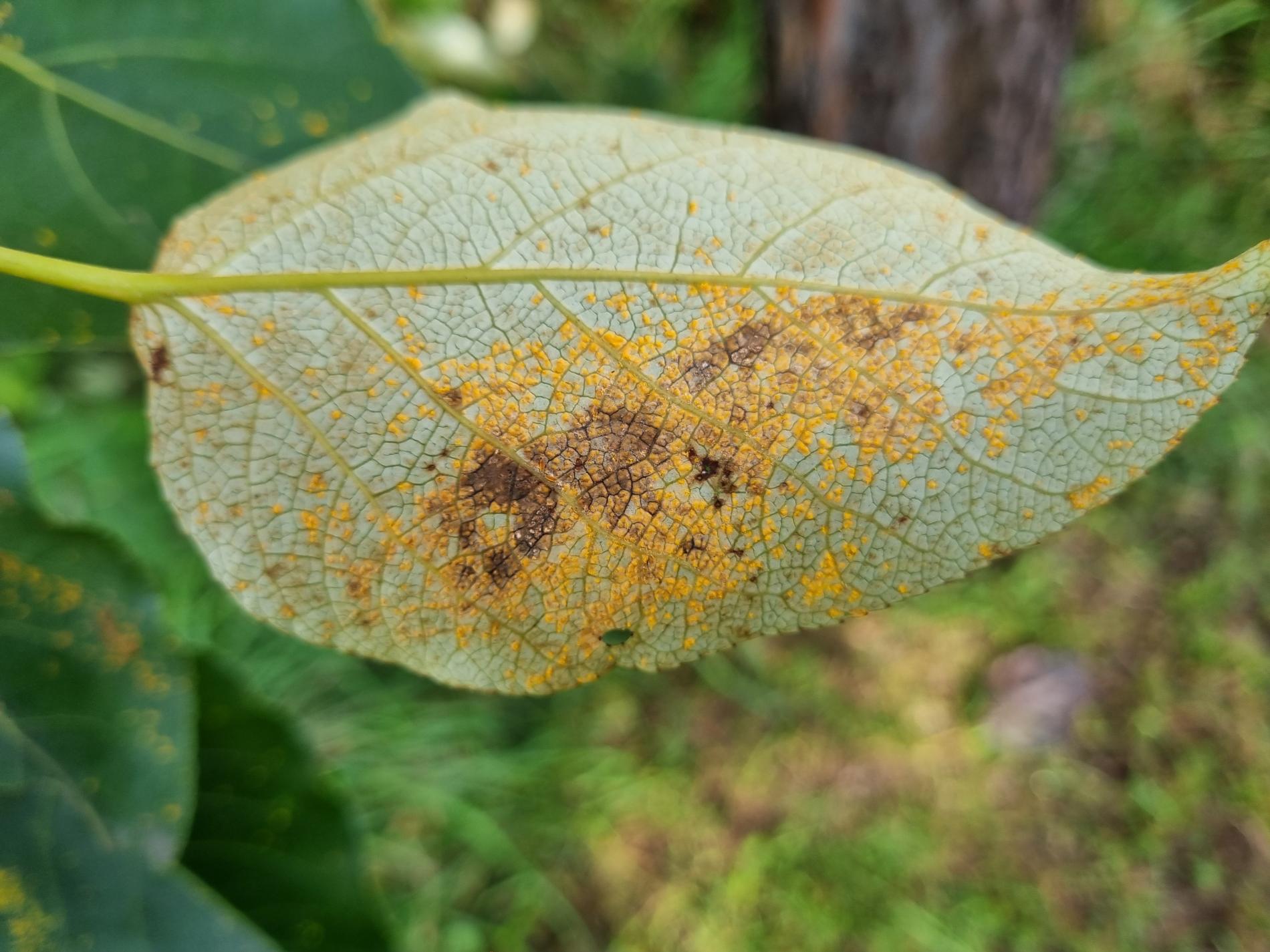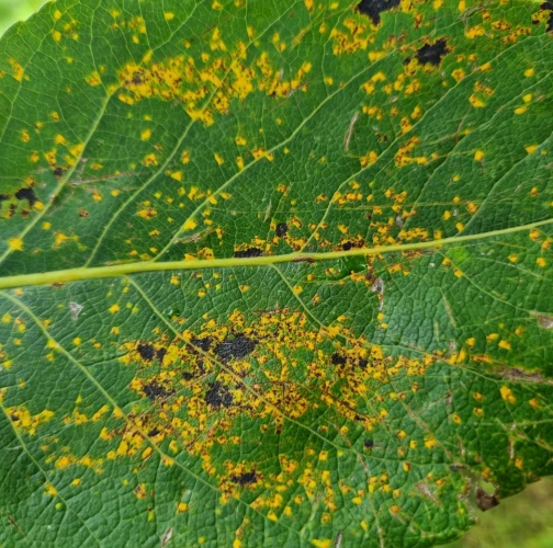 Towards the end of summer and in autumn, on white poplar (Populus alba) leaves are formed telia and in them teliospores. Rust at this stage overwinters on shed leaves. In spring, teliospores germinate and form basidiospores that infect larch needles. Then, spermatogonia and small stacks of orange deposits - aecia - are formed on needles. Aeciospores infect poplar leaves, where firstly are formed yellowish orange uredinia which can repeatedly infect poplar leaves in the course of summer. Later, winter spores, teliospores, are formed on leaves in dark brown to black deposits of spores - telia. Aspen leaves (P. tremula) are attacked by similar rust M. populnea. Disease on larches is not of a practical significance.