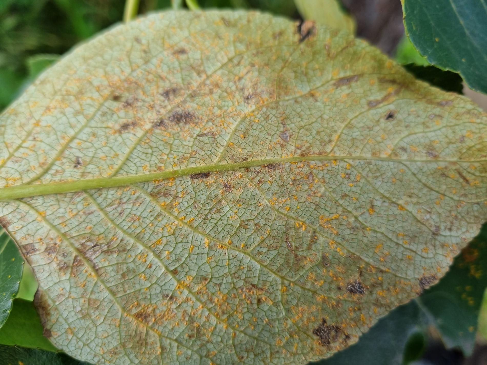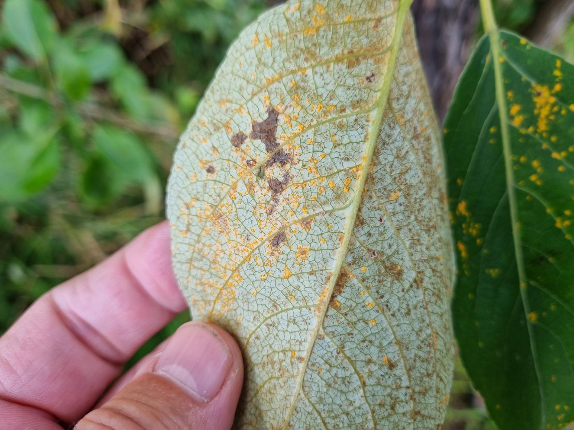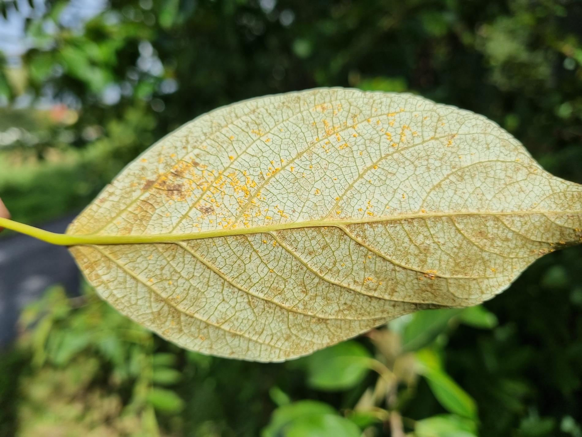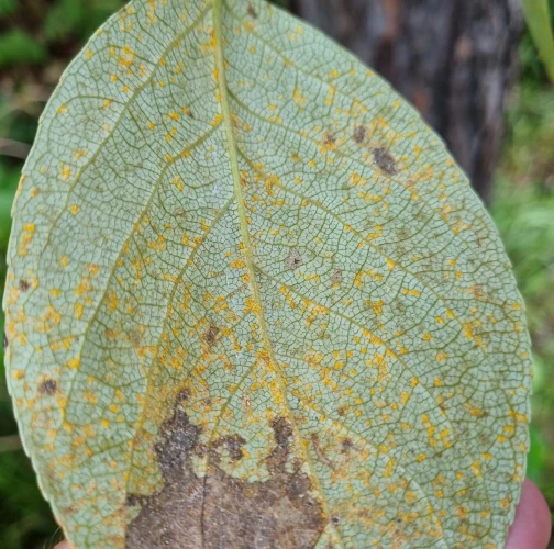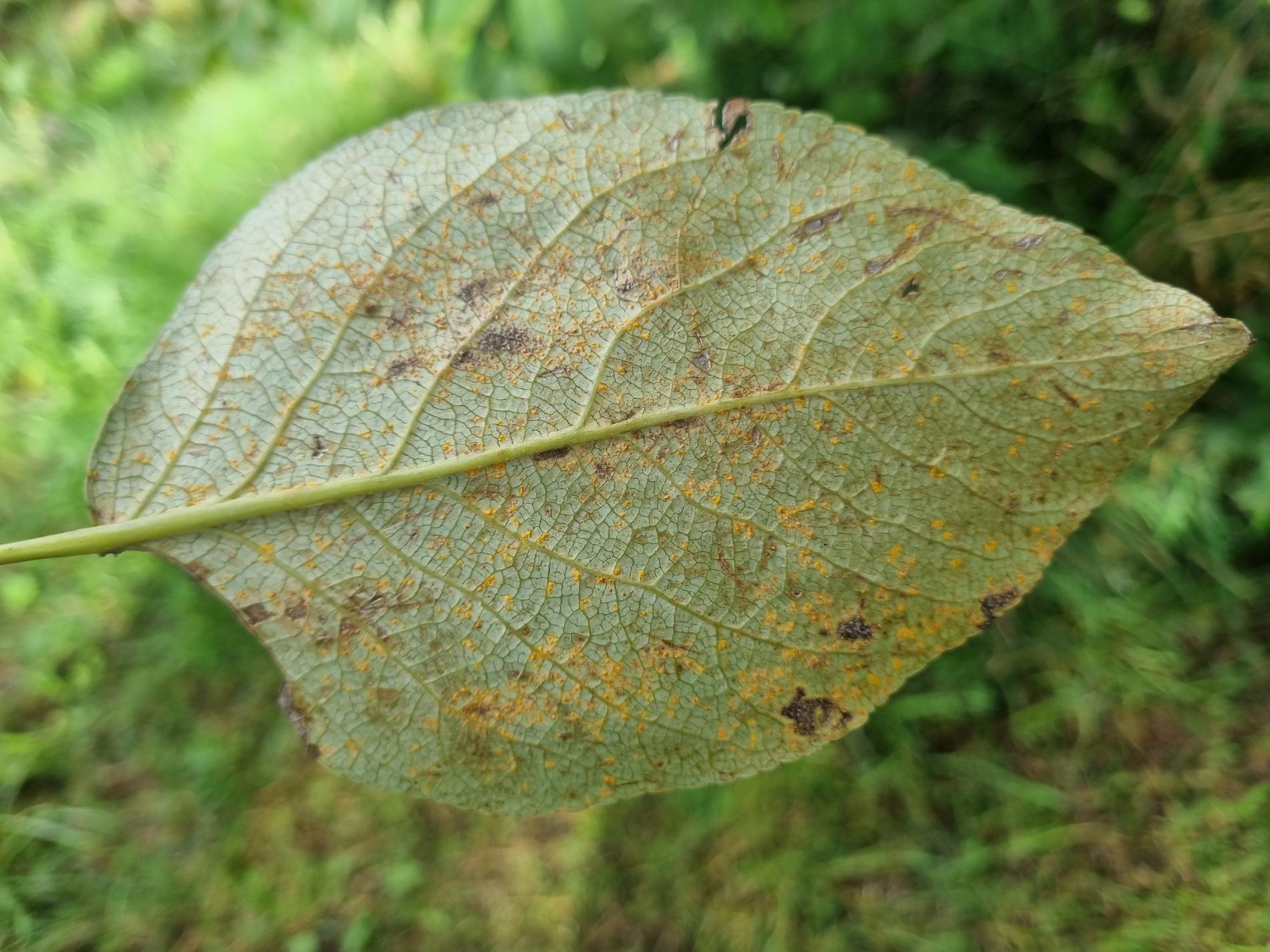 Towards the end of summer and in autumn, on white poplar (Populus alba) leaves are formed telia and in them teliospores. Rust at this stage overwinters on shed leaves. In spring, teliospores germinate and form basidiospores that infect larch needles. Then, spermatogonia and small stacks of orange deposits - aecia - are formed on needles. Aeciospores infect poplar leaves, where firstly are formed yellowish orange uredinia which can repeatedly infect poplar leaves in the course of summer. Later, winter spores, teliospores, are formed on leaves in dark brown to black deposits of spores - telia. Aspen leaves (P. tremula) are attacked by similar rust M. populnea. Disease on larches is not of a practical significance.
