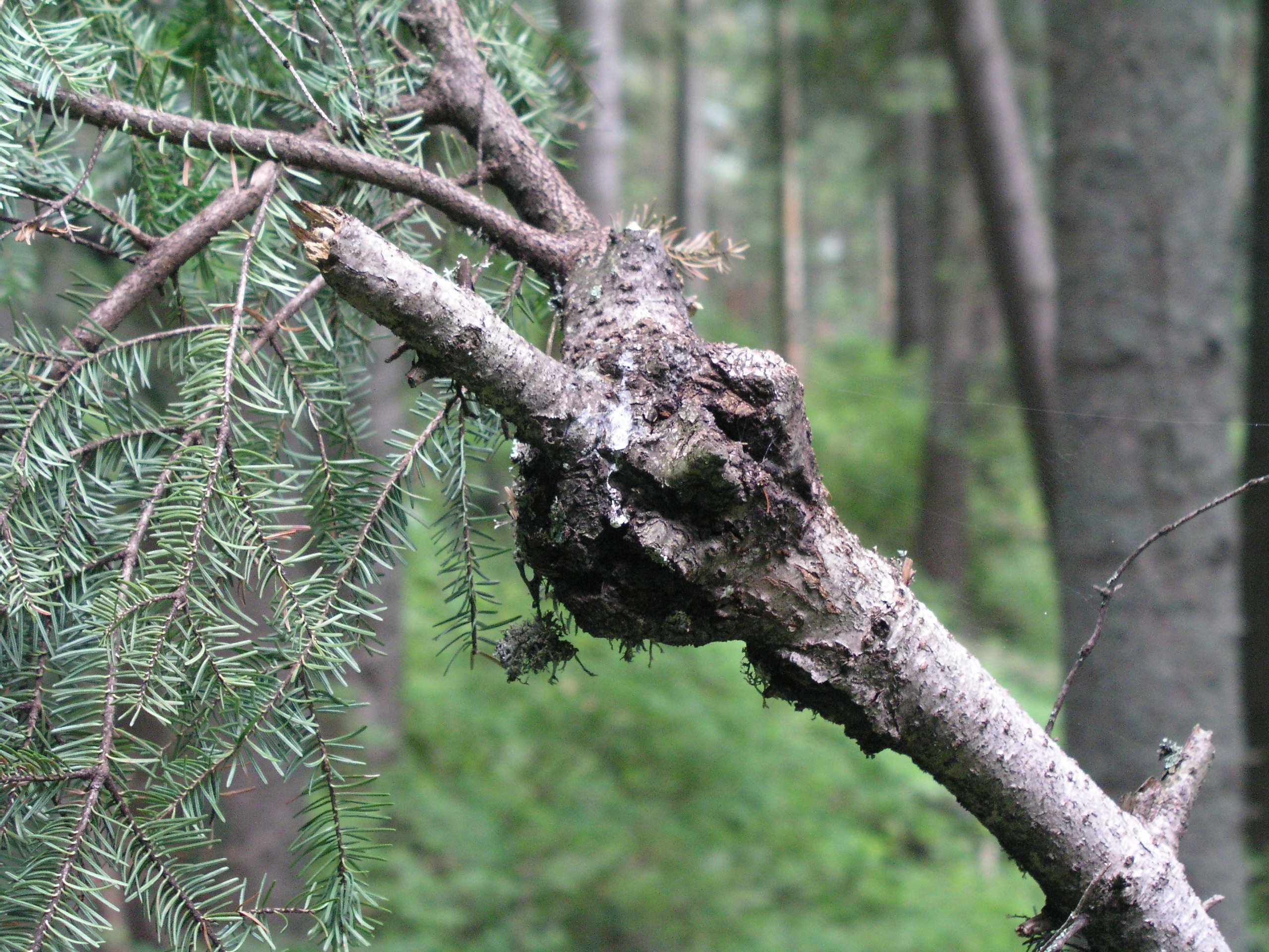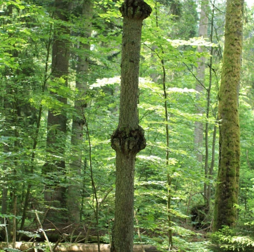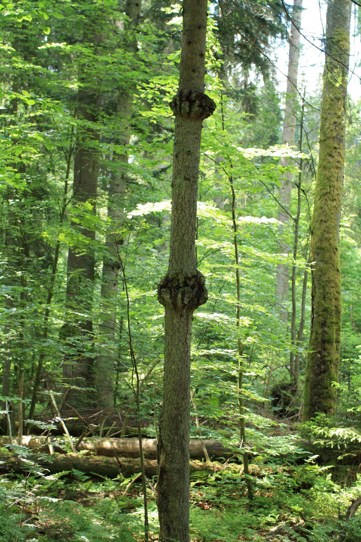 Fir broom rust infects the cambium of fir trees through the bark of young branches and causes cankerous tumors in the shape of nodes and even galls. This neoplasm develops for a few years. If buds are infected by the mycelium, witches’ broom starts to develop. The witches’ broom needles, which are yellowish and shorter, are a host for aecia. In autumn the needles fall. Harmful effects occur mostly after infection of the trunk because the swellings considerably impair wood quality. From the pathological point of view, they are a gateway for wood-damaging fungi. Herbs of the family Caryophyllaceae like Cerastium spp., Stellaria spp., Arenaria spp. and Malachium spp. are an alternate host for the rust.