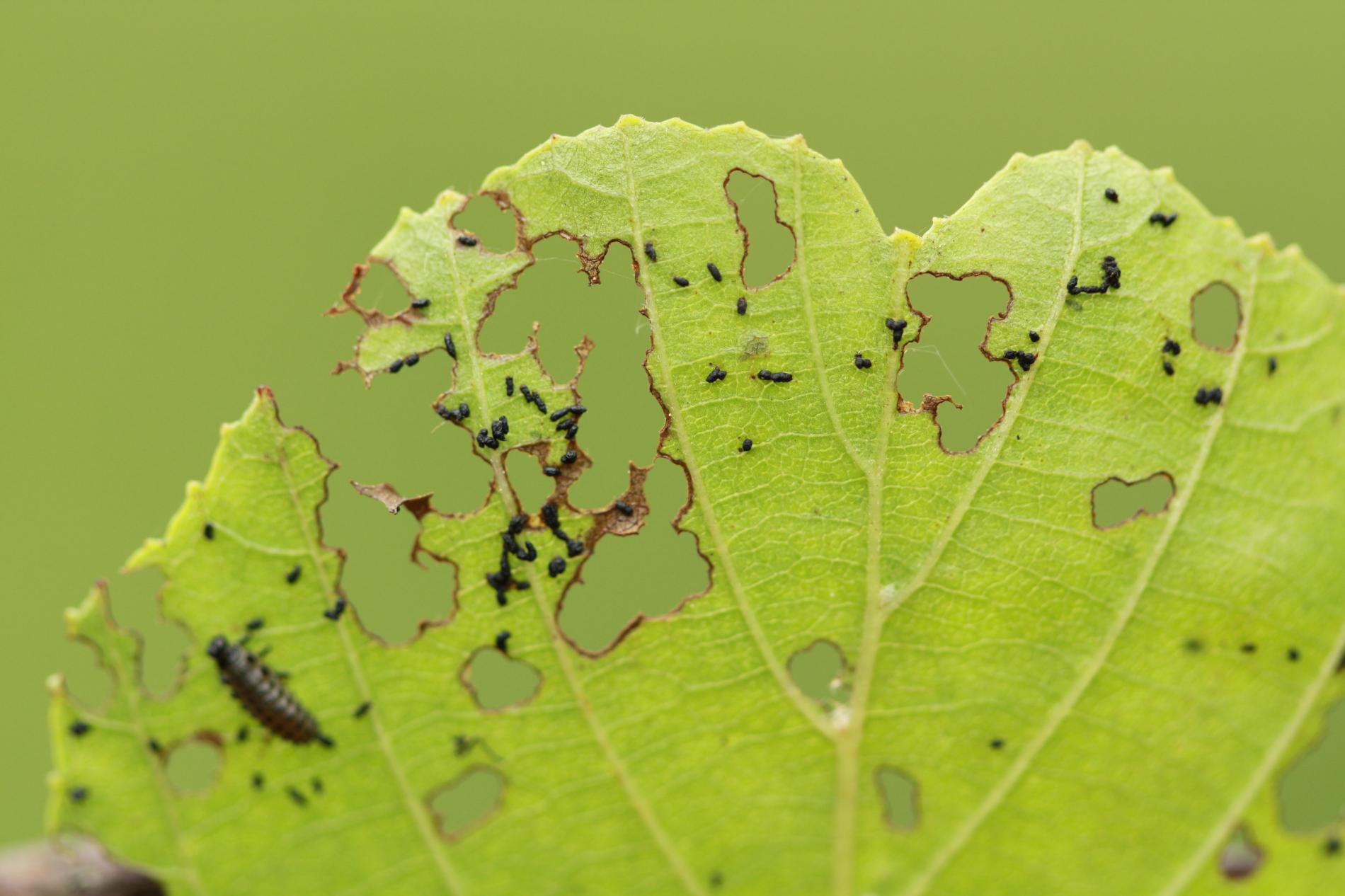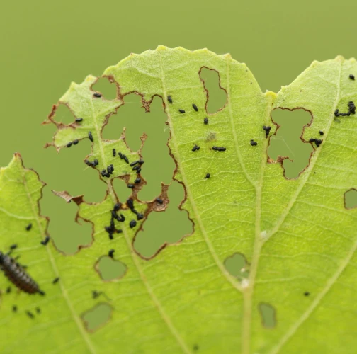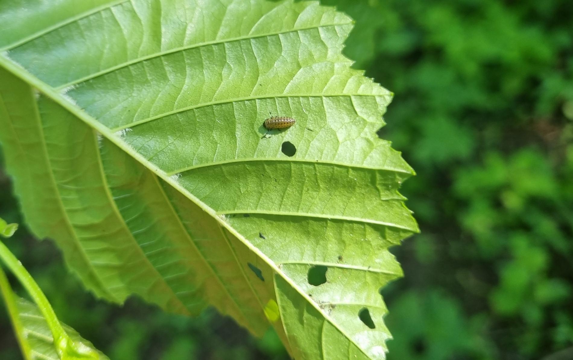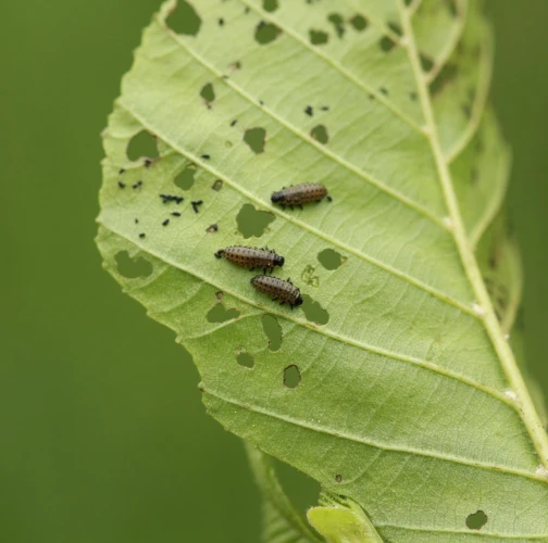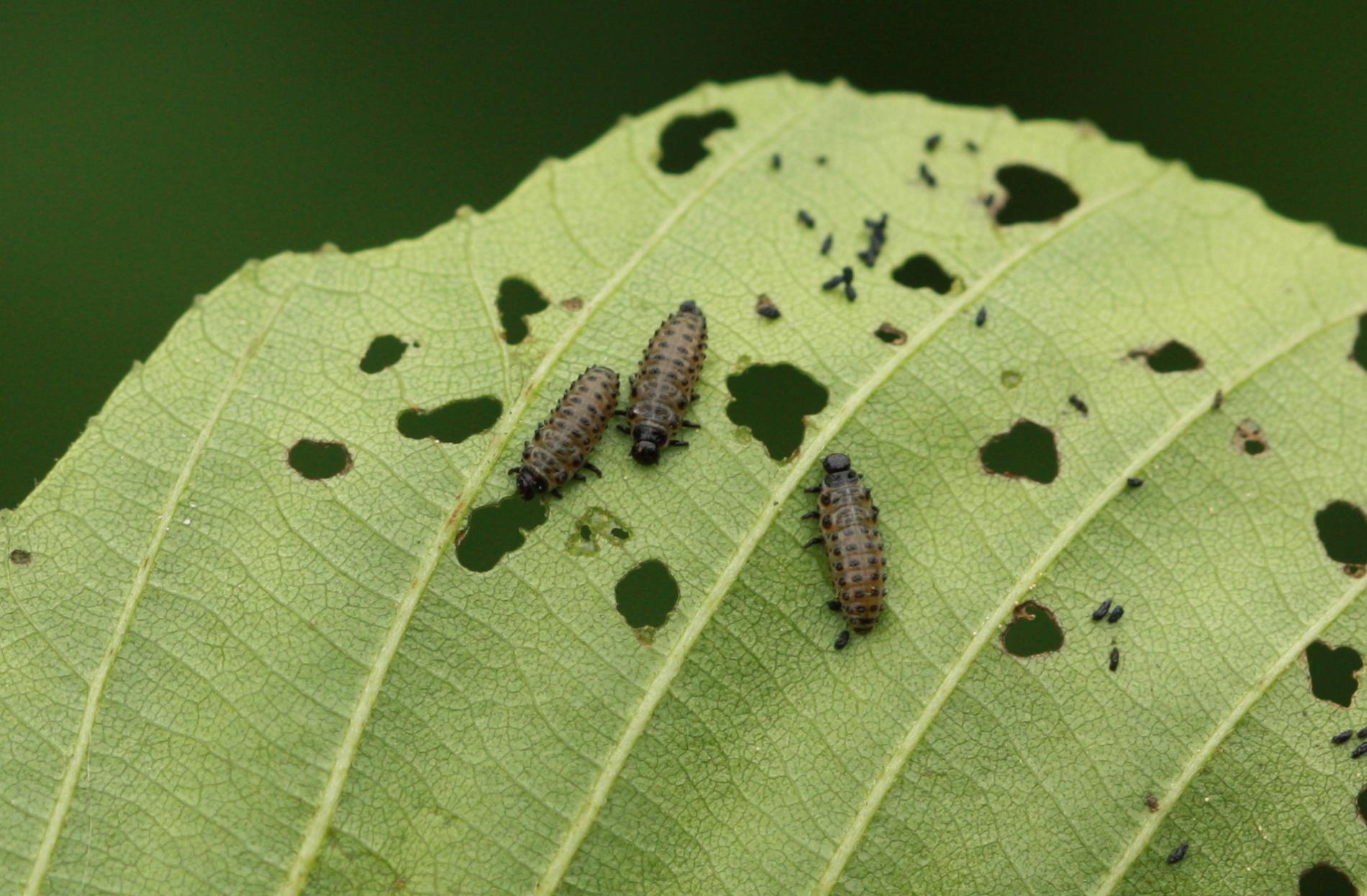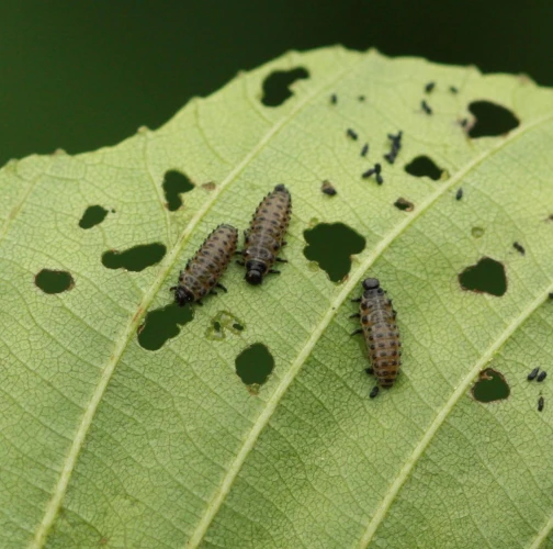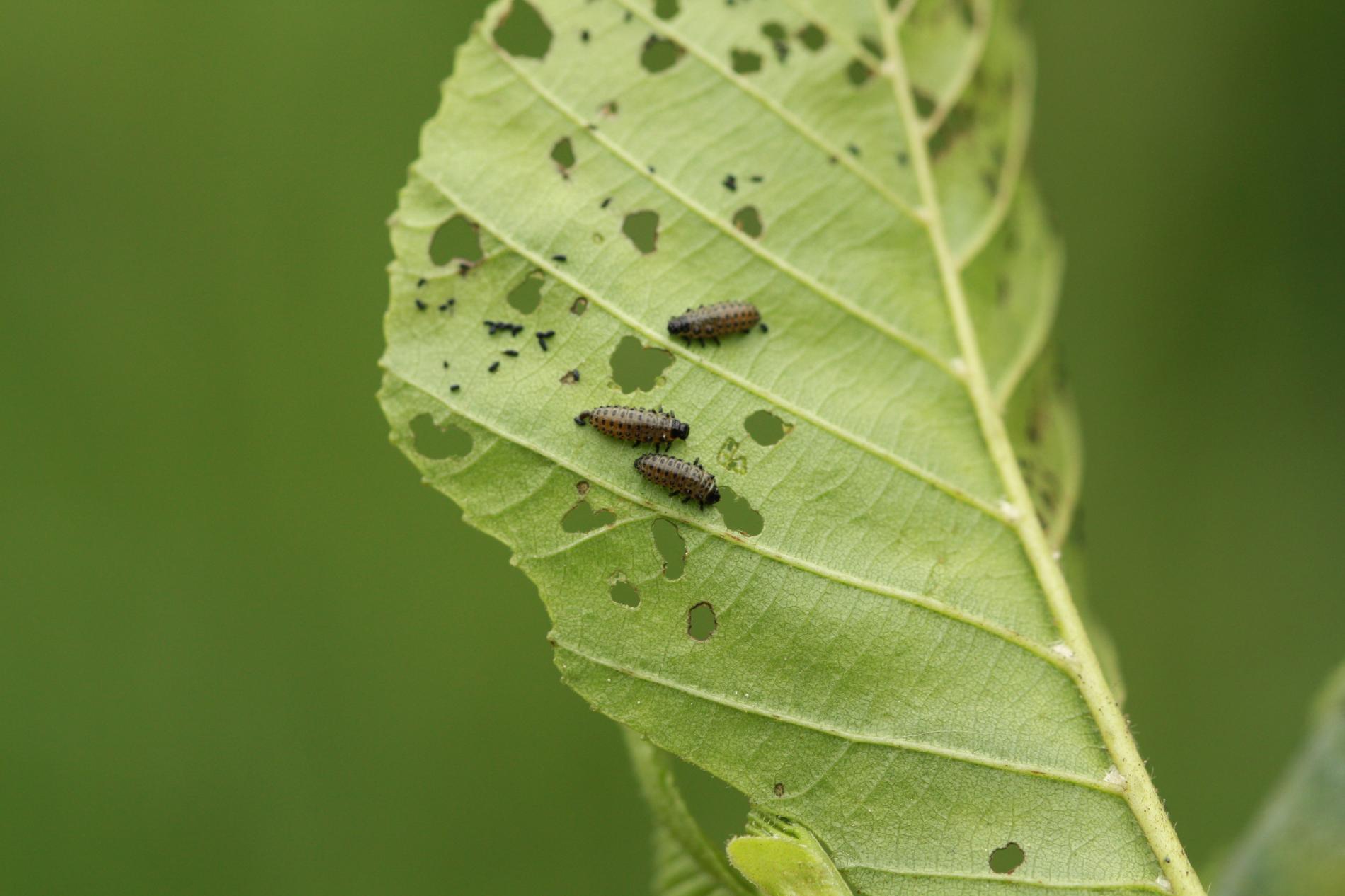Larva and metallic shiny beetles on a leaf. Leaf damage.