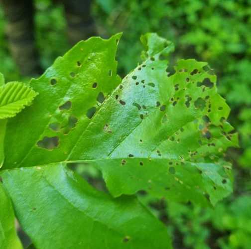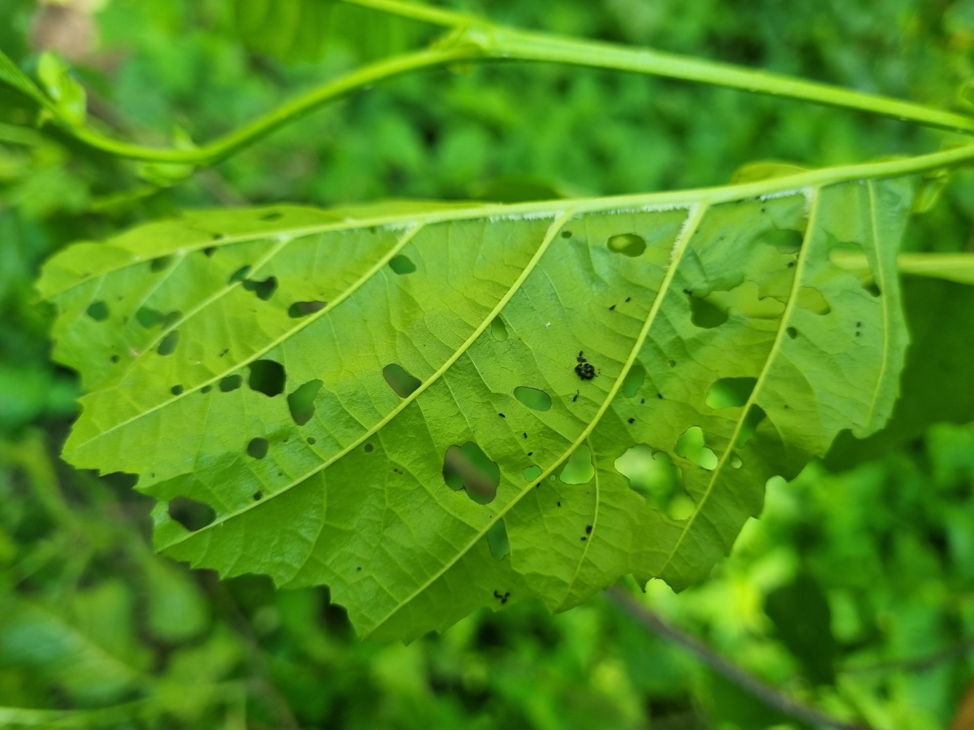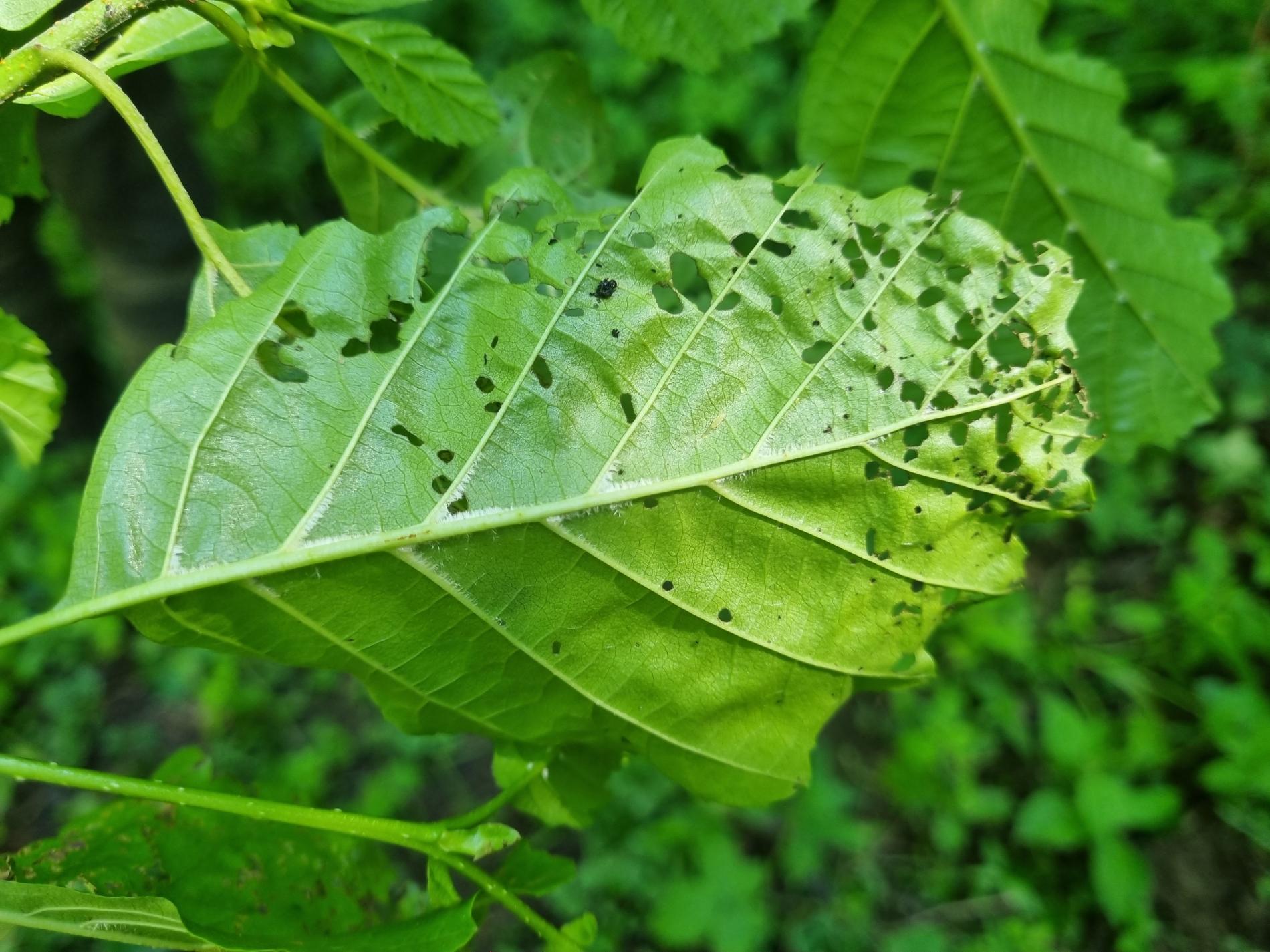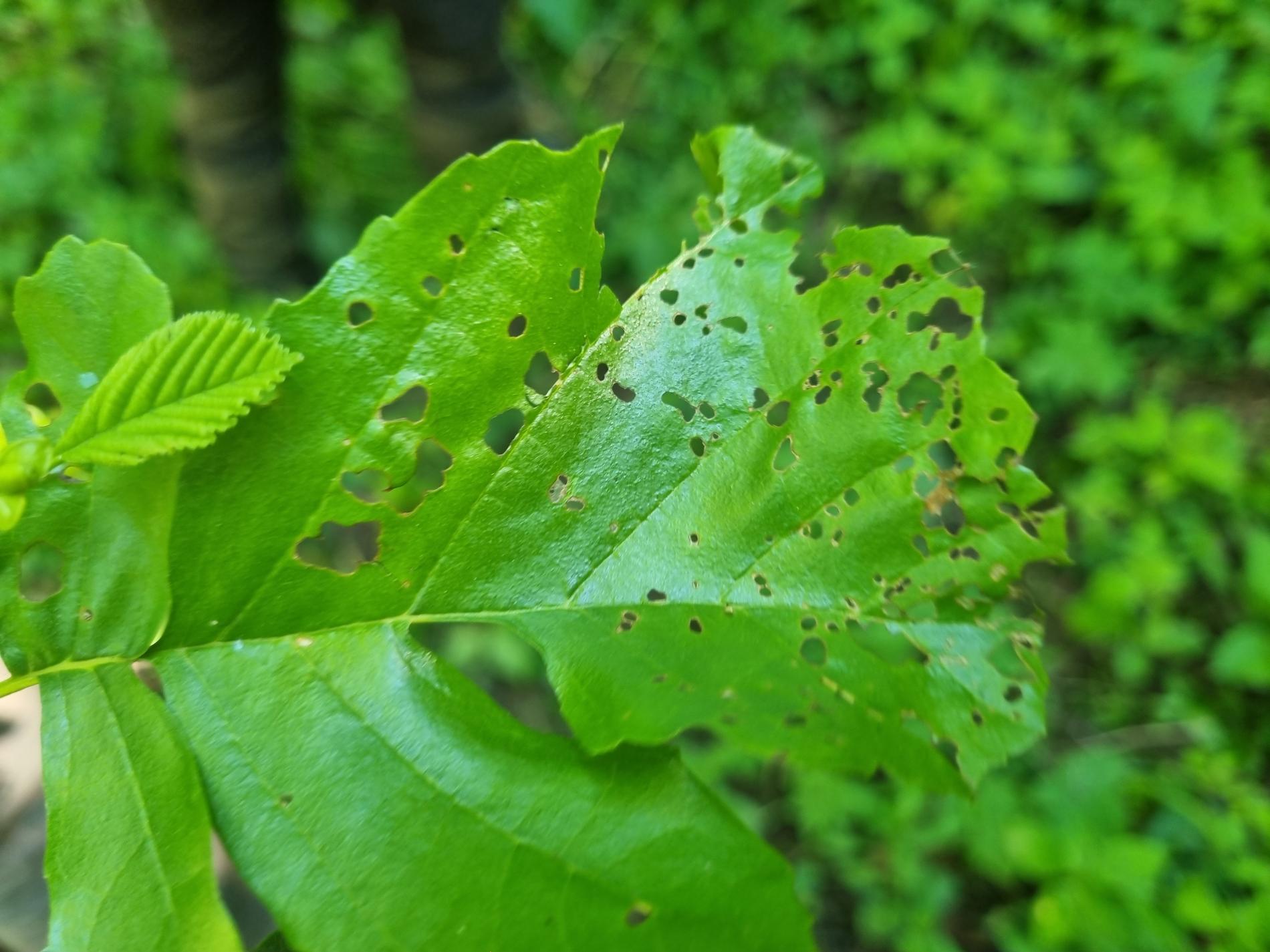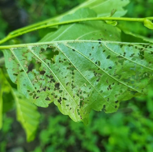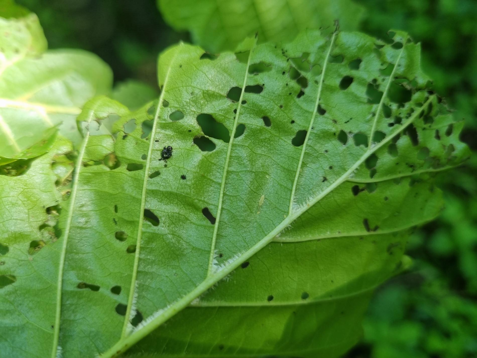 Larva and metallic shiny beetles on a leaf. Leaf damage.