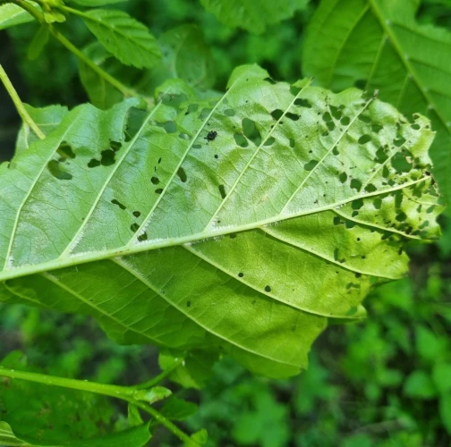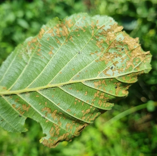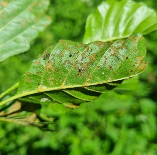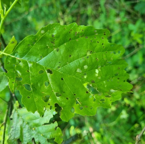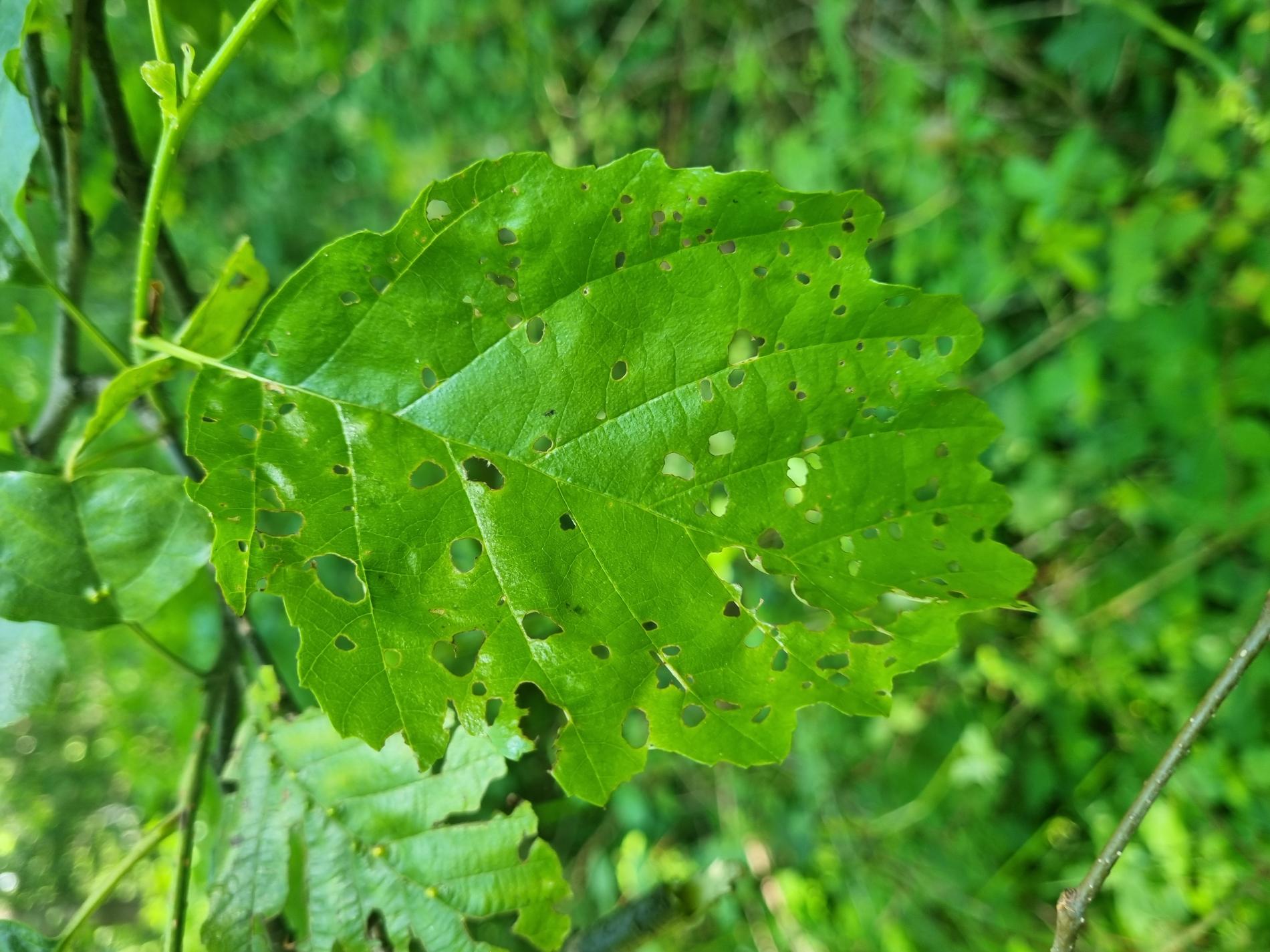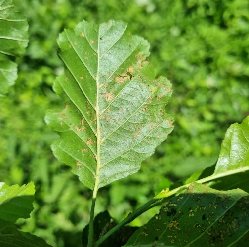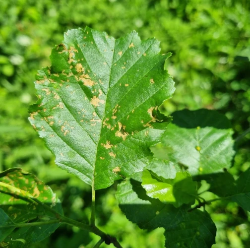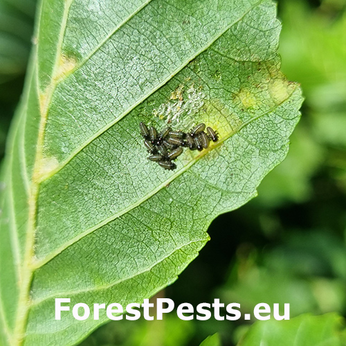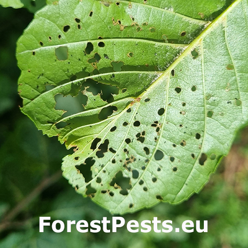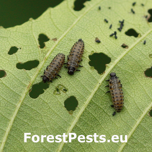 Melasoma aenea, also known as Chrysomela aenea or Plagiosterna aenea, is a species of leaf beetle that can cause damage to alder trees. These beetles typically feed on the leaves of alder trees, which can lead to defoliation and reduced vitality of the affected trees. The adult beetles are metallic green or bronze in color and about 8 to 12 millimeters long. They lay their eggs on the leaves of alder trees, and the larvae that hatch from these eggs feed on the foliage. The larvae can cause significant damage if present in large numbers. The feeding activity of Melasoma aenea larvae can result in the skeletonization or complete defoliation of alder leaves. This can weaken the affected trees, making them more susceptible to other stresses such as drought, disease, or other insect infestations. Alder trees play an important ecological role, especially in riparian areas, providing habitat and food for various organisms. Therefore, extensive damage caused by Melasoma aenea can have negative ecological impacts.