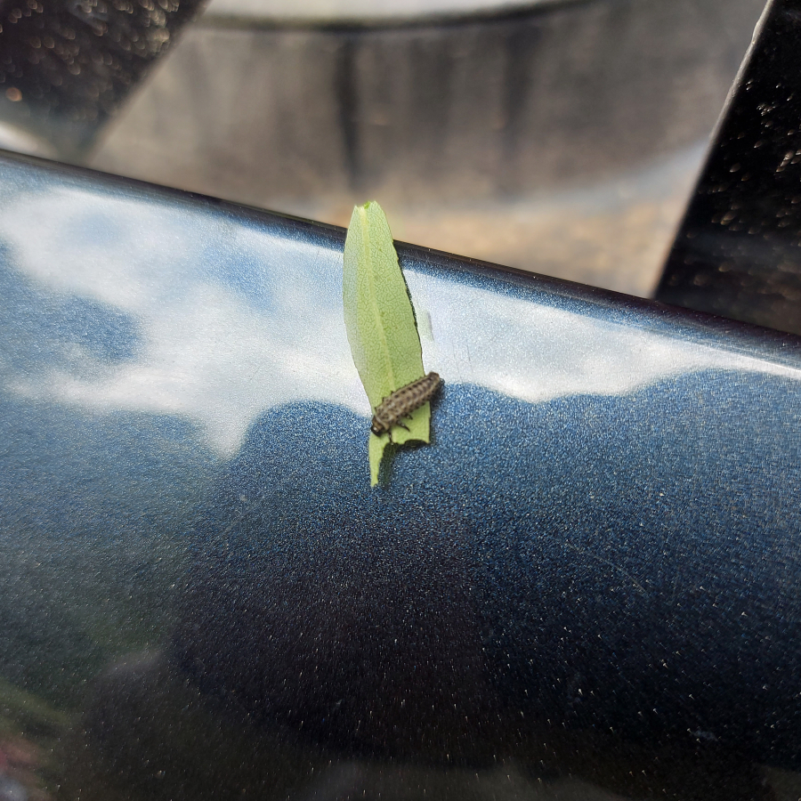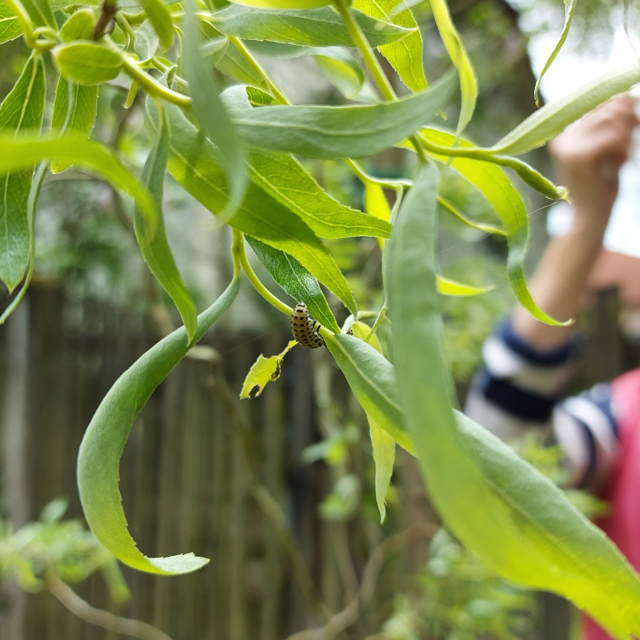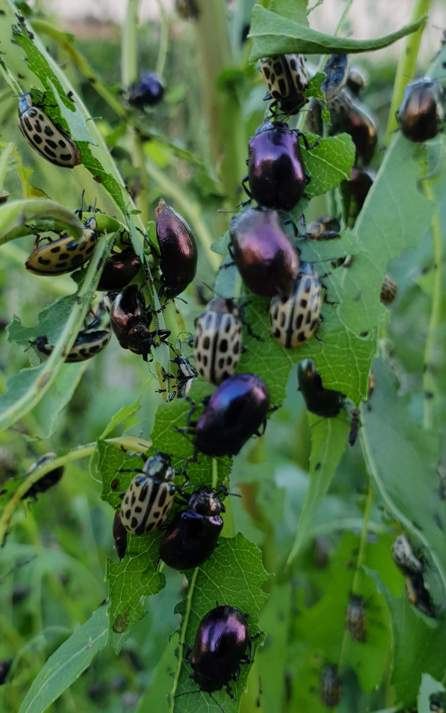 There are black larvae on the leaves. The leaves are twisted, dried and often punched or completely missing. Many yellowish beetles with black dots are present.