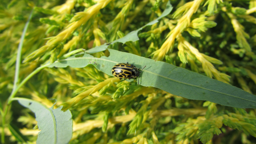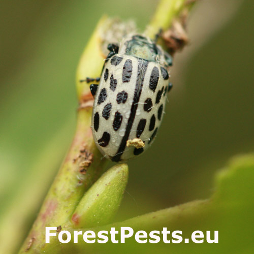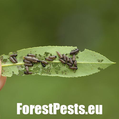 Elytra of the beetle are yellowish with 10 longitudinal black spots. Both larvae and adults feed on the leaves of Salicaceae. The imago overwinters in litter. In spring, the female lays eggs on leaves which hatch into leaf chewing larvae about 2 weeks later. The larvae are 10 mm long, with longitudinal series of black spots. They live together on the lower side of leaves. Skeletonizing and lateral damage occur on leaves, which often begins from an apical part. Larvae pupate on leaves. It often causes an outbreak riparian willow stands.
