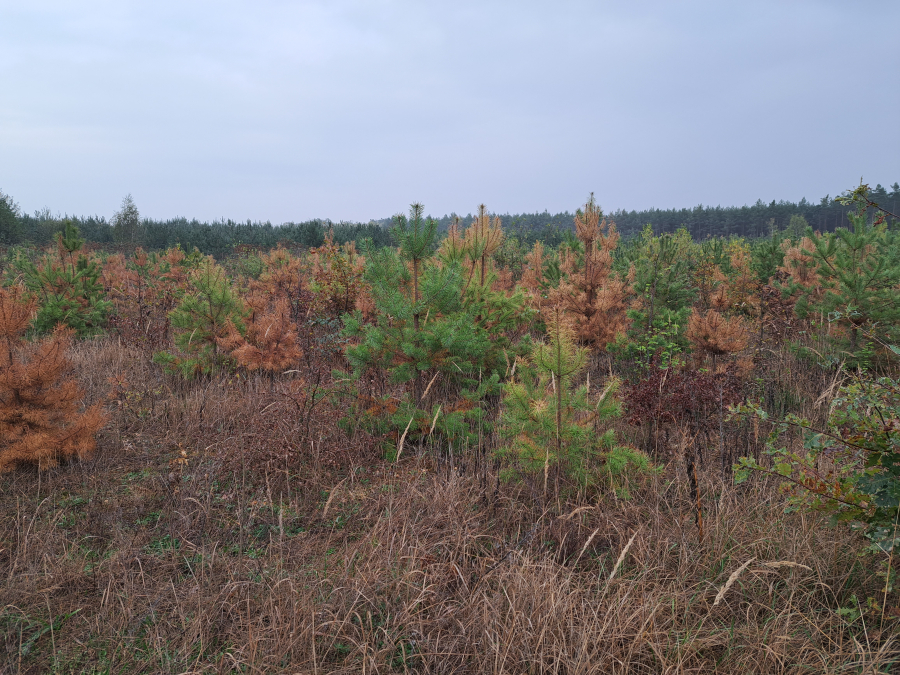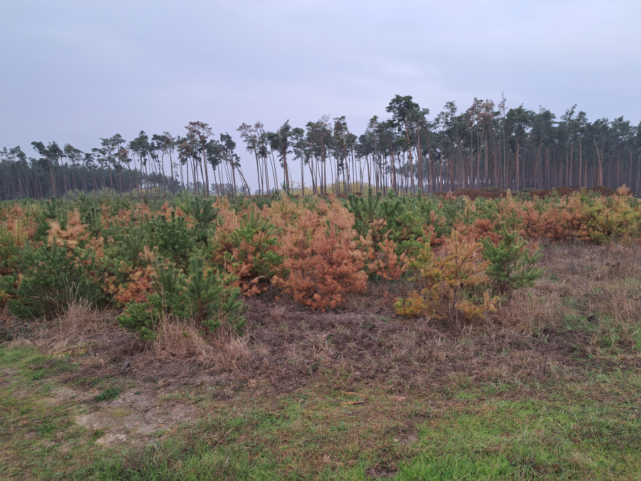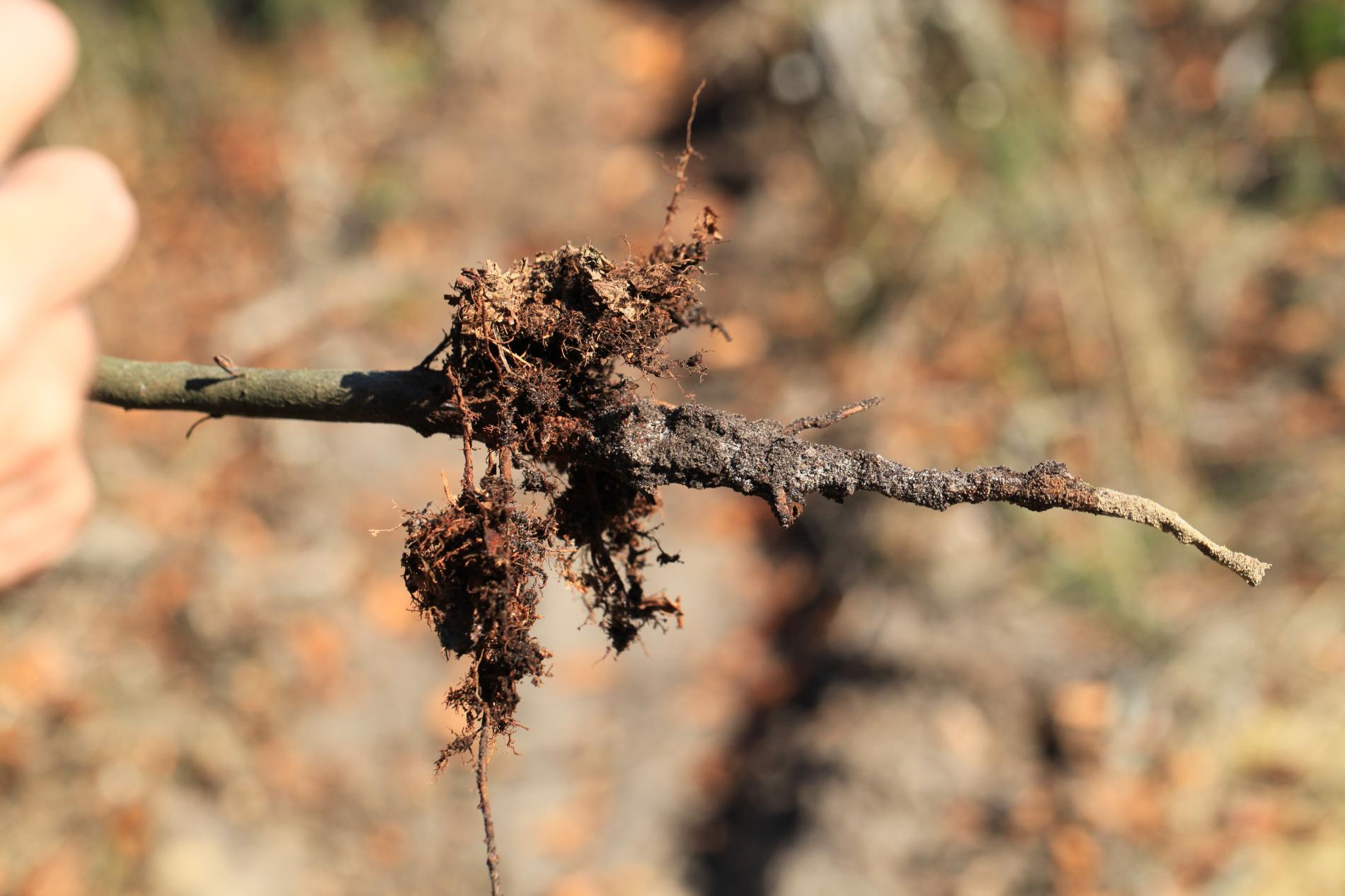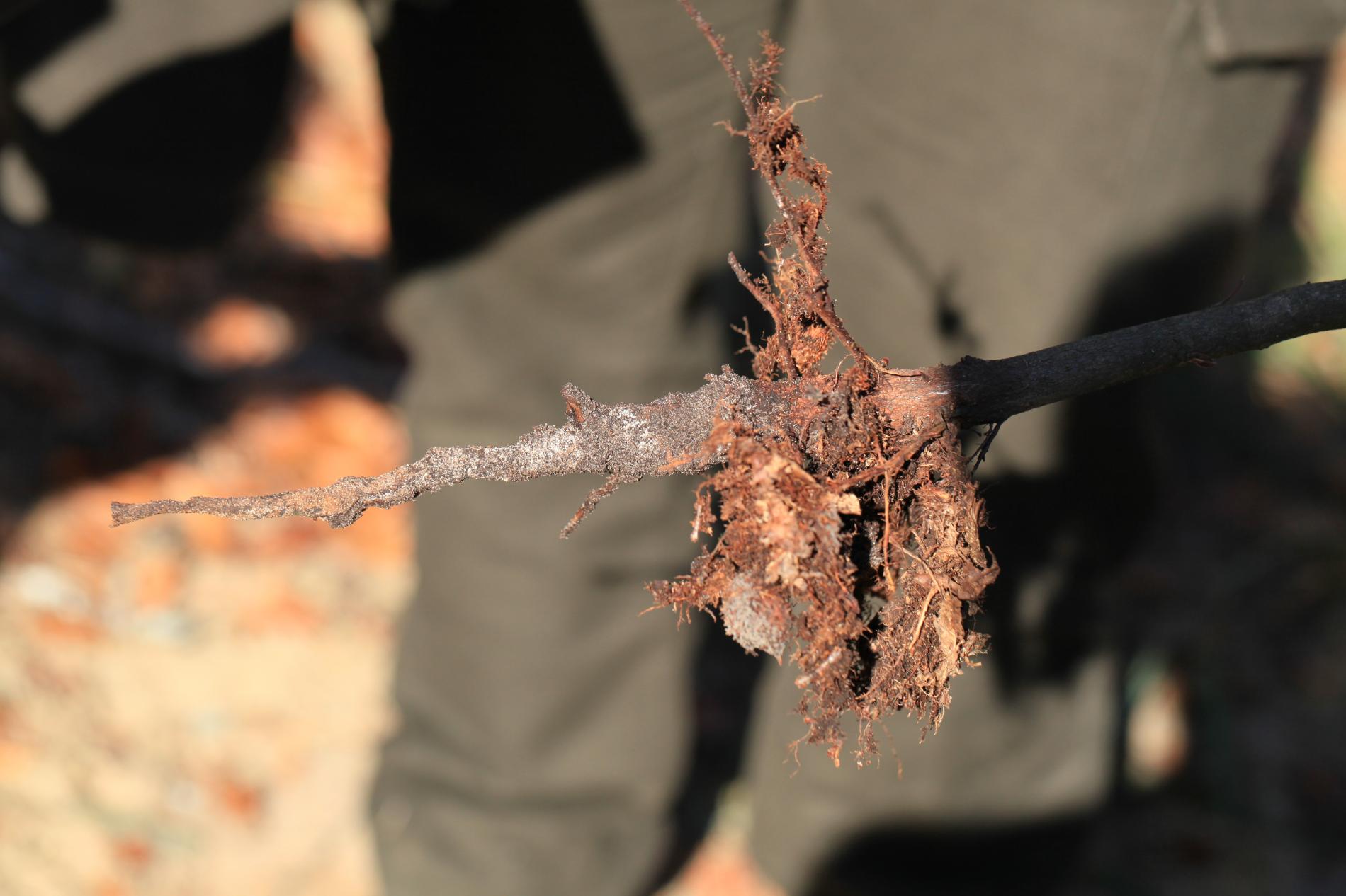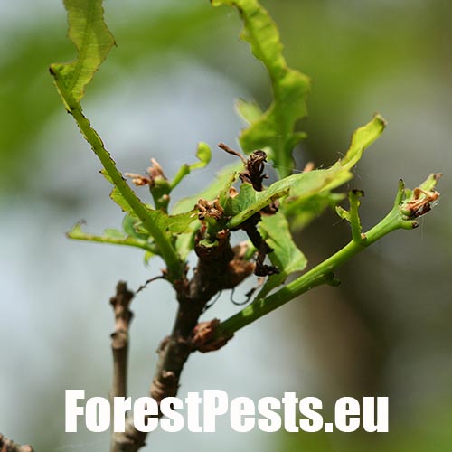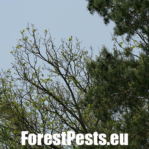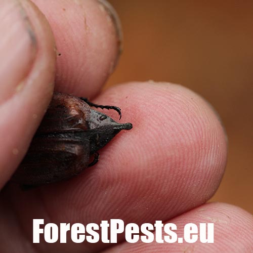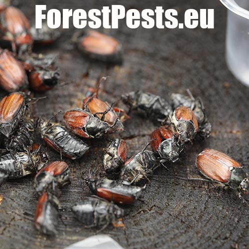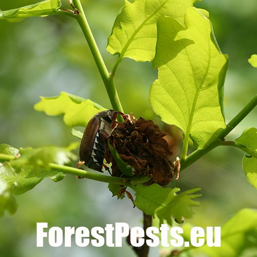 Adults of the common cockchafer reach sizes of 25-30 mm; the forest cockchafer is a bit smaller 20-25 mm. Both have a brown colour. The lower part of their abdomen is black and white. The two species can best be distinguished by the form of their pygidium (the back end) - it is long and slender in the common cockchafer, but shorter and knob-shaped at the end in the forest cockchafer. Adults swarm towards the end of April and in early May. They fly to broadleaved forest edges where they perform maturation feeding. After that, the females lay eggs into the soil. Chafer grubs hatching from the eggs feed on herb and bush roots. They cause the most serious damage to pine seedlings whose roots are damaged so that only parts thicker than 2-4 mm are left. All the smaller roots are missing. The grubs develop for 3-4 years. Both species are abundant throughout Europe and are serious pest mainly in the periodical years of mass occurence.