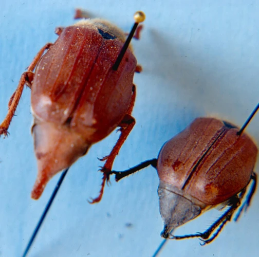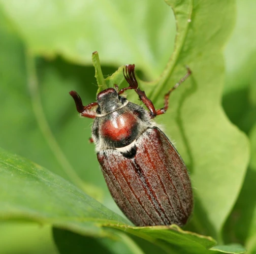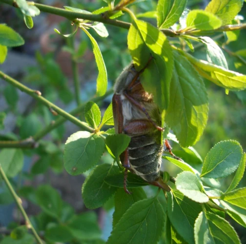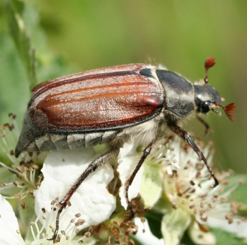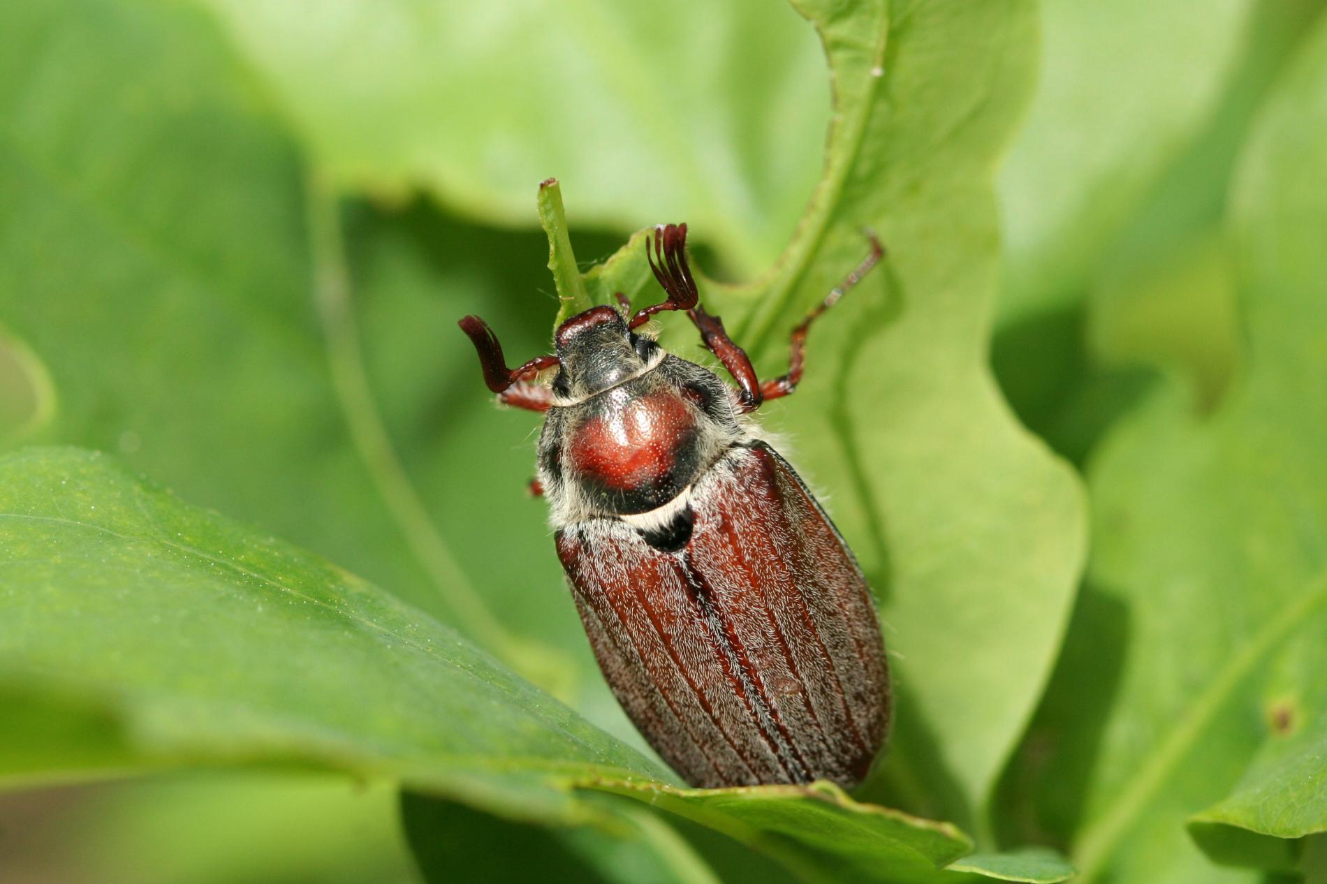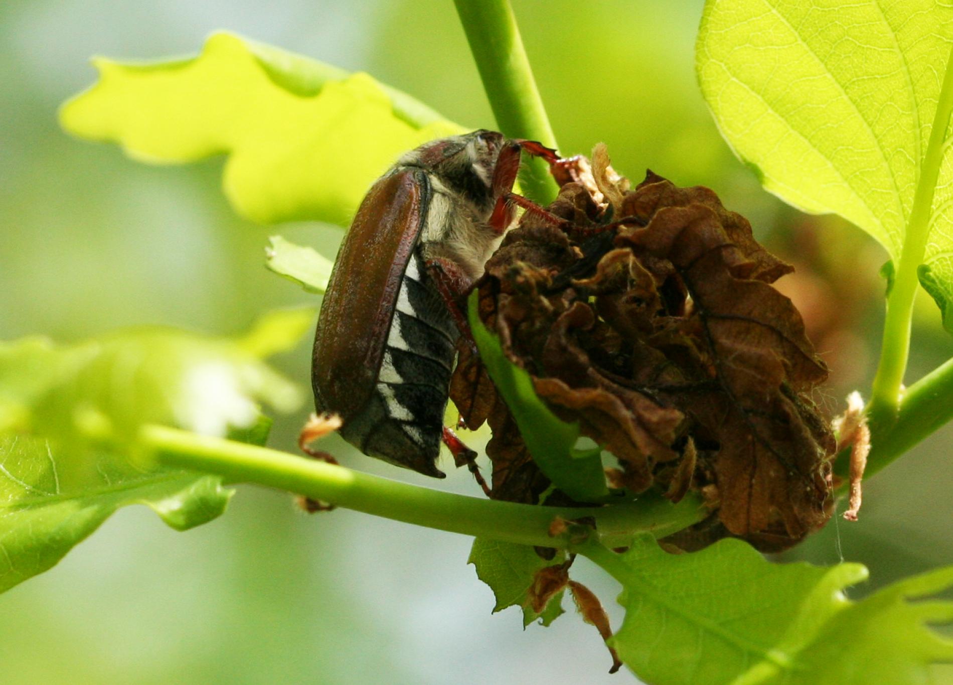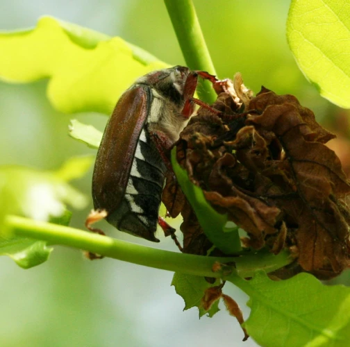 This is a beetle about 20-30 mm long. The ventral side of the abdomen is black and white. The adults swarm towards the end of April and in early May. They fly onto broadleaved stand edges. Adults perform maturation feeding on leaves. They are active especially at twilight. During the day, they rest motionlessly on the leaves or twigs. Their feeding is usually concentrated on the stand edges and treetops. During outbreak they can cause defoliation. After mating, the females lay eggs into the soil. From the eggs hatch grubs which feed on herb and bush roots. Grub development takes 3-4 years. The pest prefers stands at an altitude up to 600 meters above sea level.