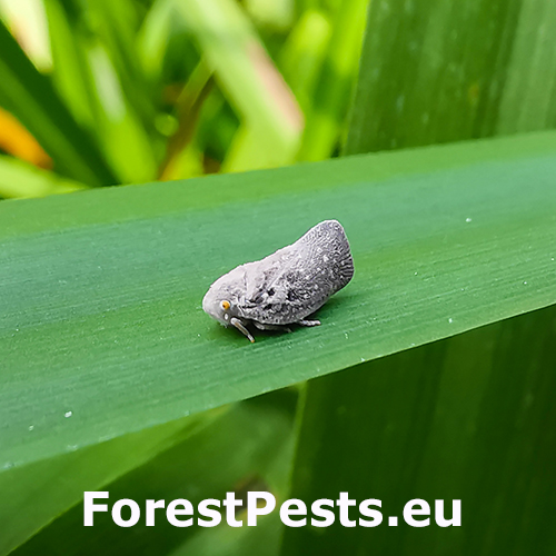 Adults of M. pruinosa are 5 to 8 mm in length. The color varies considerably from brown to gray. A characteristic pair of dark spots is located in the basal half of each forewing. Adults, but especially larvae and nymphs, are covered with a white epicuticular wax (hence the Latin name pruinosa, meaning frosty). They can be found from mid- July until late Autumn, feeding on plant sap in aggregations of many individuals.