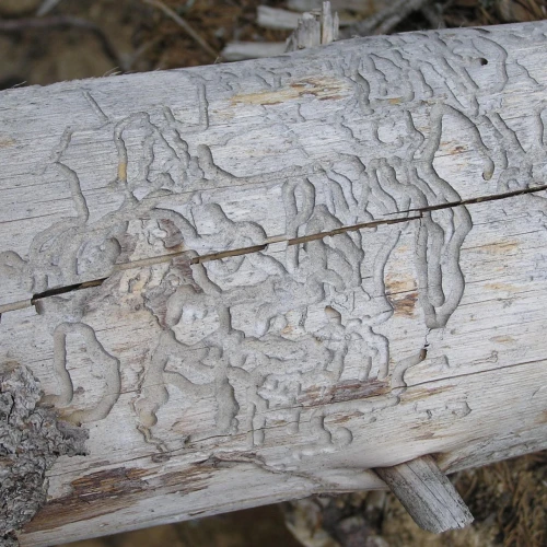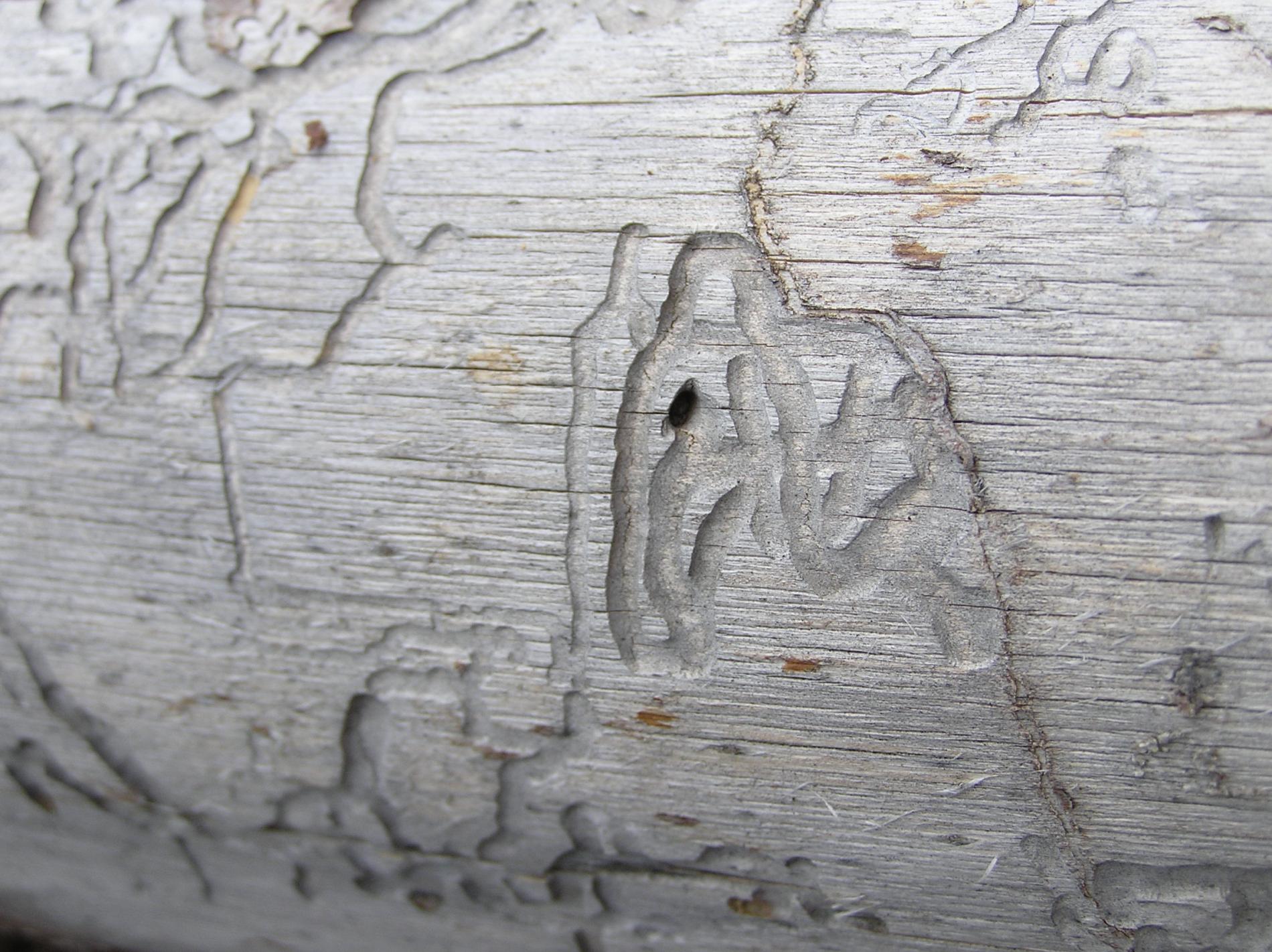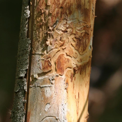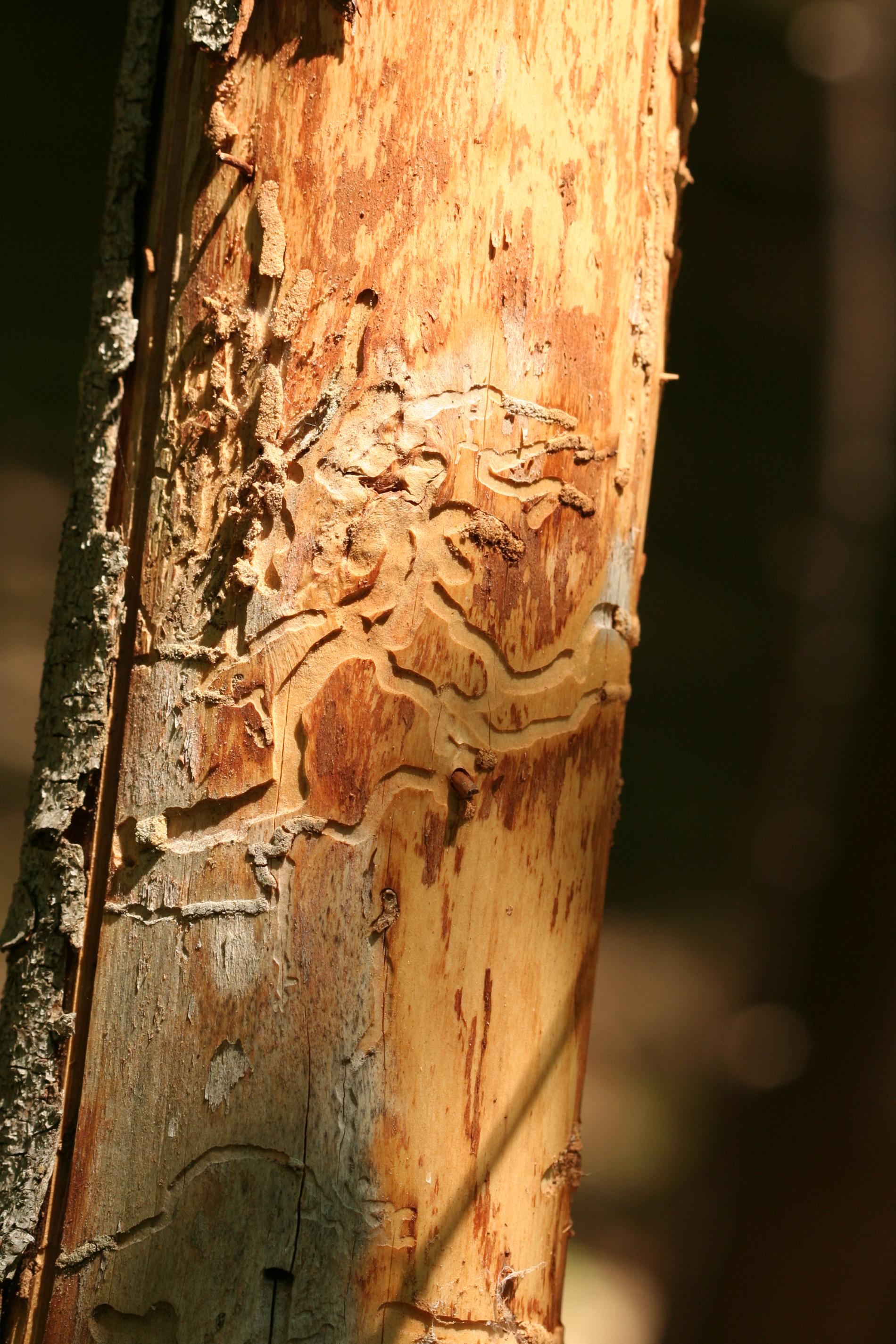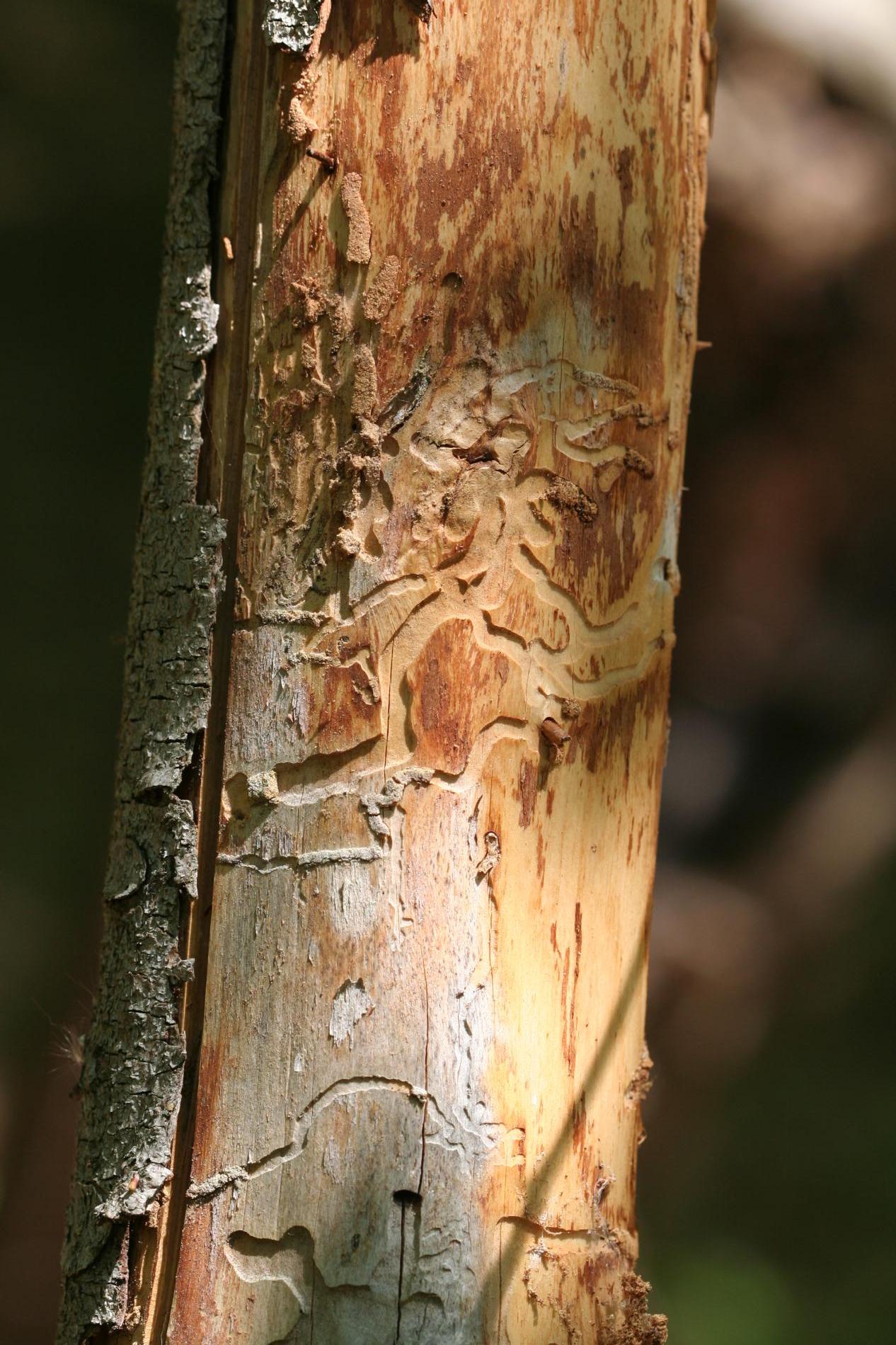 Flat, curved galleries 5-10 mm wide appear beneath the bark, filled with frass. Pupal chambers are located in the sapwood, 1-4 cm beneath the surface. Galleries often feature sharp margins.