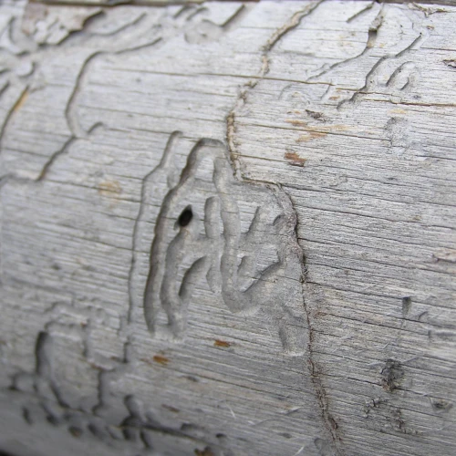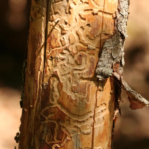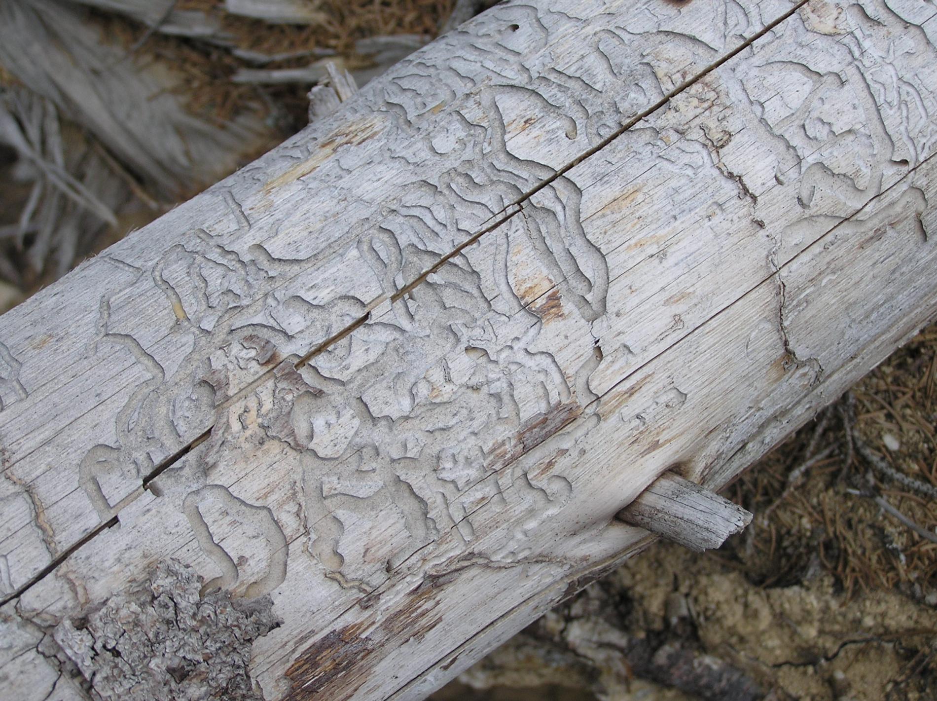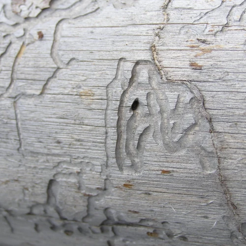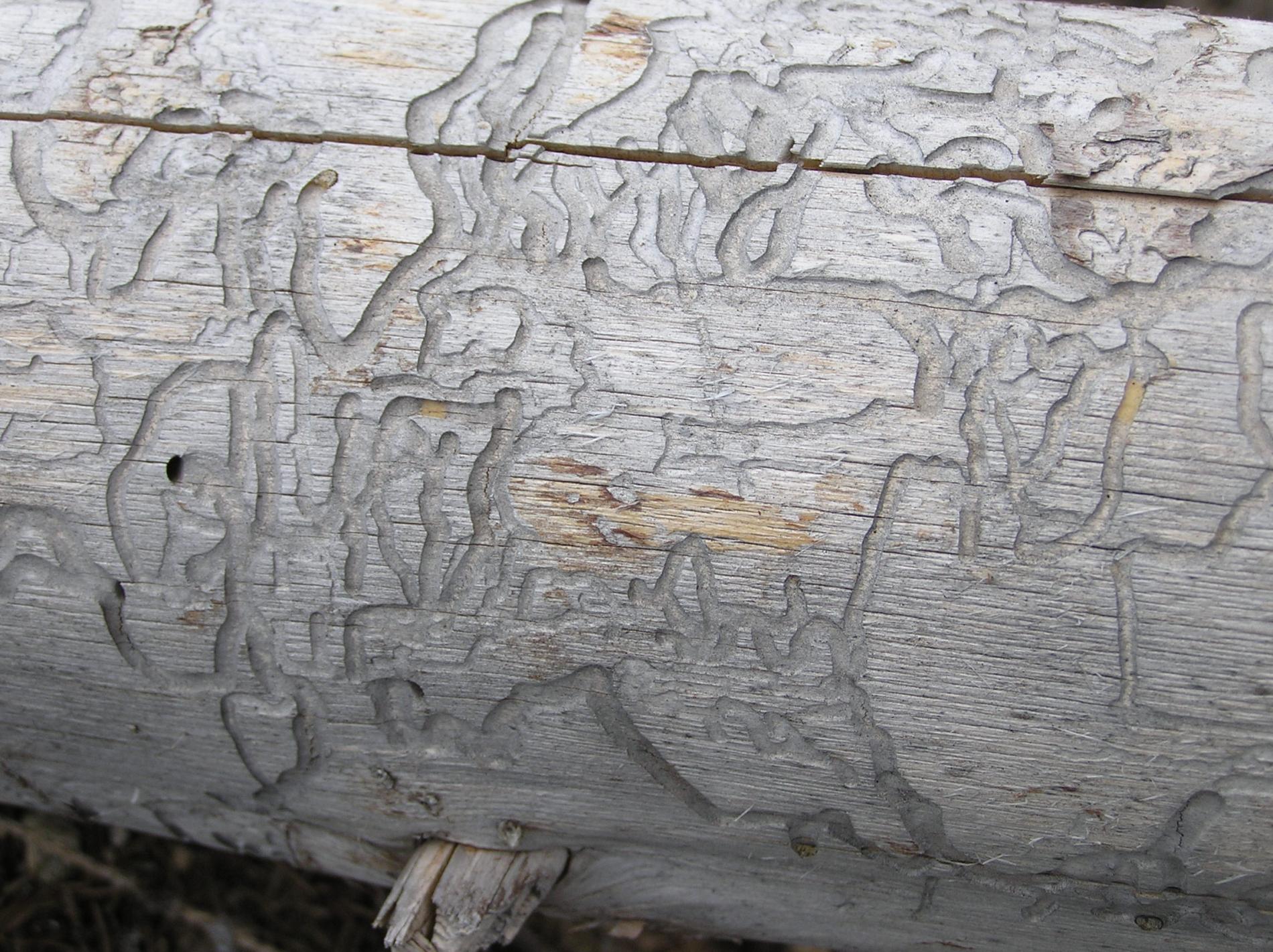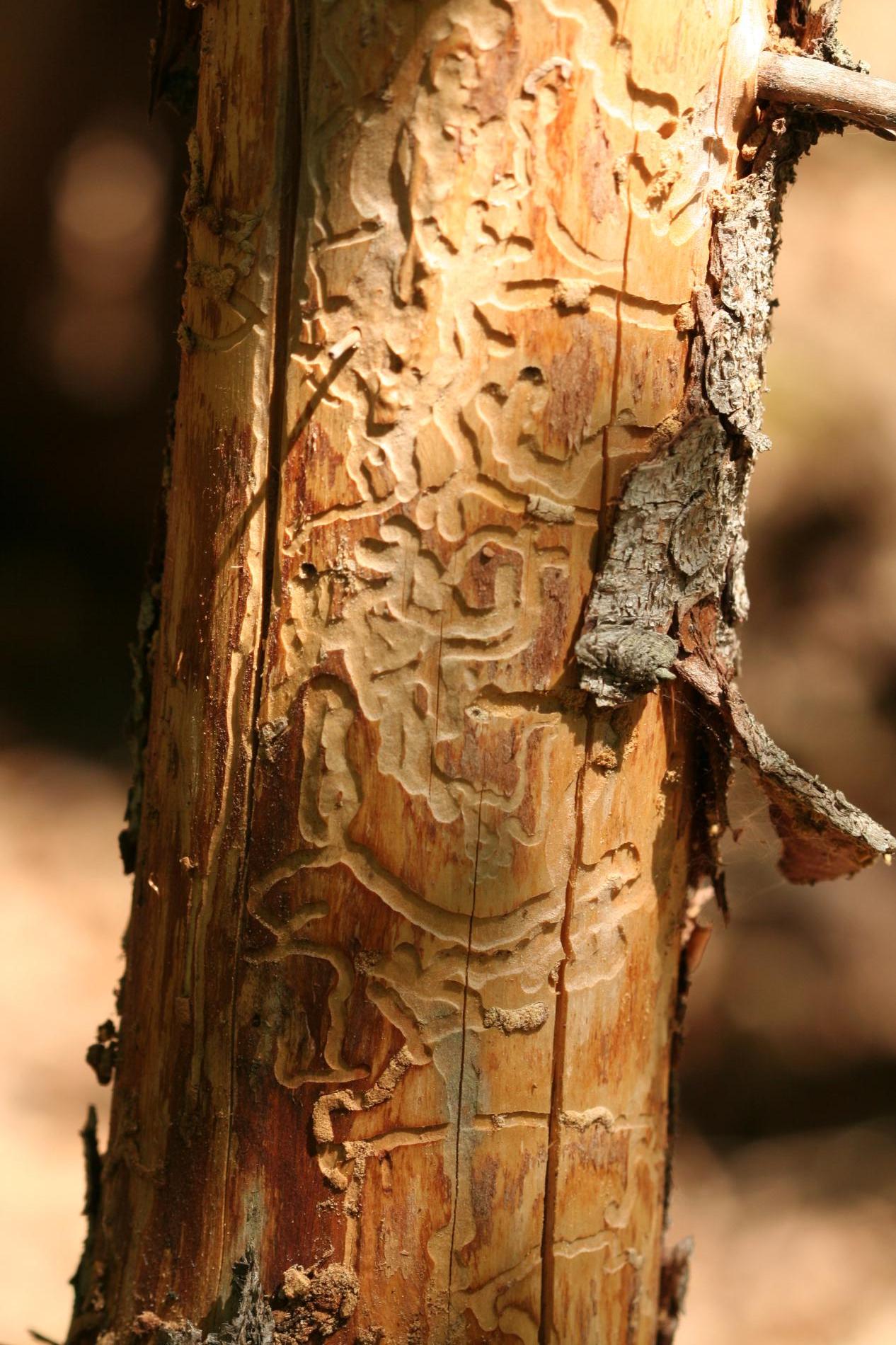 Flat, curved galleries 5-10 mm wide appear beneath the bark, filled with frass. Pupal chambers are located in the sapwood, 1-4 cm beneath the surface. Galleries often feature sharp margins.