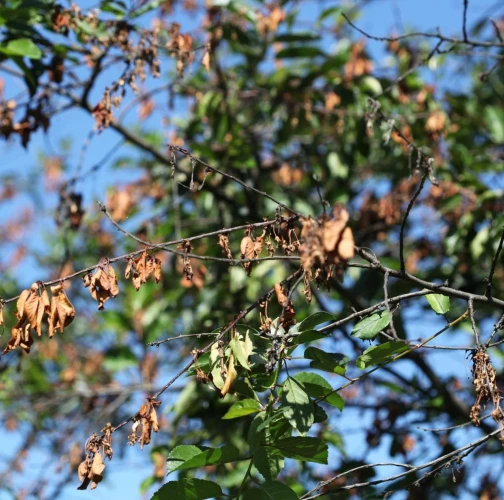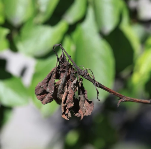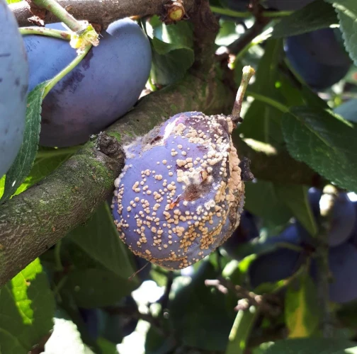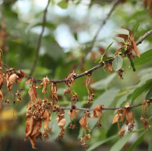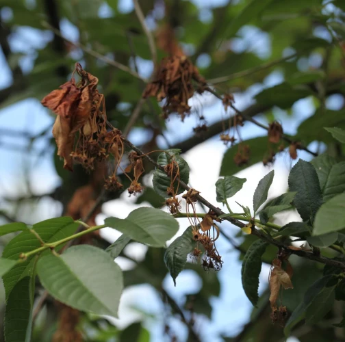 Moniliosis of stone fruits affects apricots and cherries. It attacks the flowers it infects in the spring and then the infection gets into twigs and branches. The disease is stronger in years with rainy and cold spring weather. Therefore, the intensity of moniliosis varies from year to year. A glucose flow appears at the sites of the infected and healthy part of the shoots. The infested branches dry and the fruits fall off. The overall condition of the trees is reduced.