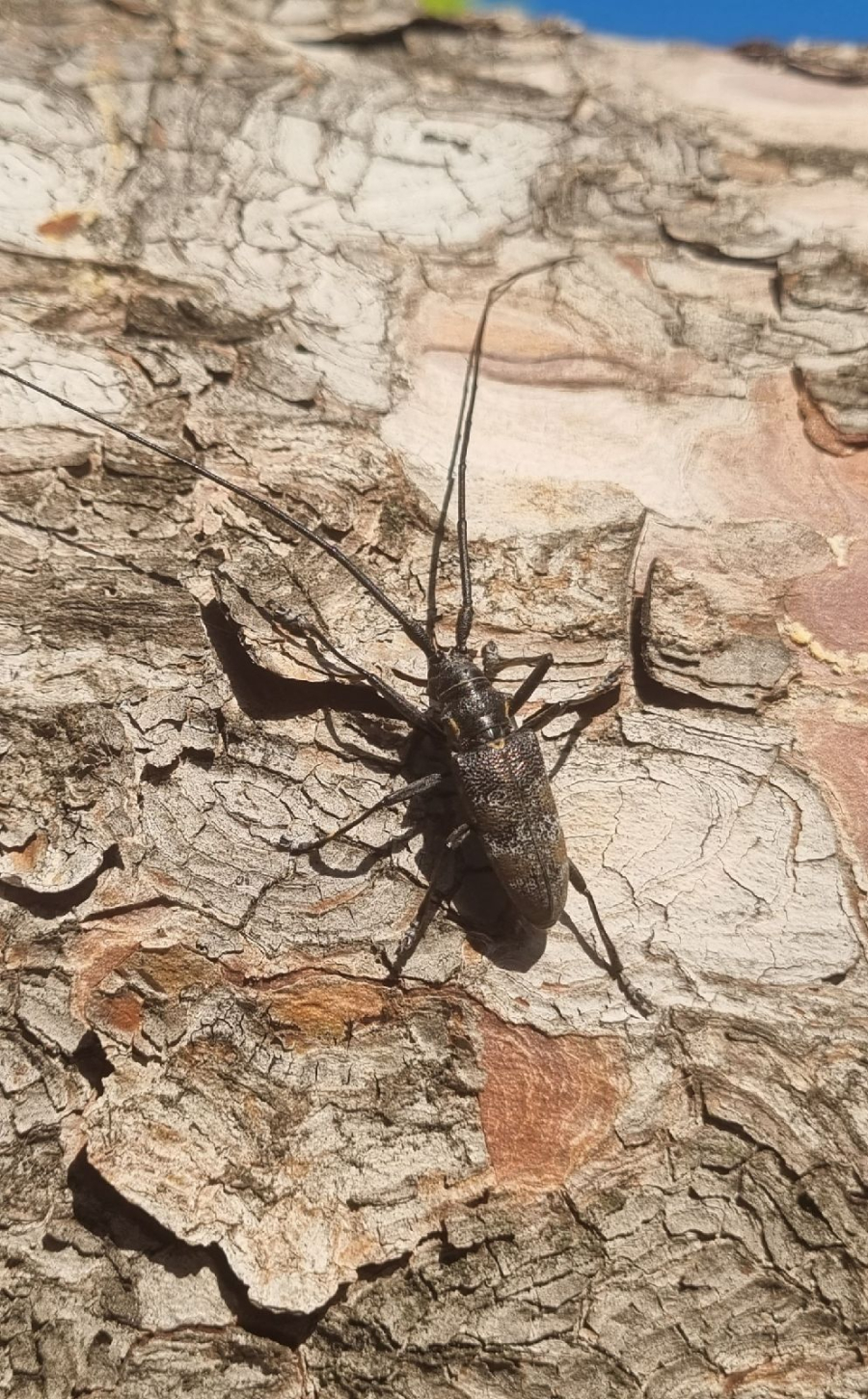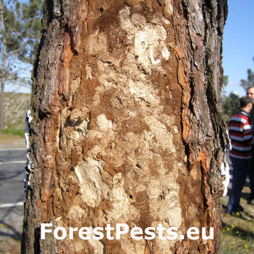 It is a longhorn beetle. Adults are brown black, 15 up to 25 mm long. The eggs are deposited in slits excavated by the females in the bark of suitable hosts and the newly-hatched larvae develop in individual galleries in the phloem before entering into the xylem, where they built a linear gallery ending in a pupal chamber from where the adults emerge through a perfectly round-shaped hole (5-7 mm in diameter). They are also capable of living on thin twigs, where they feed on the core creating a few centimeters long gallery before pupating. Infestation can be severe. Infested logs are easy to identified by the white debris on the top. The adults maturation feeding can damage the twigs. It was recently found to be the vector of the pathogenic pine wood nematode Bursaphelenchus xylophilus.