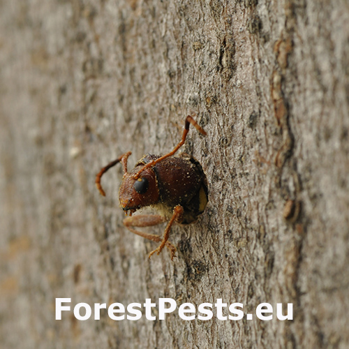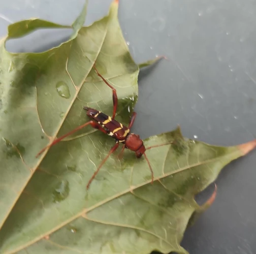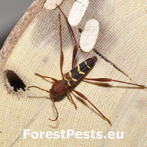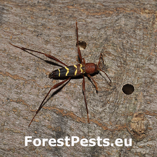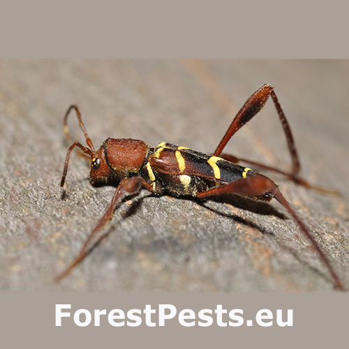 Neoclytus acuminatus, commonly known as the redheaded ash borer, is a species native to North America, including the United States and Canada. It is not native to Europe. This beetle is part of the Cerambycidae family and is known for its distinctive appearance and its larvae, which bore into dead or dying hardwood trees. Neoclytus acuminatus, or the red-headed ash borer, was first reported in Europe around 2008. It has been introduced accidentally, likely through the international trade of wood products. Since then, it has been observed in several European countries, where it has adapted to local environments and is considered an invasive species. Neoclytus acuminatus  is aroung 8–16 mm long beetle. The redheaded ash borer is a slender, agile beetle with long legs. Head and thorax brick-red colour, elytrae reddish-brown with 4 slim transversal yellow bands. Adults are easy to spot moving on timber stacks, but leave quickly if disturbed. They attack only declining or freshly dead/felled trees. Healthy trees, as well as dried wood, are neglected. Larvae feed initially under bark; later excavate tunnels in the wood. Adults emerge from circular holes, often in great numbers. It feeds on a wide spectrum of tree species in fruit orchards, parks, plantations, pure and mixed broadleaved forests.
